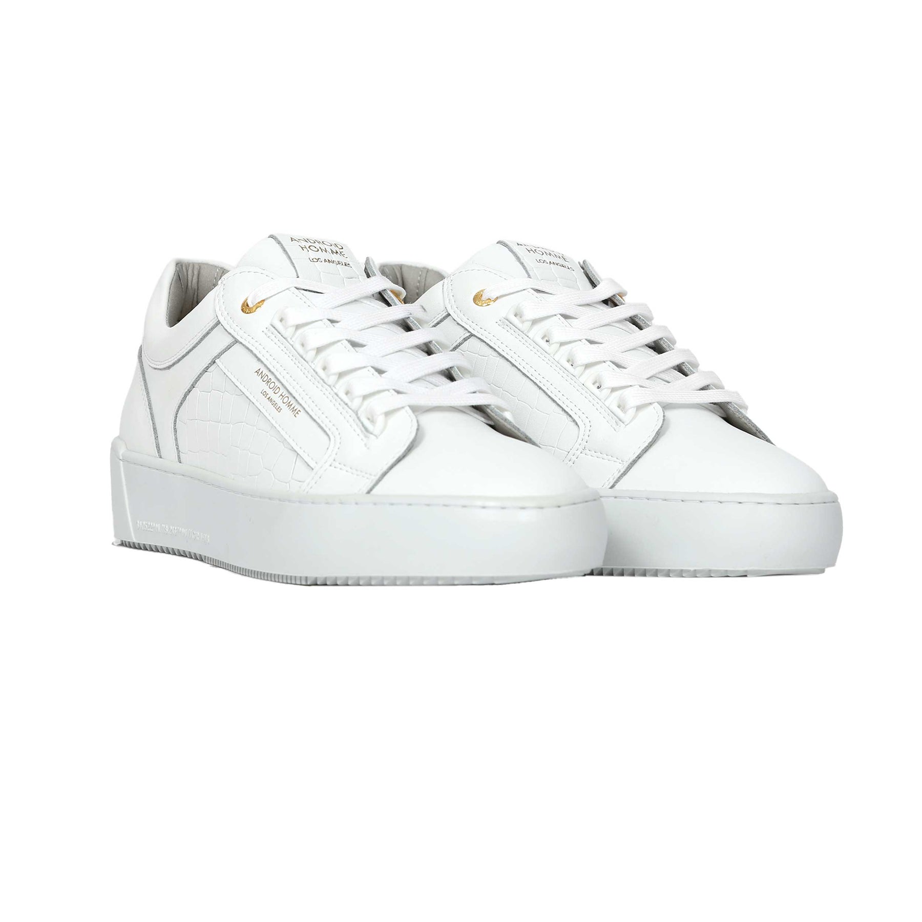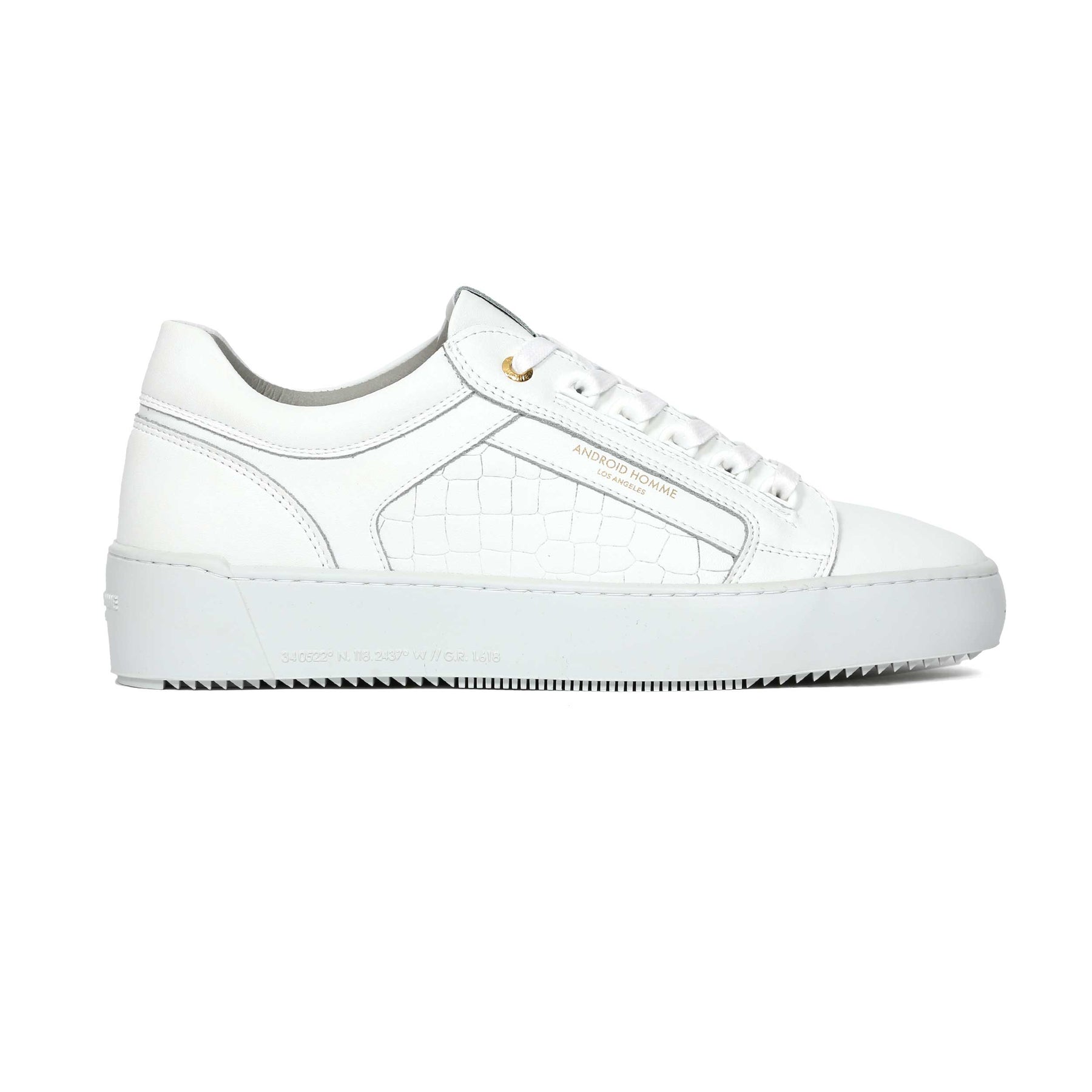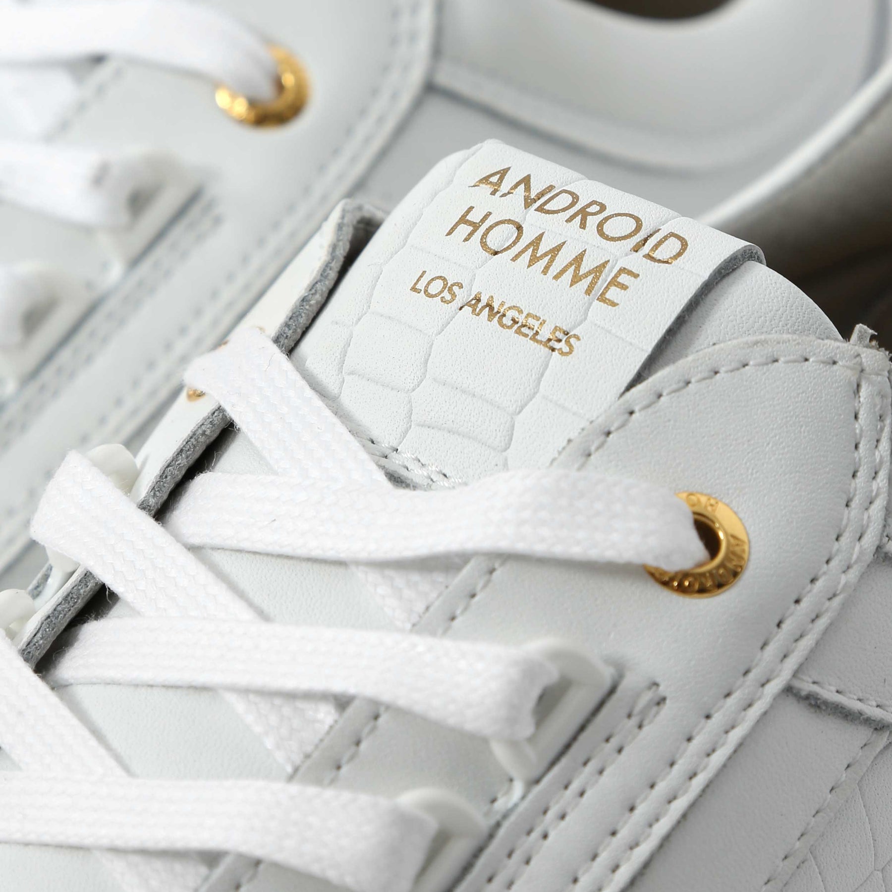 Android Homme Venice Trainer in White Caiman Croc. Luxury trainers by Android Homme. This Android Homme trainer arrives with leather upper panels. Tonal colour sole. Textured faux caiman croc skin panel design. Finished off with 7 hole eyelets and D-rings. Android Homme logo tab to the tongue and printed logo to the side panel.