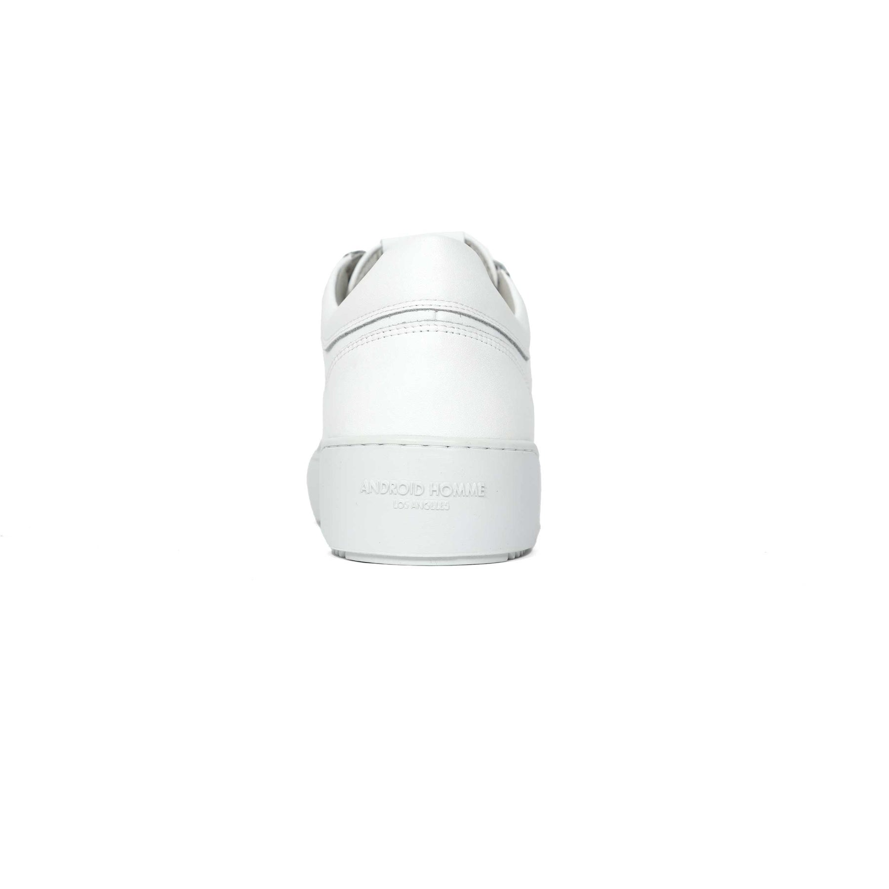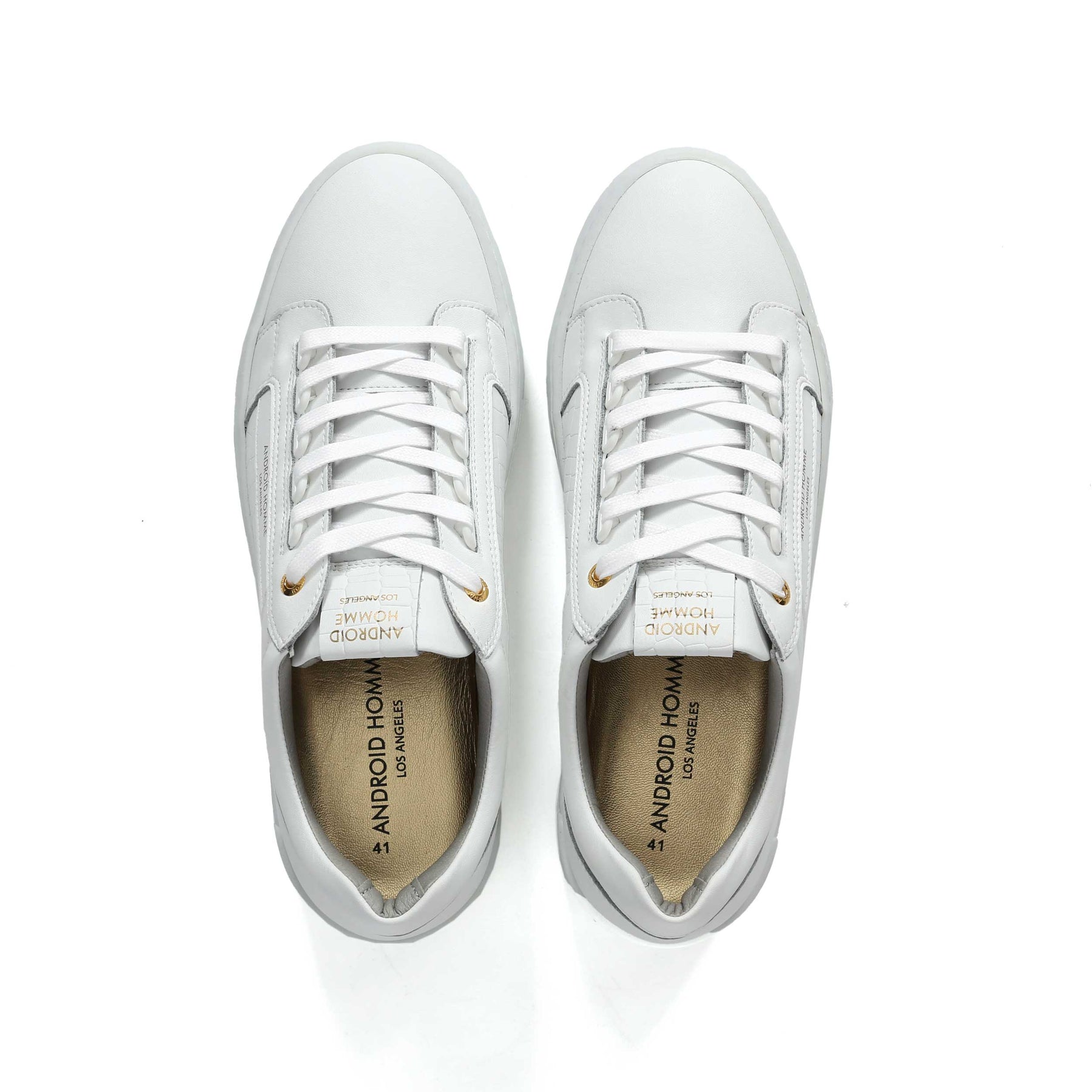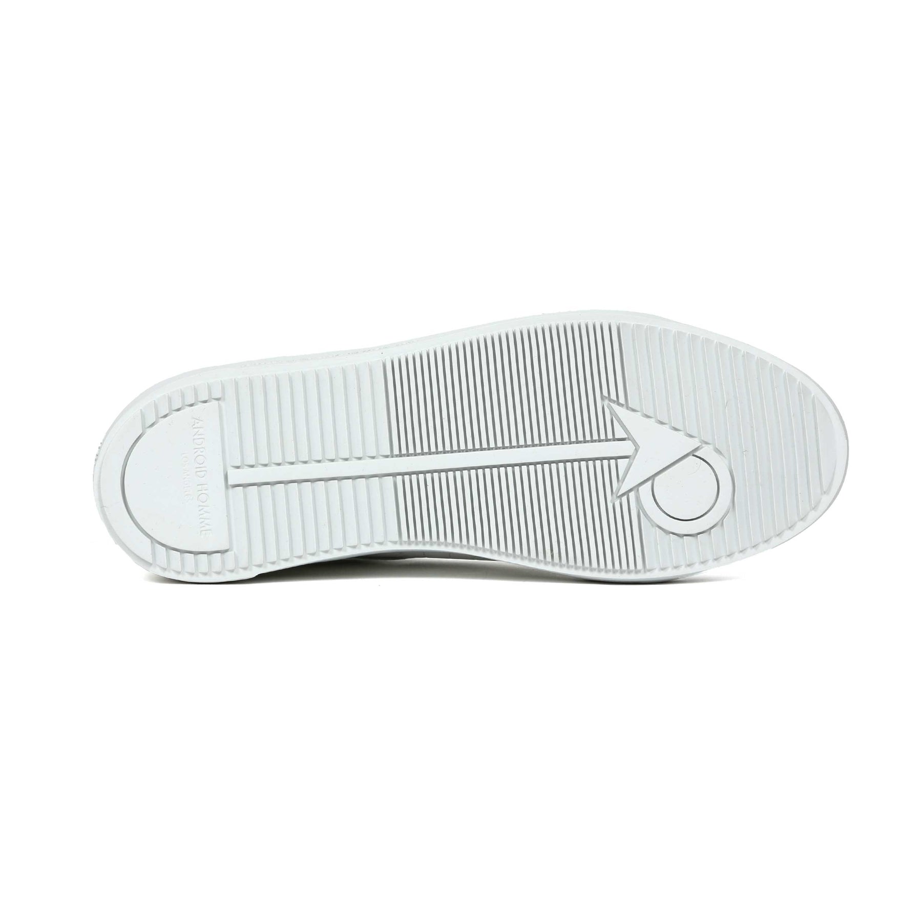 Android Homme Venice Trainer in White Caiman Croc. Luxury trainers by Android Homme. This Android Homme trainer arrives with leather upper panels. Tonal colour sole. Textured faux caiman croc skin panel design. Finished off with 7 hole eyelets and D-rings. Android Homme logo tab to the tongue and printed logo to the side panel.