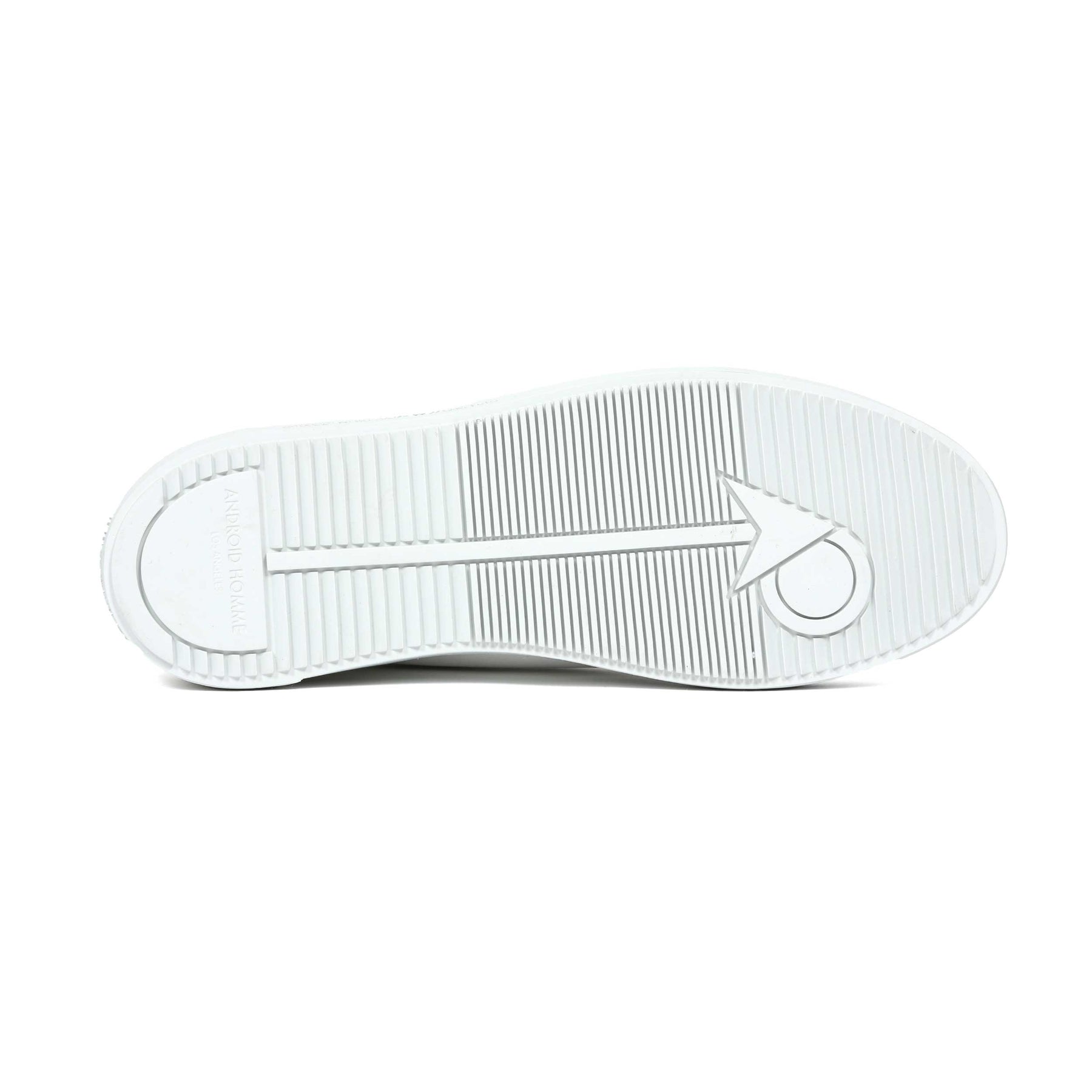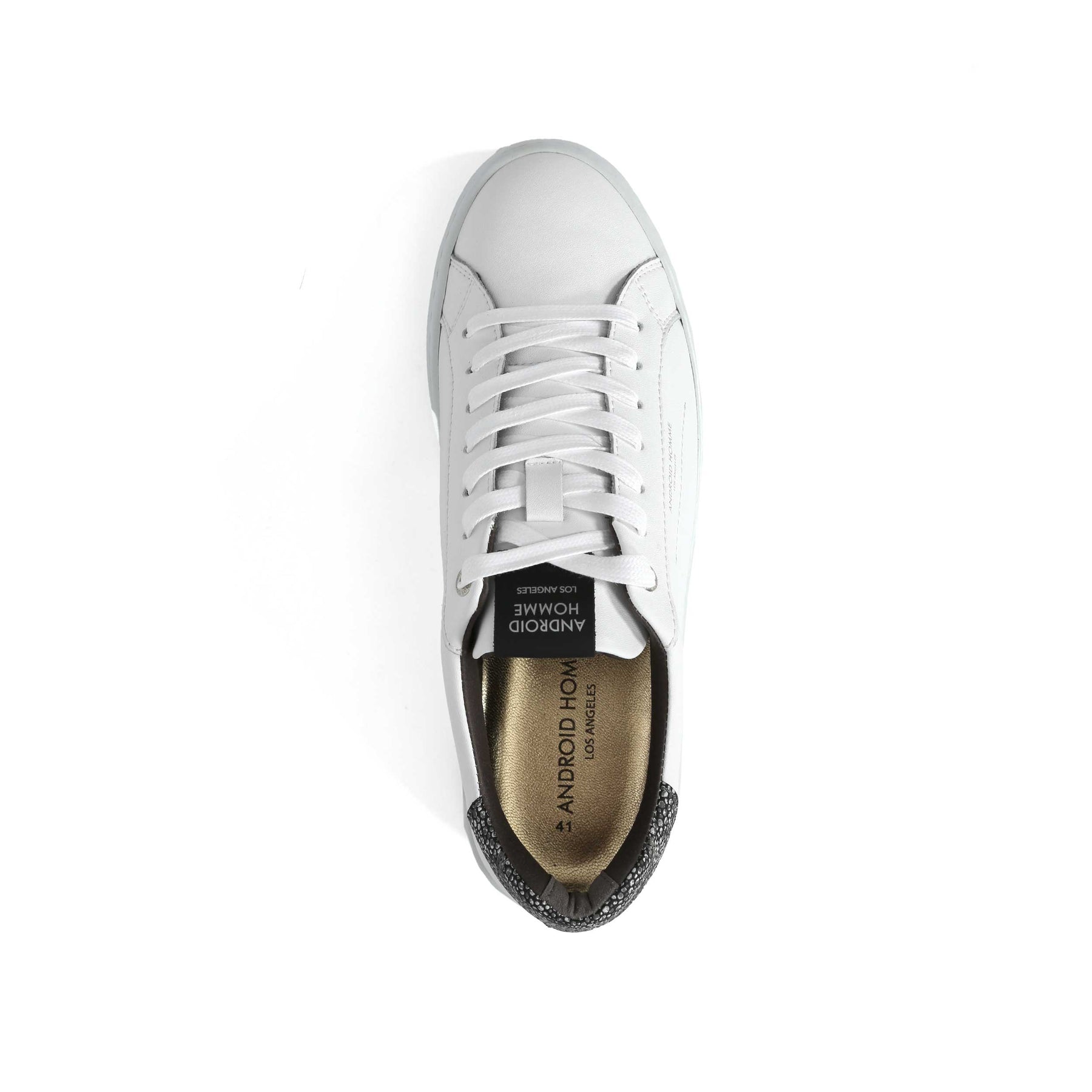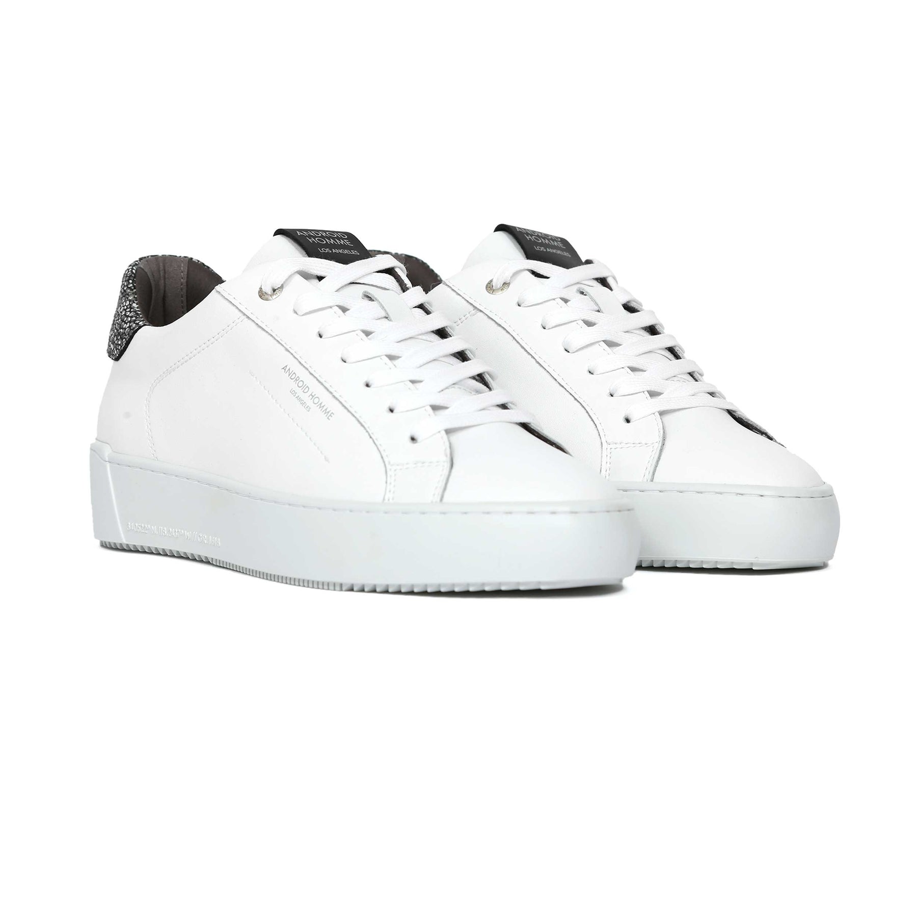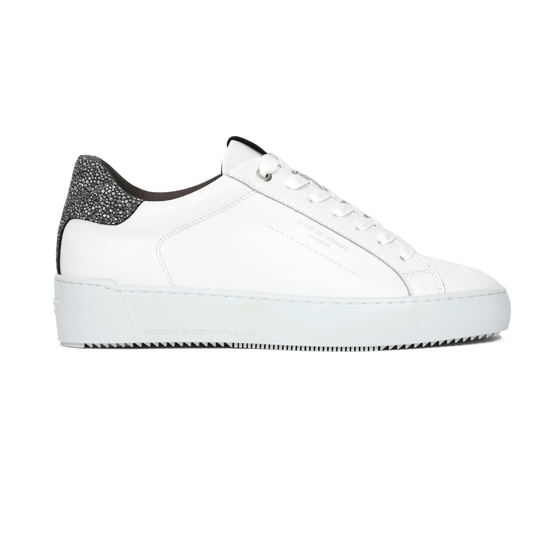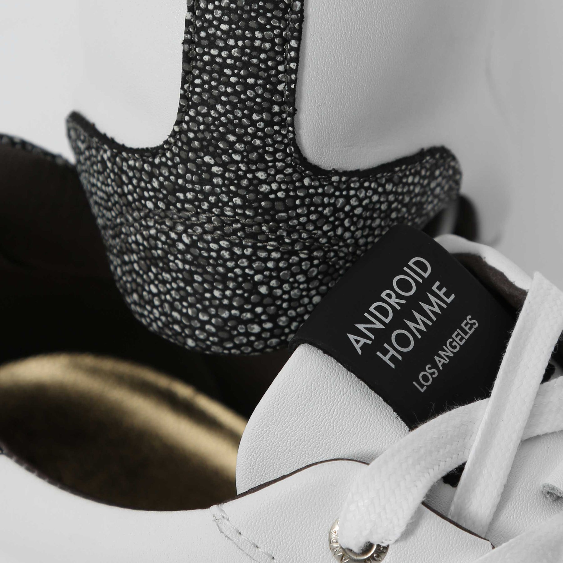 Android Homme Zuma Trainer in White Reflective Dot. Luxury trainers by Android Homme. This Android Homme trainer arrives with leather upper panels. Reflective caviar design to the heel panel. Plain design trainer with stitch detailing. Finished off with 7 hole eyelets. Android Homme logo tab to the tongue and printed logo to the side panel.