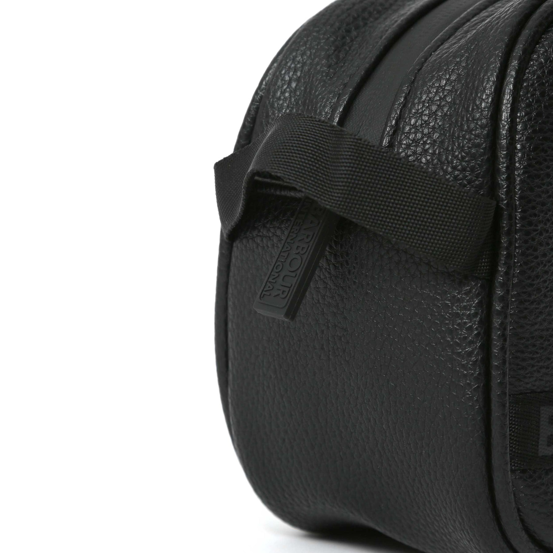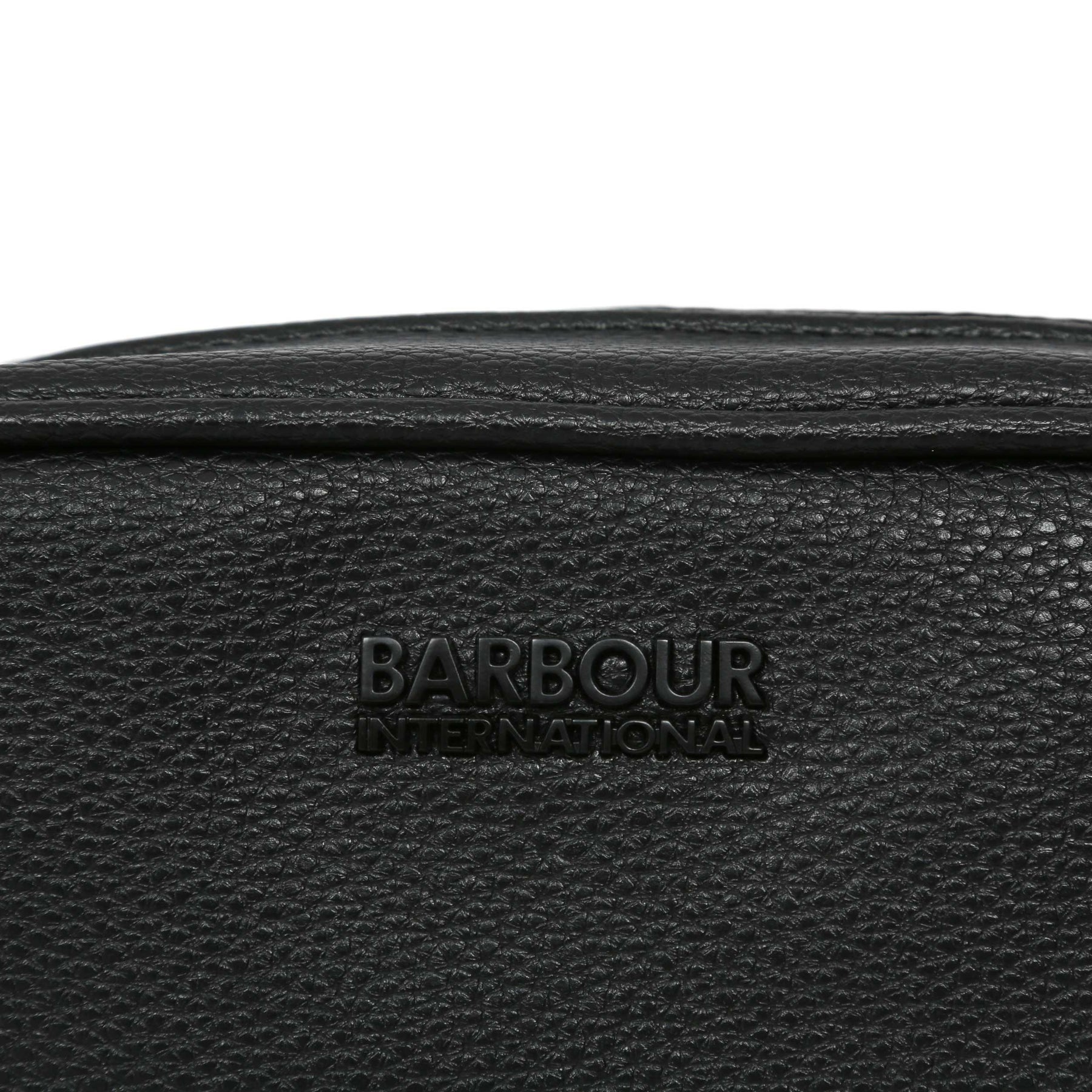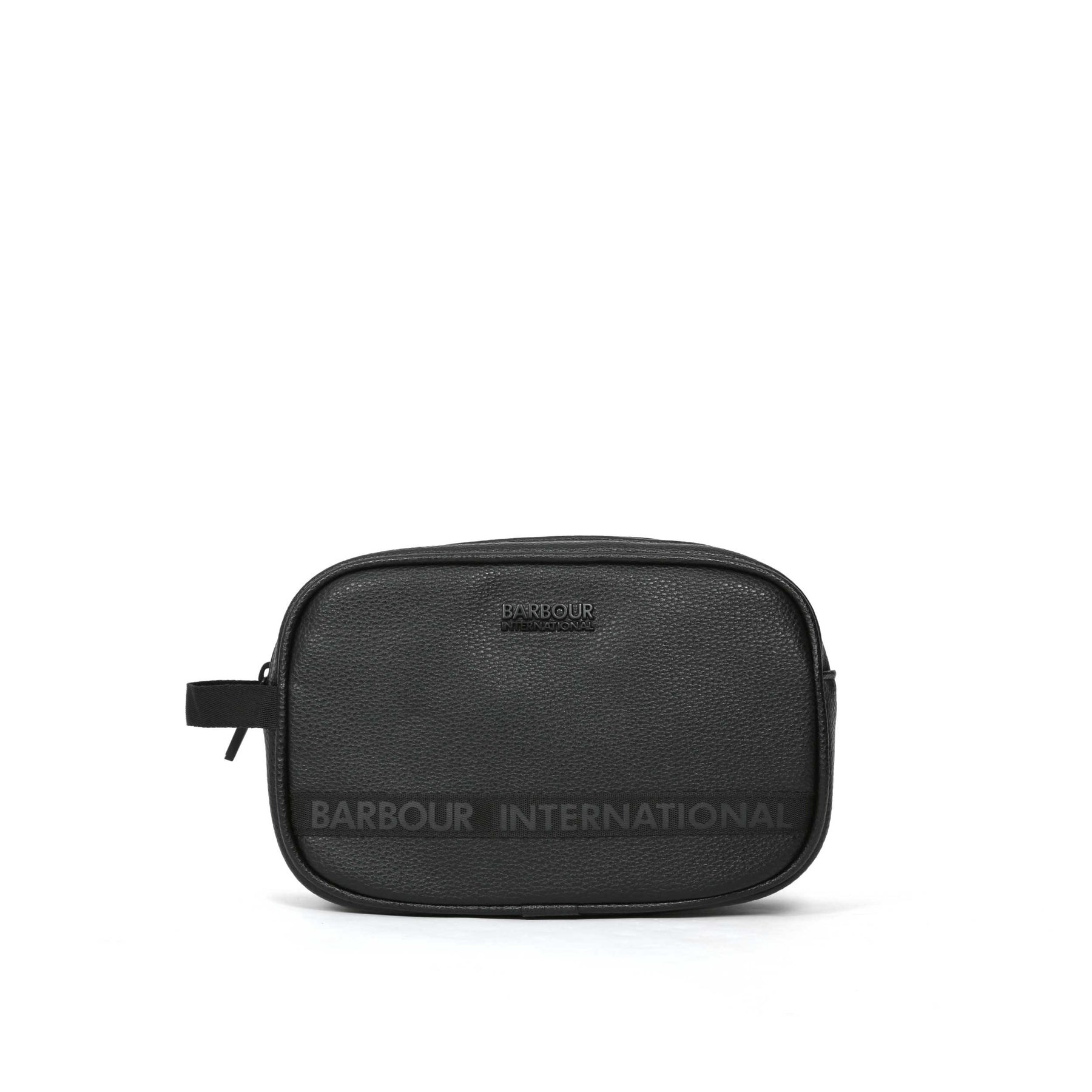 Barbour Blackwall Washbag in Black. This washbag has a zip around fastening and a carry handle to the side of the bag. Slip pocket to the inside of the bag. Textured faux PU leather with Barbour branding on the front of the bag.