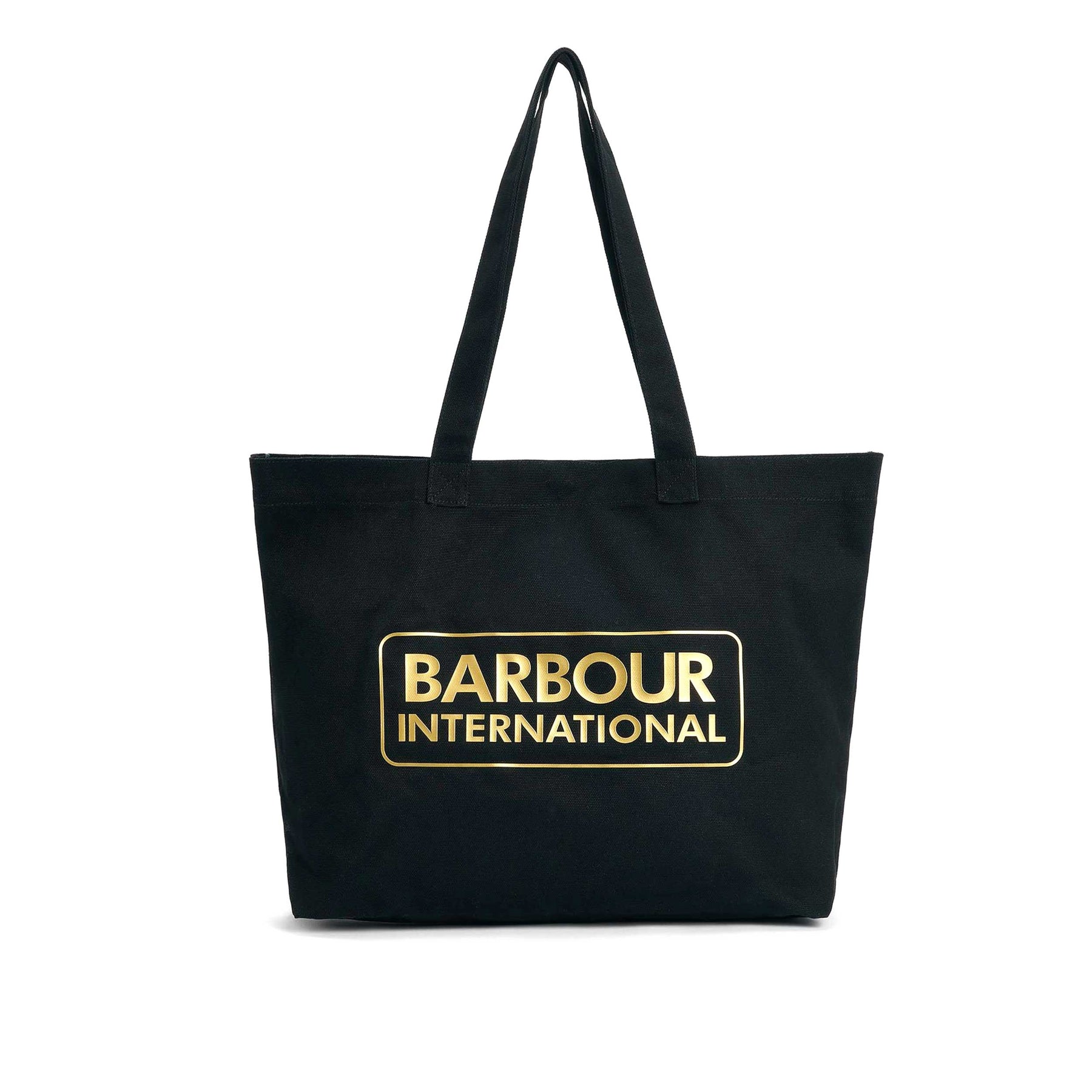 Barbour Essential Ladies Tote Bag in Black. The Essential Tote Bag is a stylish and sustainable alternative to single-use plastic bags. Crafted from lightweight canvas, it effortlessly folds down for easy storage. Designed for practicality, it features a concealed snap closure to keep your essentials secure, while an inner zipped pocket provides a safe spot for valuables and smaller items. Perfect for everyday use.