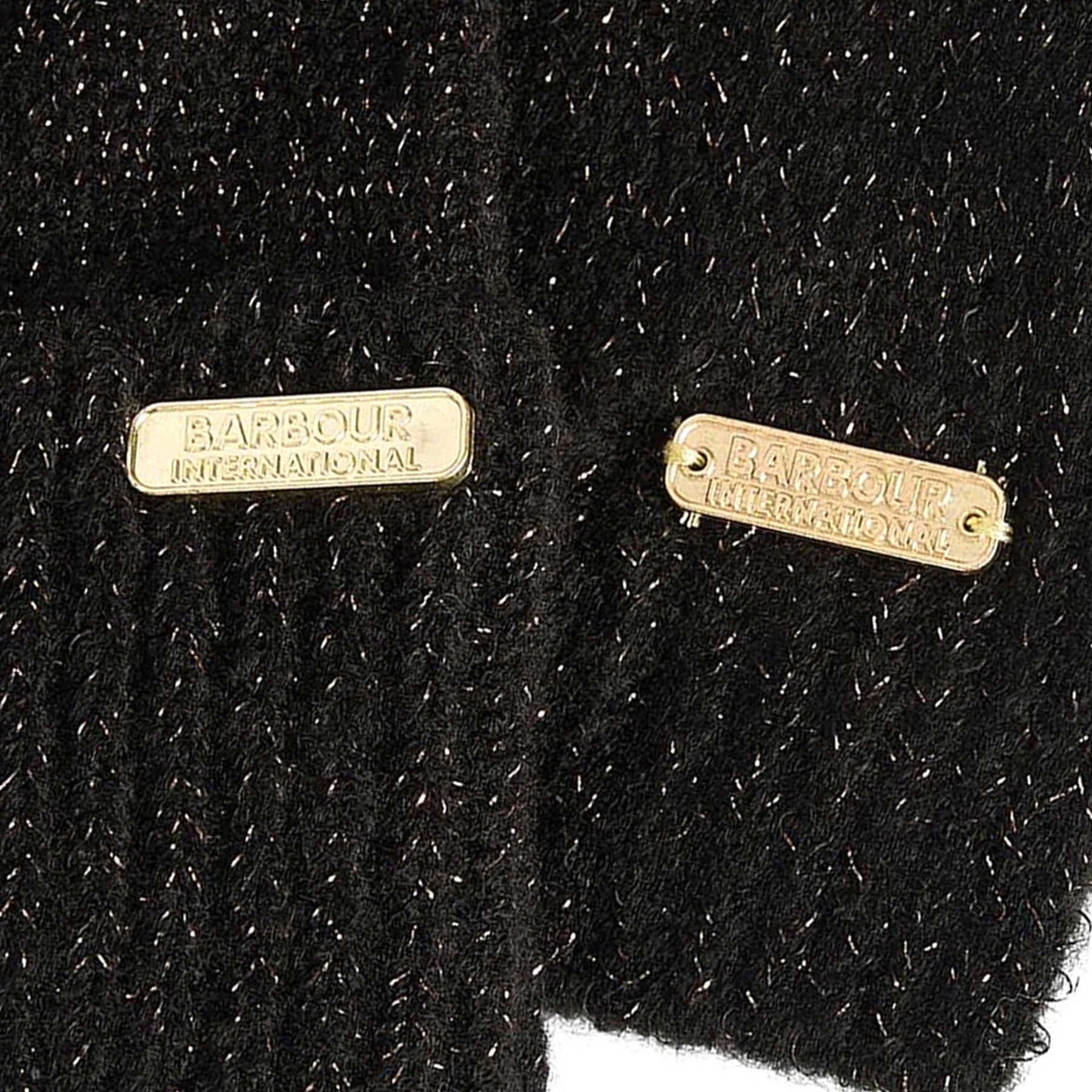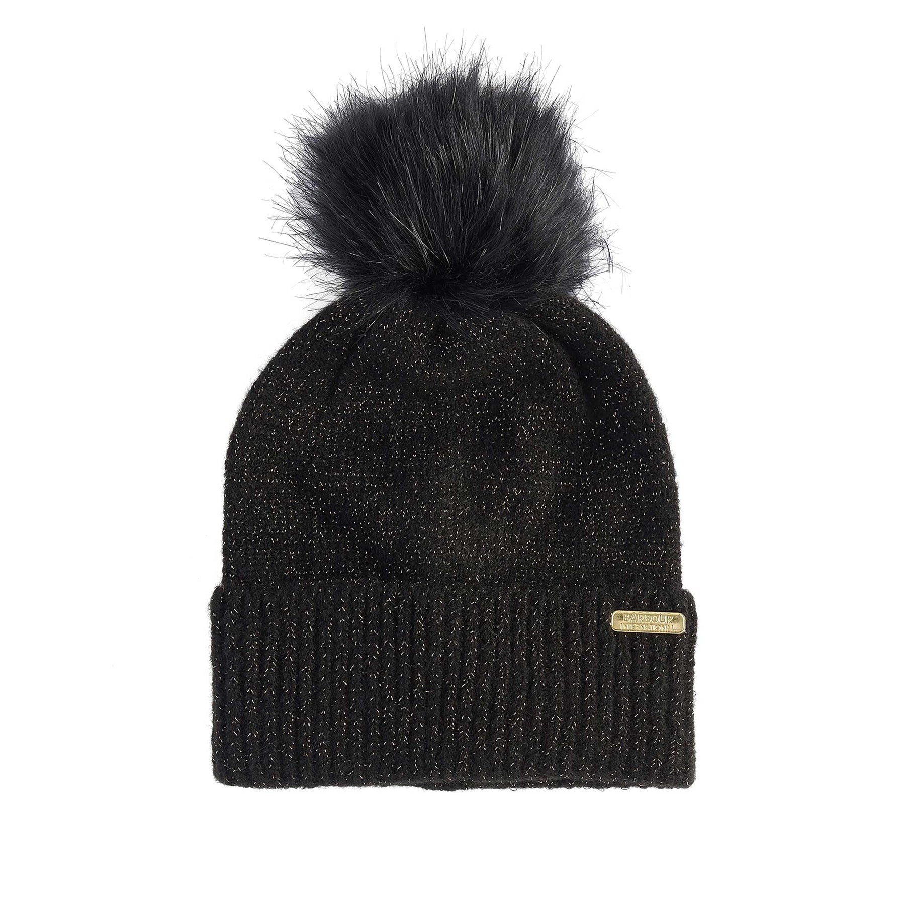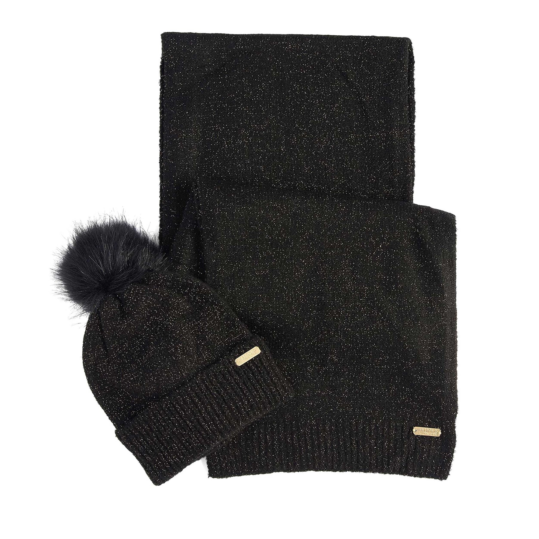 Barbour Sparkle Ladies Beanie & Scarf Gift Set in Black. Ladies gift set by Barbour. The box set consists of a knitted beanie hat and scarf. Both items are detailed with a metallic sparkle effect. Metal Barbour logo badge to both the hat and scarf. Tonal colour faux fur pom to the beanie hat.