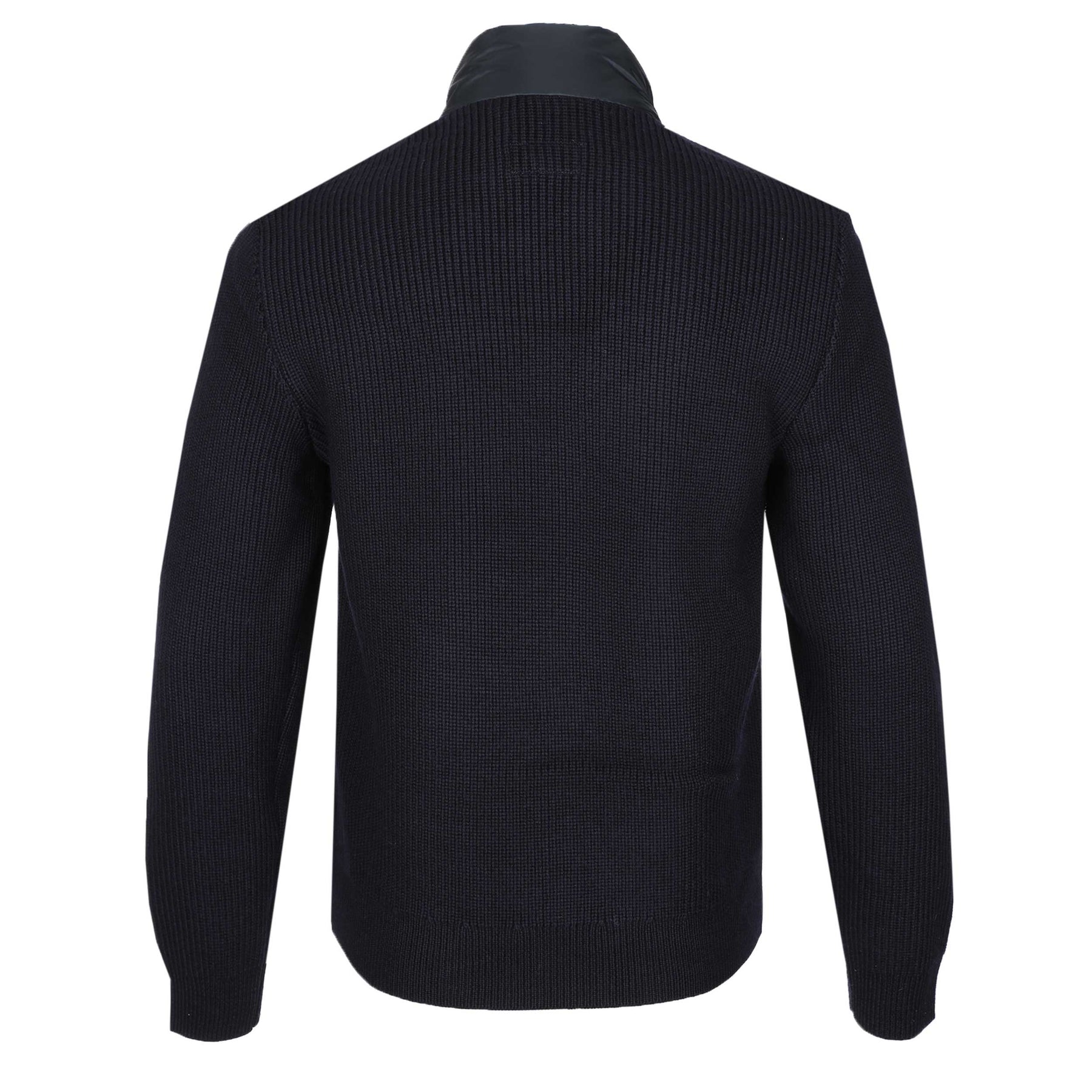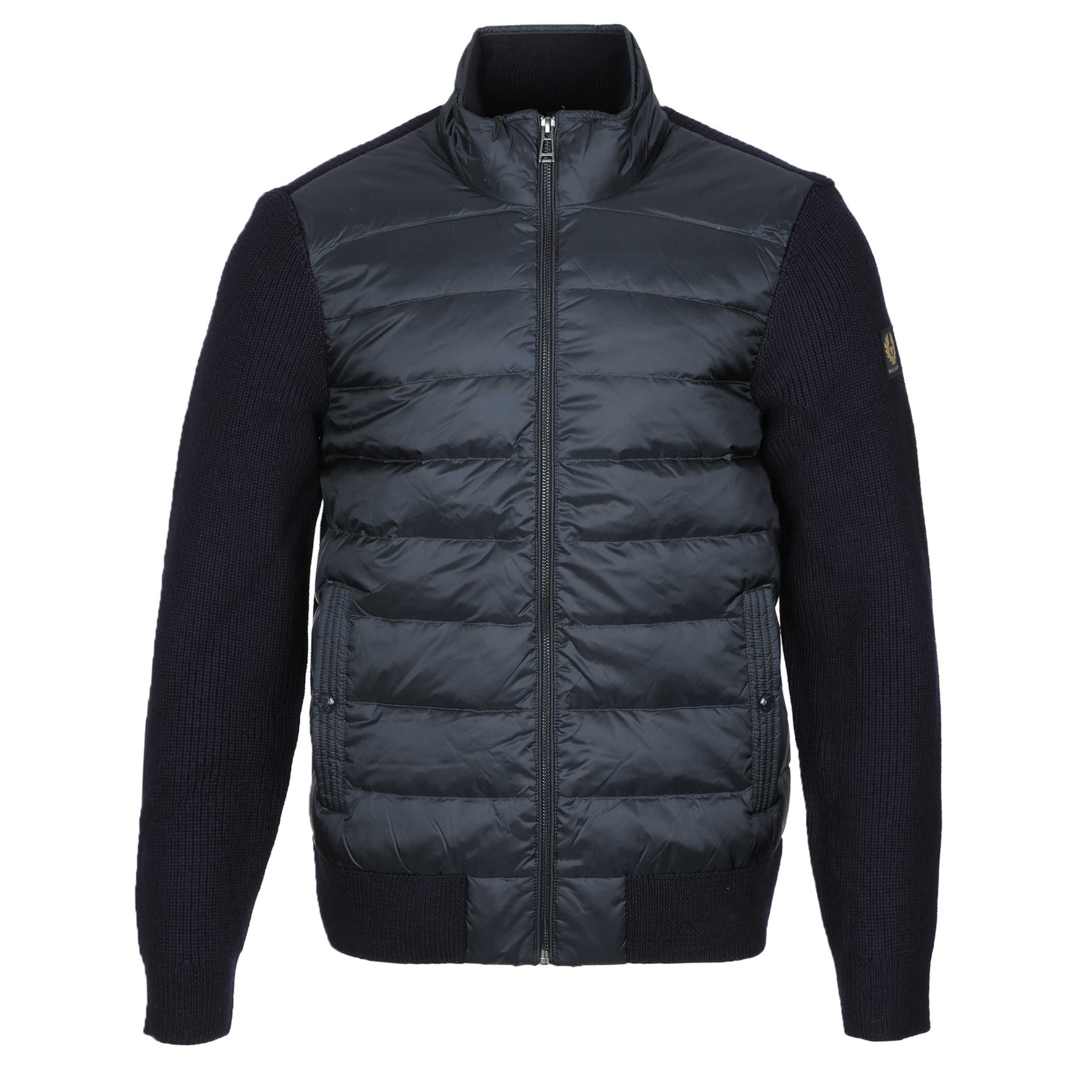 Belstaff Circuiteer Cardigan in Dark Ink. A zip up cardigan by Belstaff. A versatile piece featuring cardigan style sleeves with a quilted front panel design. Featuring a full zip fastening and the Belstaff logo on the left sleeve. Knitted sleeves and back panel. Press stud fastening pockets to the front. Belstaff logo badge to the sleeve.