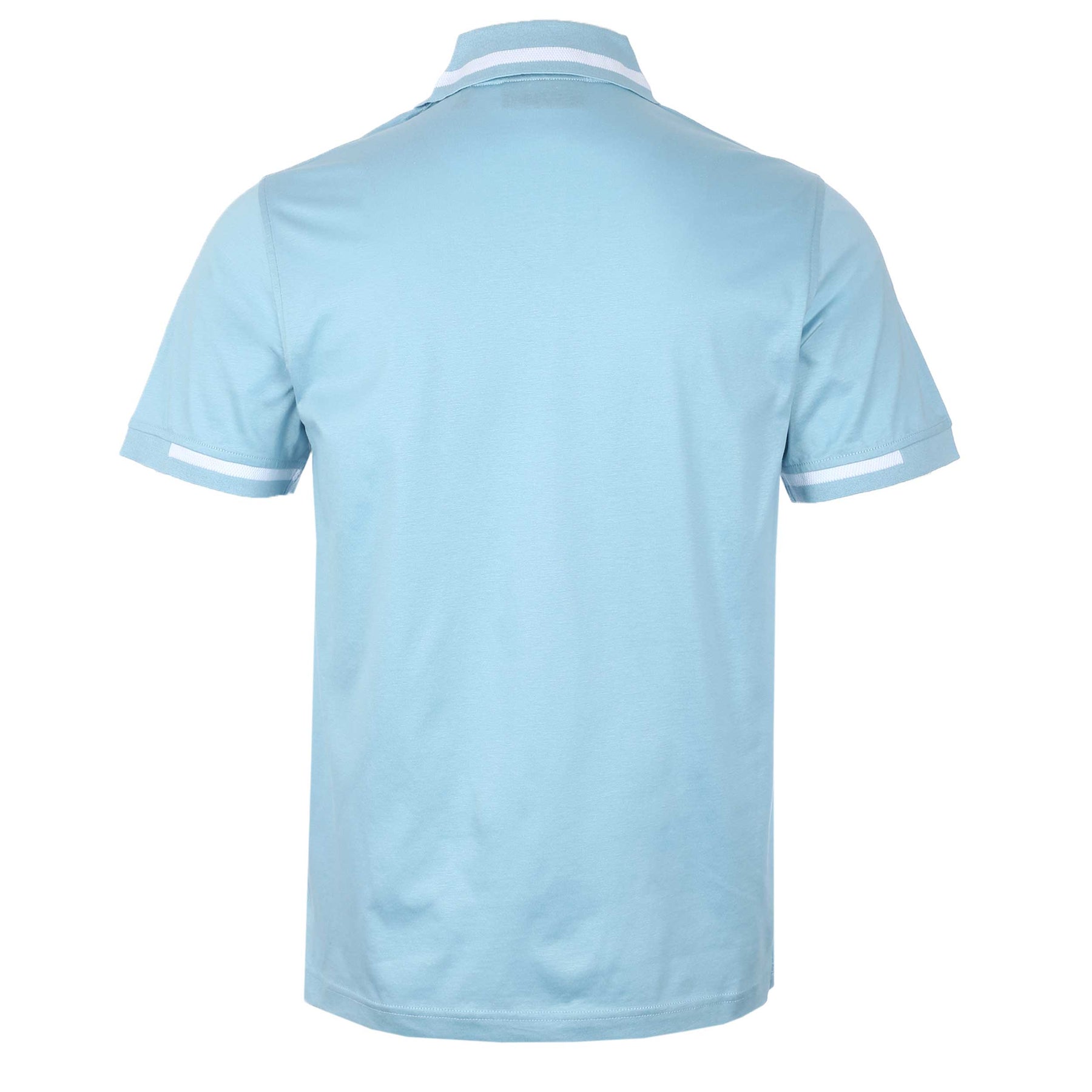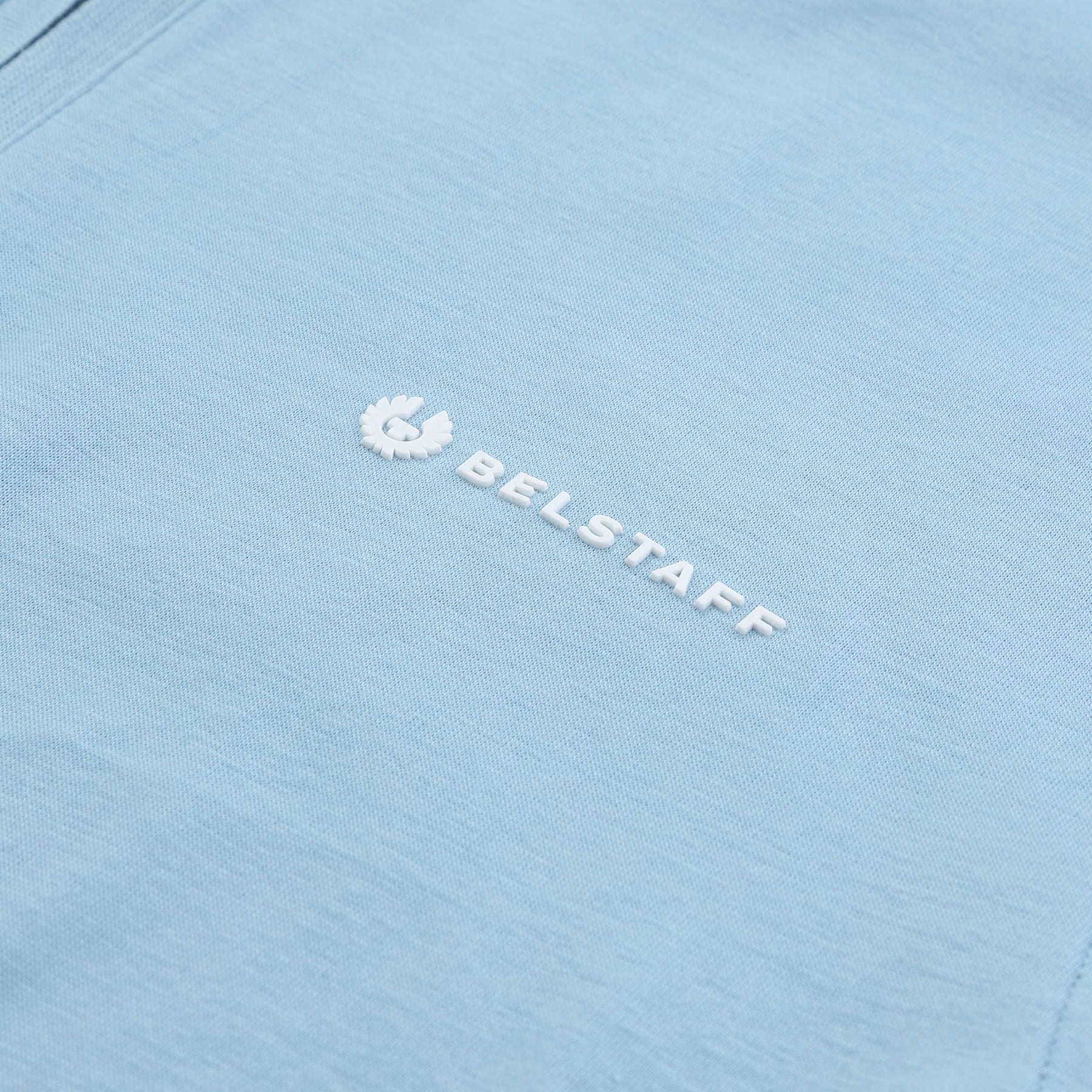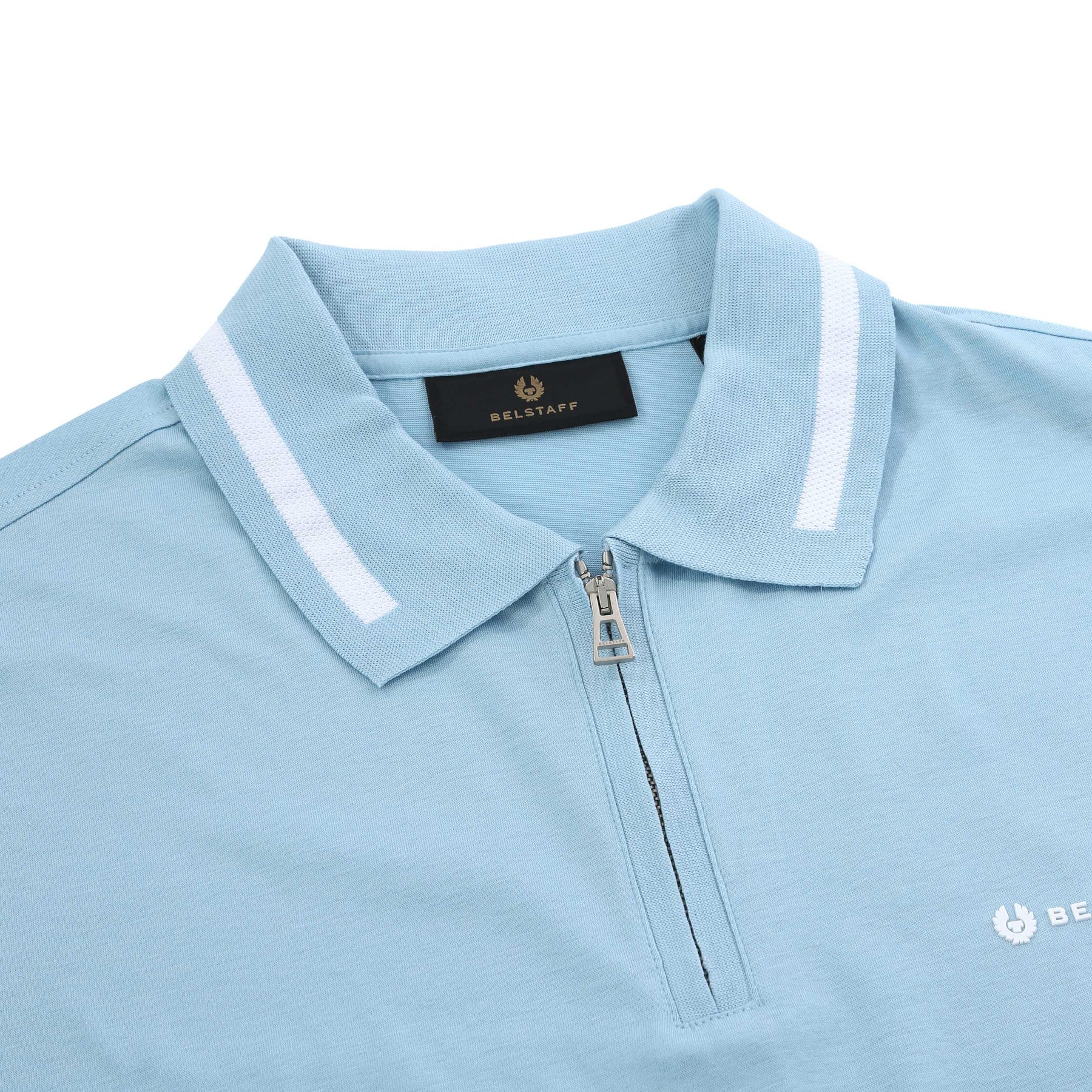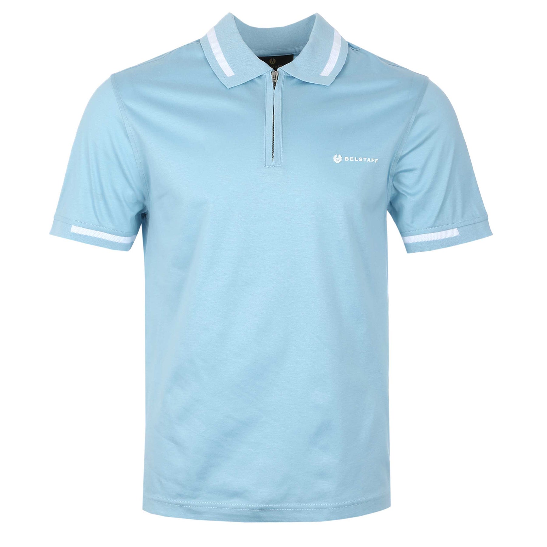 Belstaff Graph Zip Polo Shirt in Skyline Blue. A classic polo shirt by Belstaff. Featuring a zip fastening placket with the a rubber Belstaff logo on the chest. Contrasting colour trims to the collar and cuffs. Perfect for everyday wear.