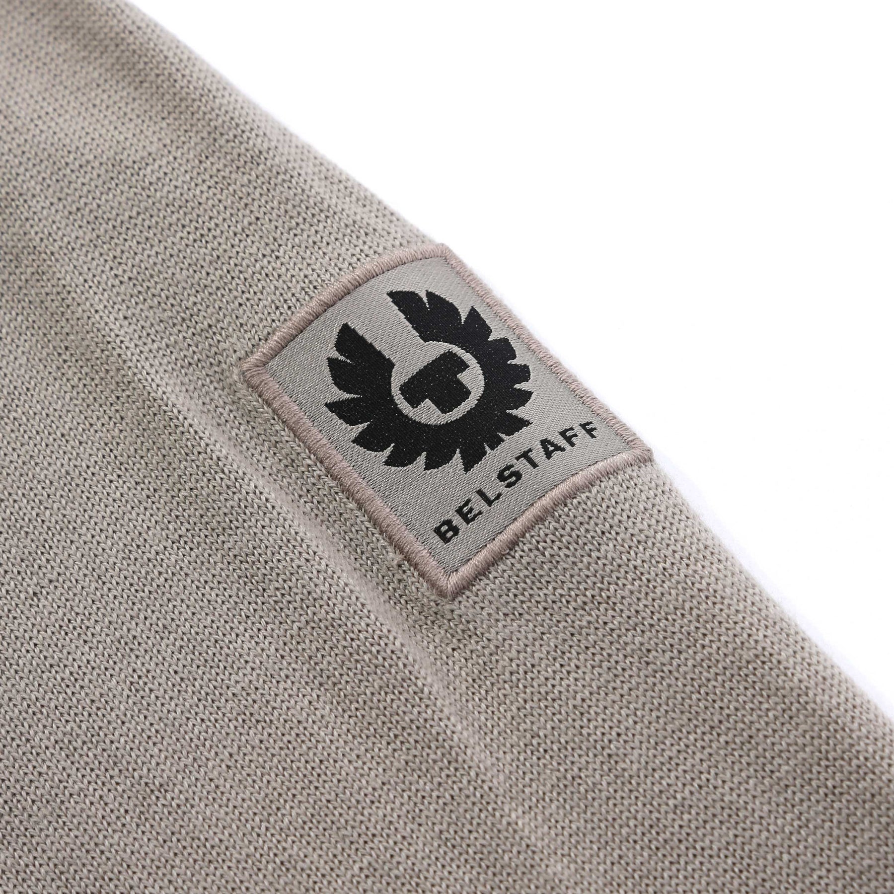 Belstaff Kelby Zip Cardigan in Dark Sand. A zip up cardigan by Belstaff. A versatile piece featuring cardigan style sleeves with a quilted panel design to the front. Featuring a full zip fastening and the Belstaff logo on the left sleeve. Made in Italy crafted from 100% Wool.