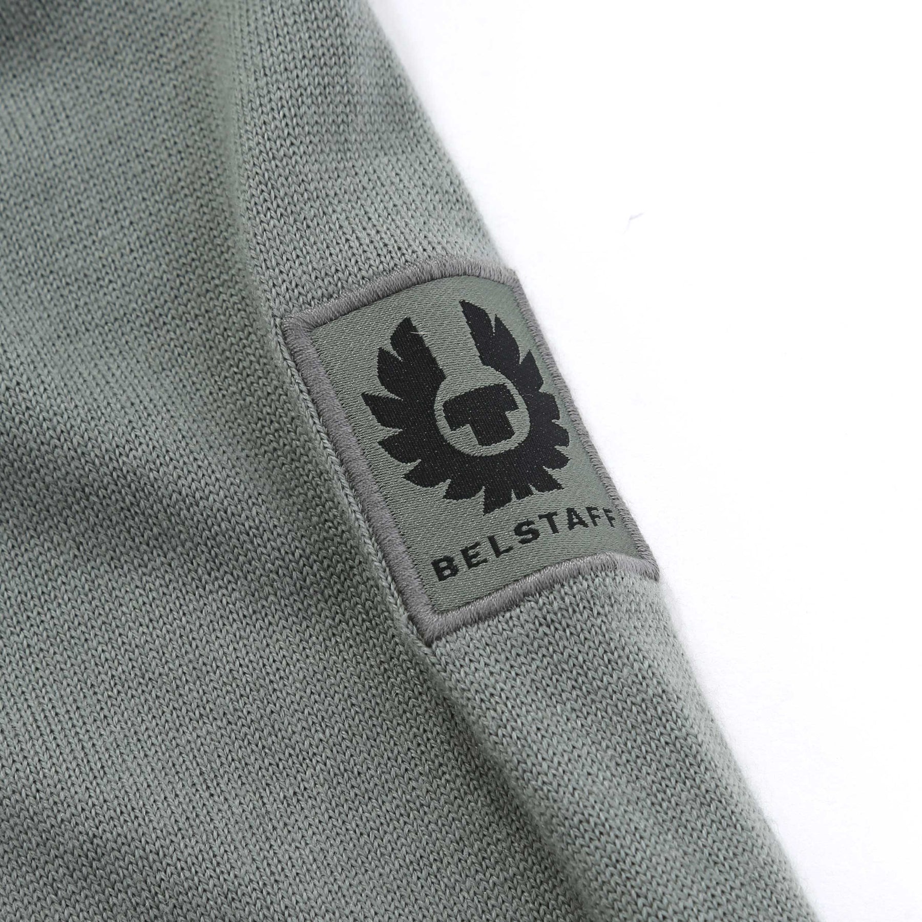 Belstaff Kelby Zip Cardigan in Sage Green. A zip up cardigan by Belstaff. A versatile piece featuring cardigan style sleeves with a quilted panel design on the shoulders and collar. Featuring a full zip fastening and the Belstaff logo on the left sleeve. Made in Italy crafted from 100% Wool.
