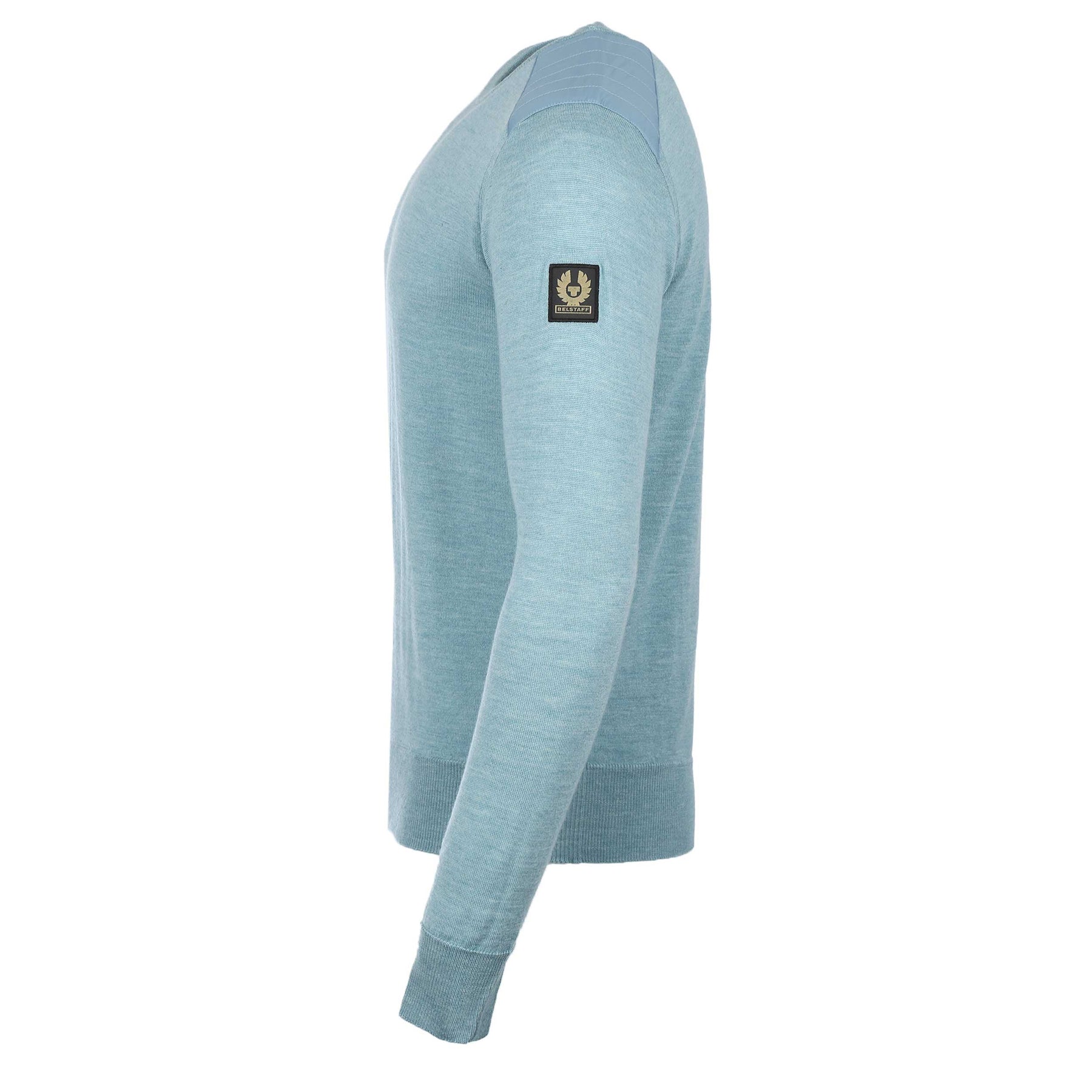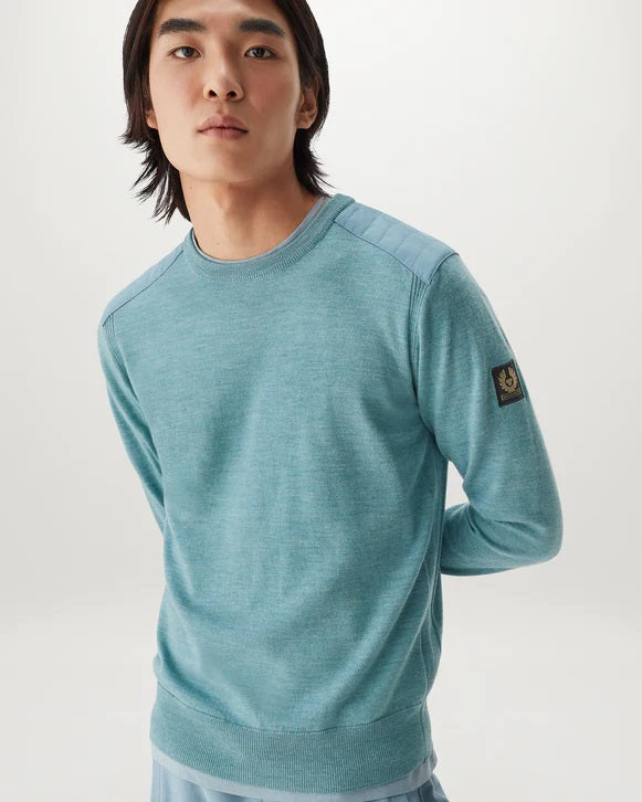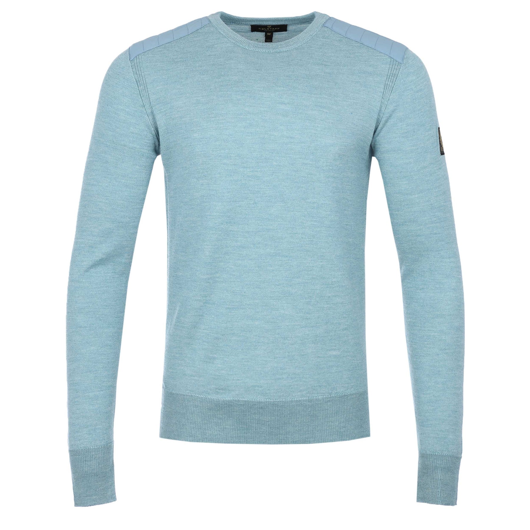 Belstaff Kerrigan Knitwear in Arctic Blue. A plain design crew neck sweat top by Belstaff. Featuring long sleeves and ribbed hems and cuffs. With padded shoulder detailing with the signature Belstaff logo on the sleeve. Made in Italy from 100% wool.