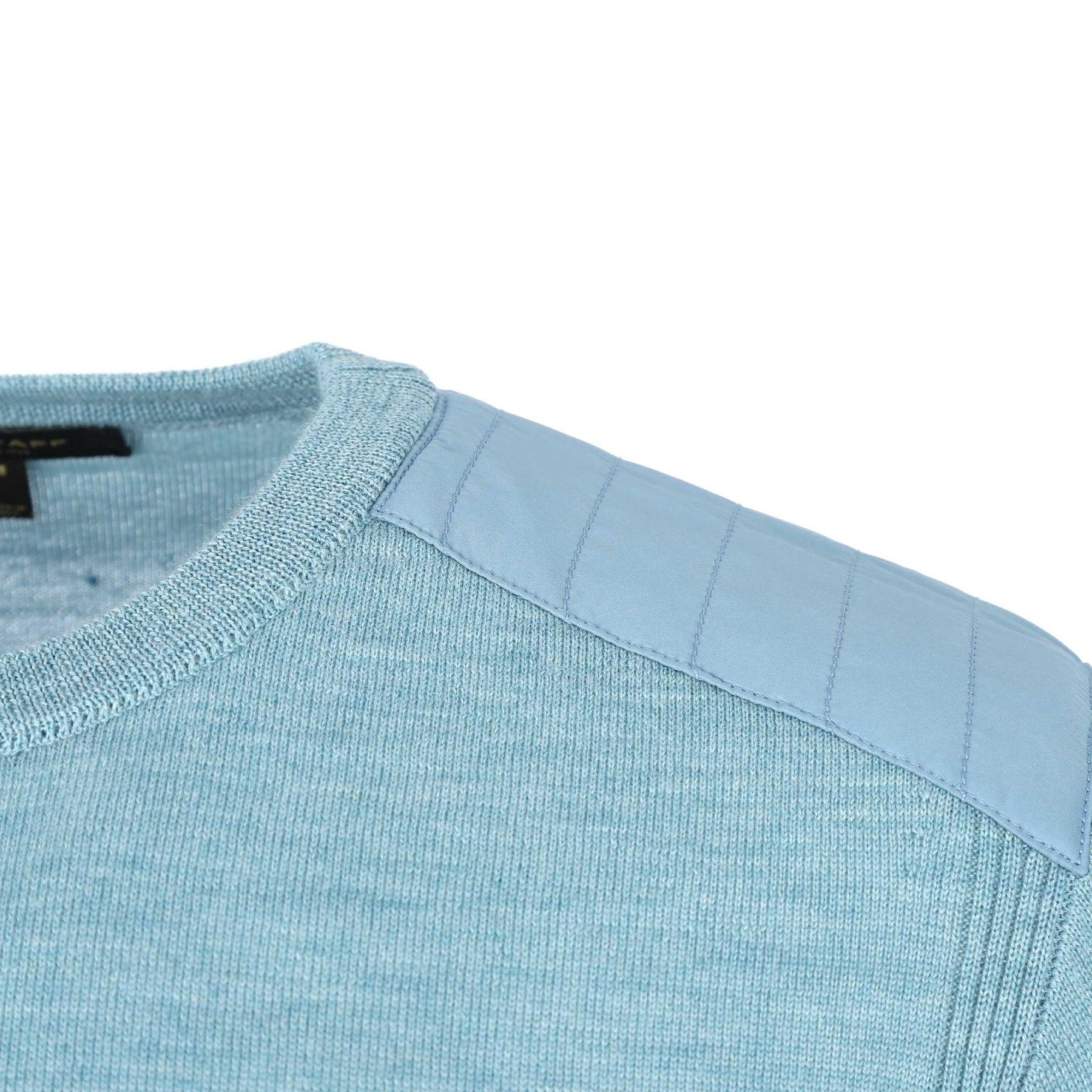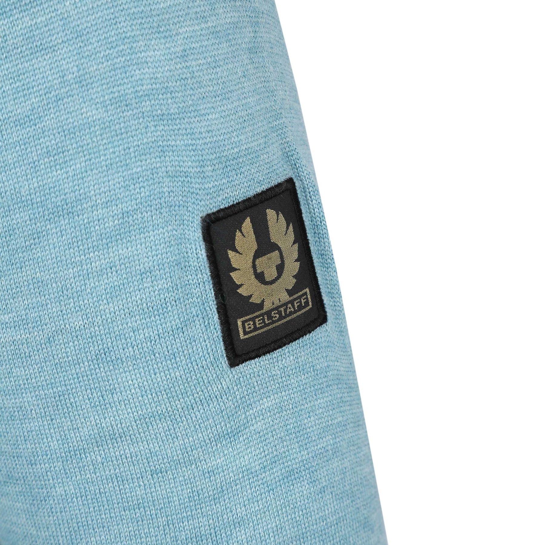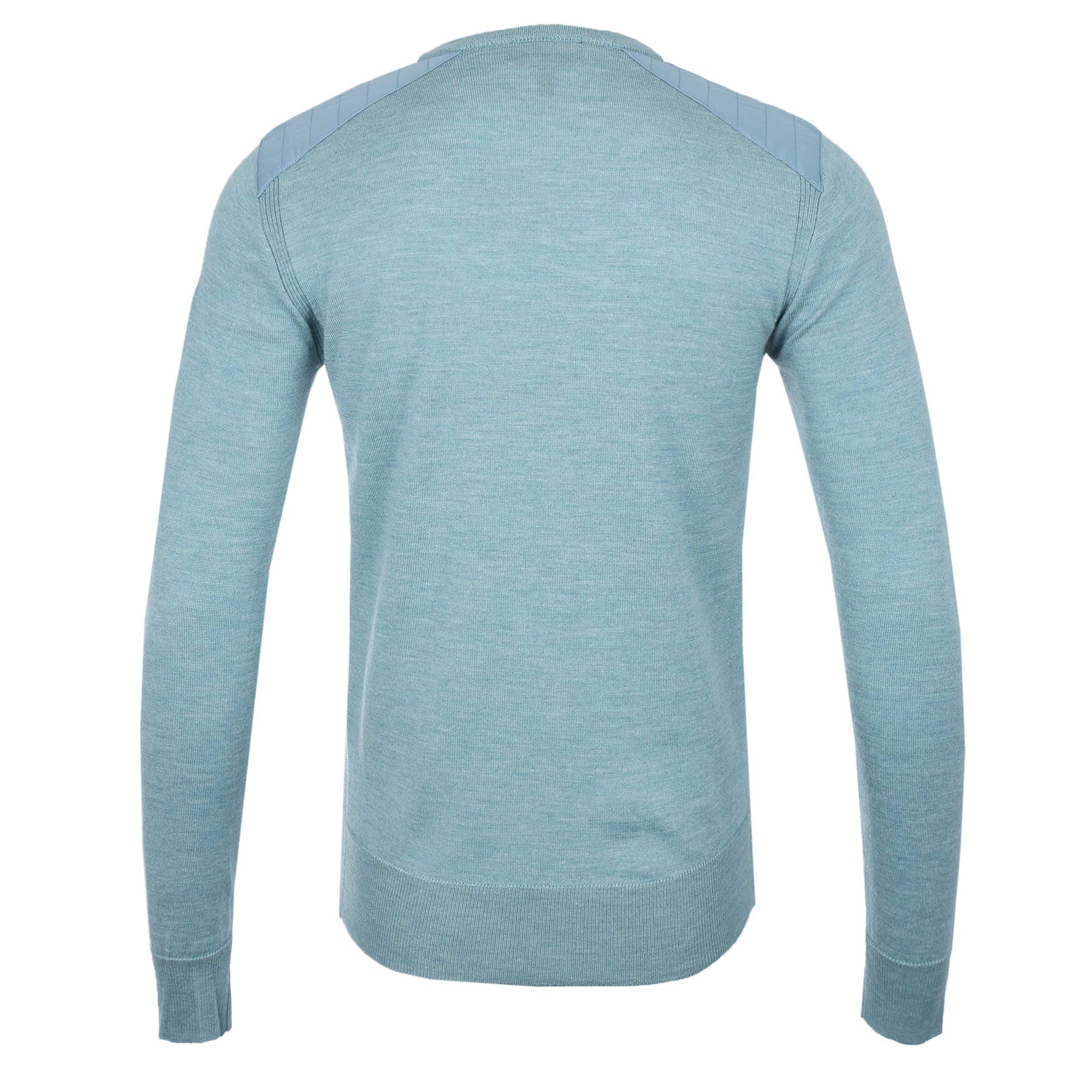 Belstaff Kerrigan Knitwear in Arctic Blue. A plain design crew neck sweat top by Belstaff. Featuring long sleeves and ribbed hems and cuffs. With padded shoulder detailing with the signature Belstaff logo on the sleeve. Made in Italy from 100% wool.