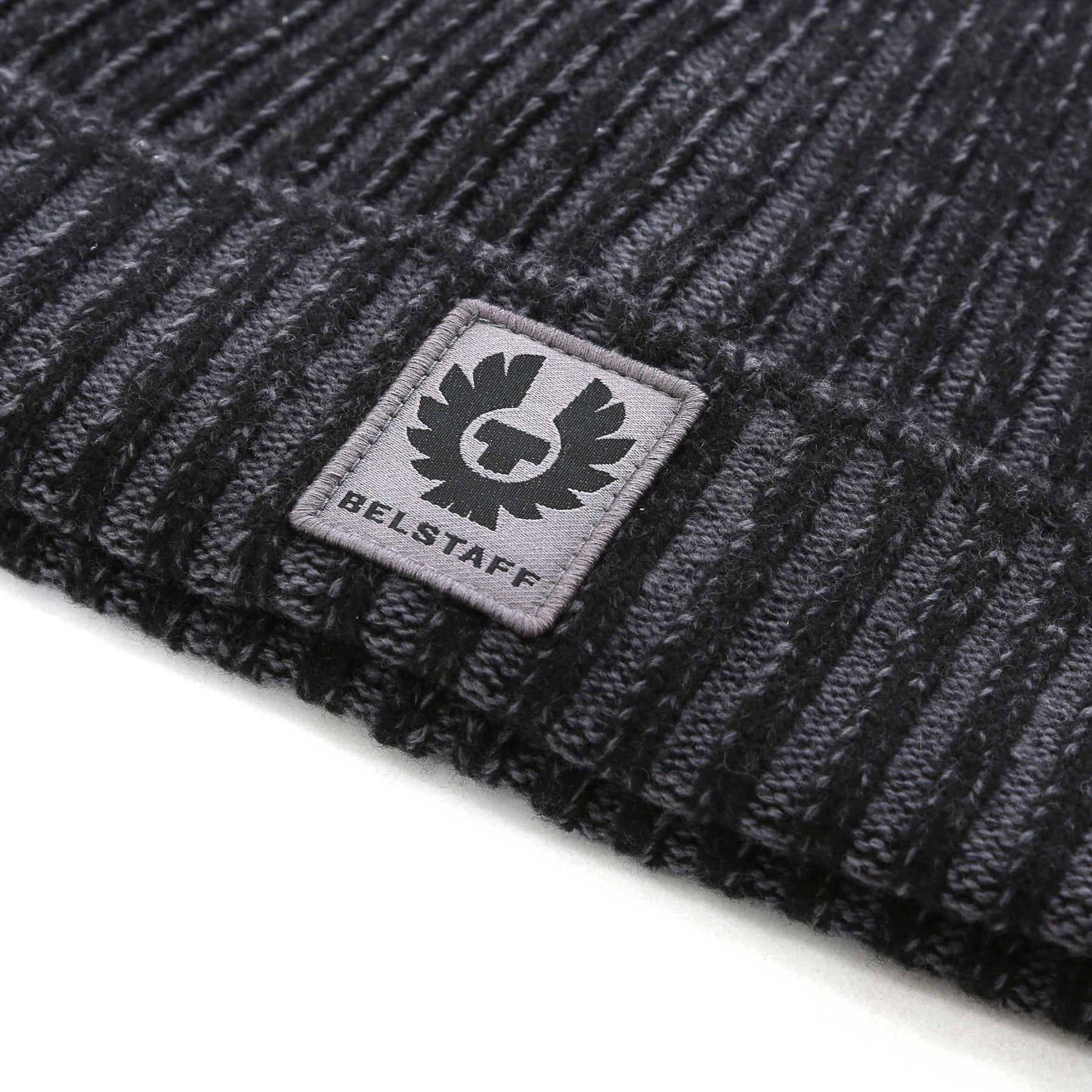 Belstaff Plated Watch Beanie Hat in Black & Tornado Grey. A classic beanie style hat by Belstaff. This hat is made using soft lambswool which will keep your head warm this Winter. With a ribbed design and Belstaff logo badge on the front of the hat.