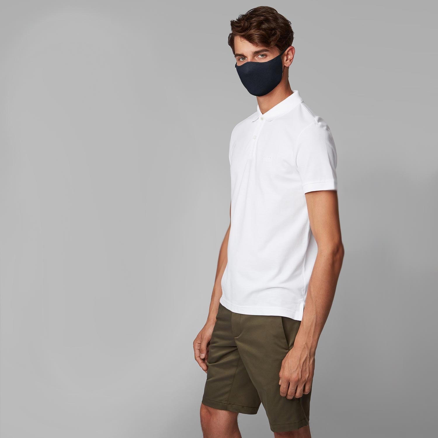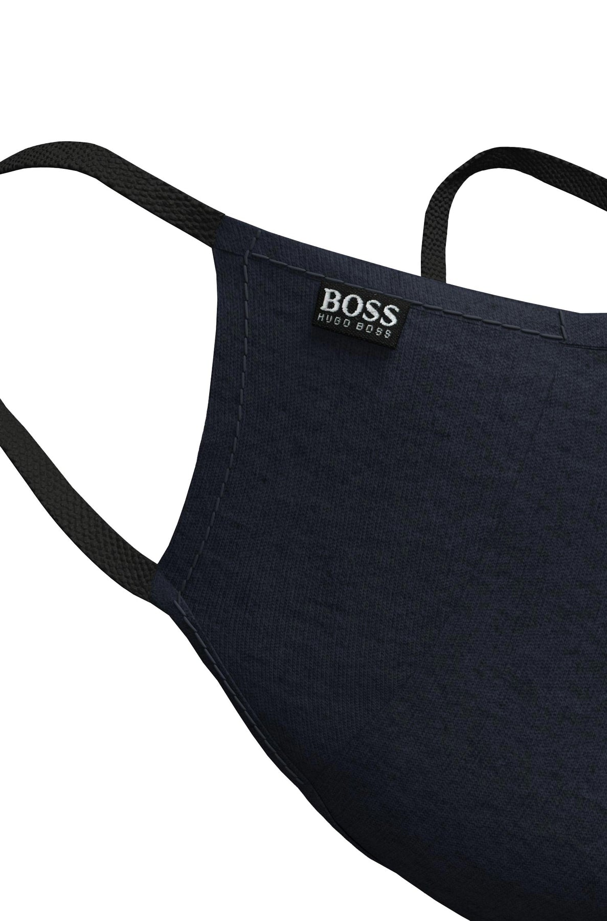 BOSS 3-Pack Face Mask in Black, Navy & Grey. 3 contemporary face masks constructed from a soft and breathable fabric. One black, one navy and one grey mask with a Hugo Boss logo tab. This machine washable mask has a stretch cotton lining and elasticated loops.