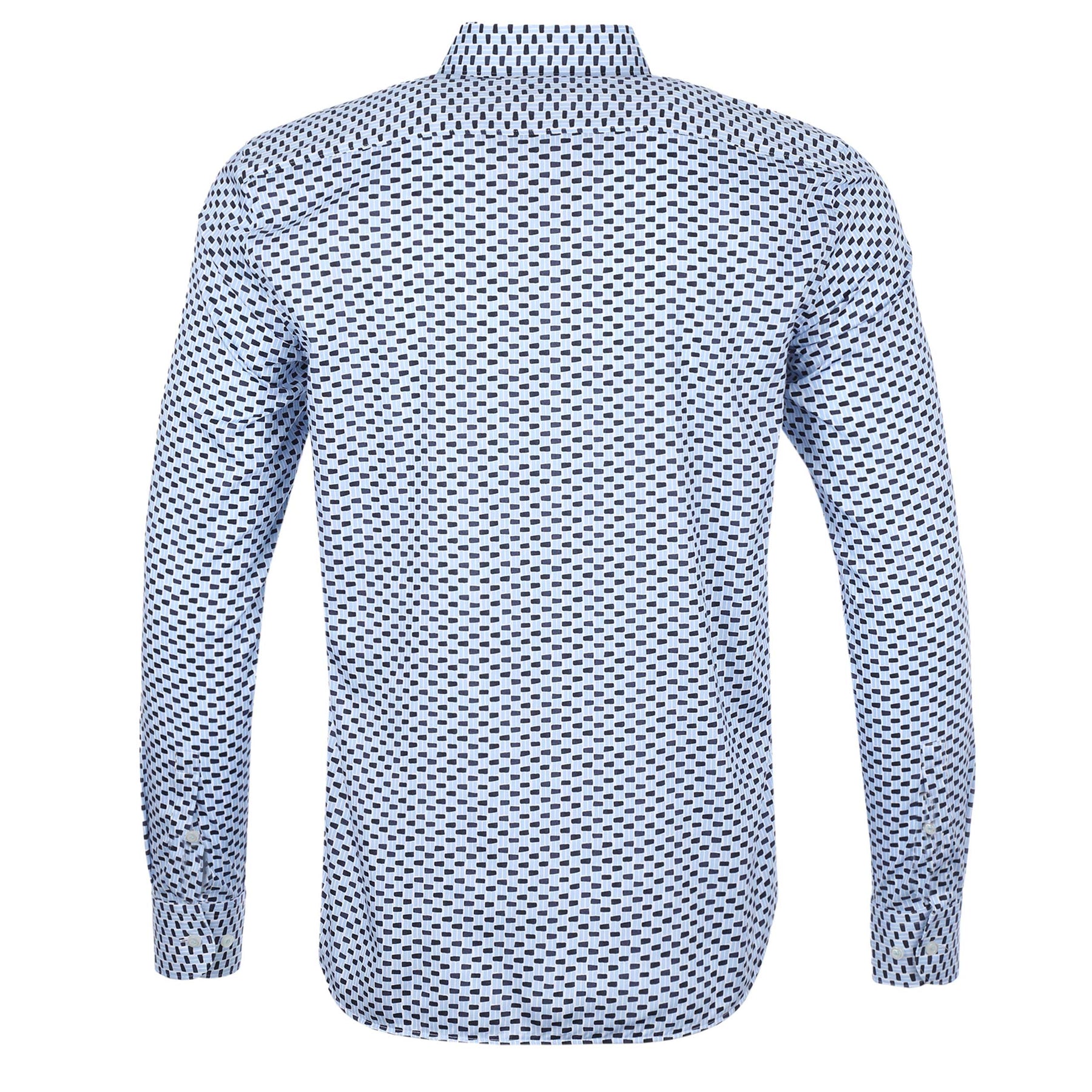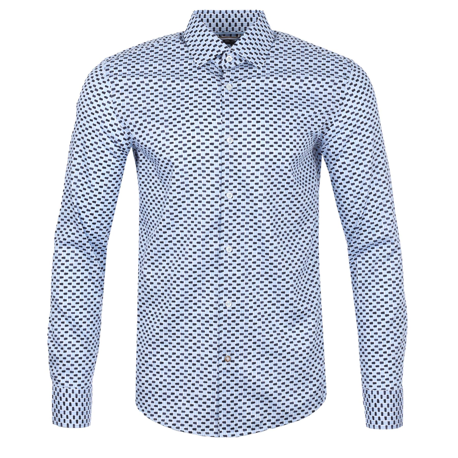 BOSS C HAL Kent Shirt in Sky Blue. A regular fit shirt by BOSS. Featuring a seasonal abstract print throughout the shirt, a full button placket and long sleeves. Crafted from a cotton blend for comfort and breathability.