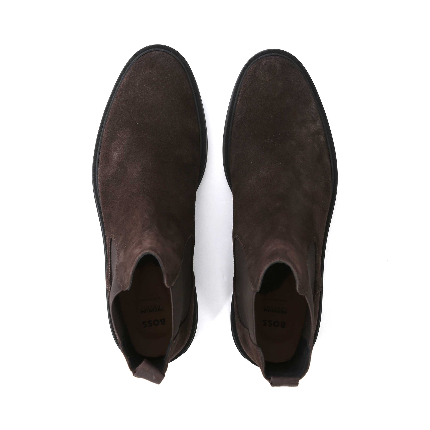 BOSS Calev Cheb sdfb Boot in Dark Brown. A classic chelsea boot by BOSS. These plain suede leather boots come with an elasticated, tonal branded side panels and a loop pull to the heel. Embossed BOSS logo to the topline. Ideal BOSS boot for those smart casual days. Team up with a pair of BOSS jeans.