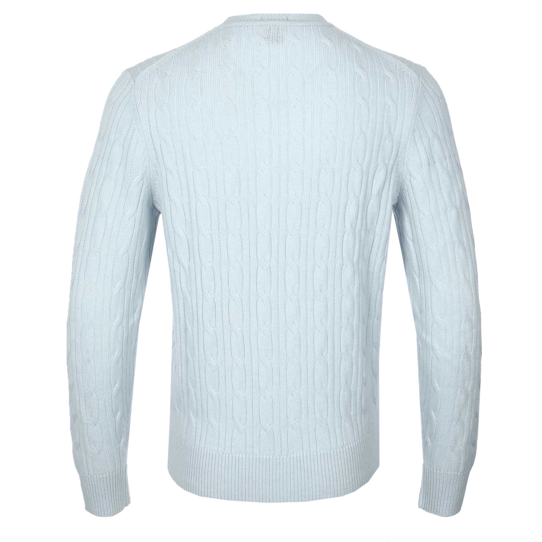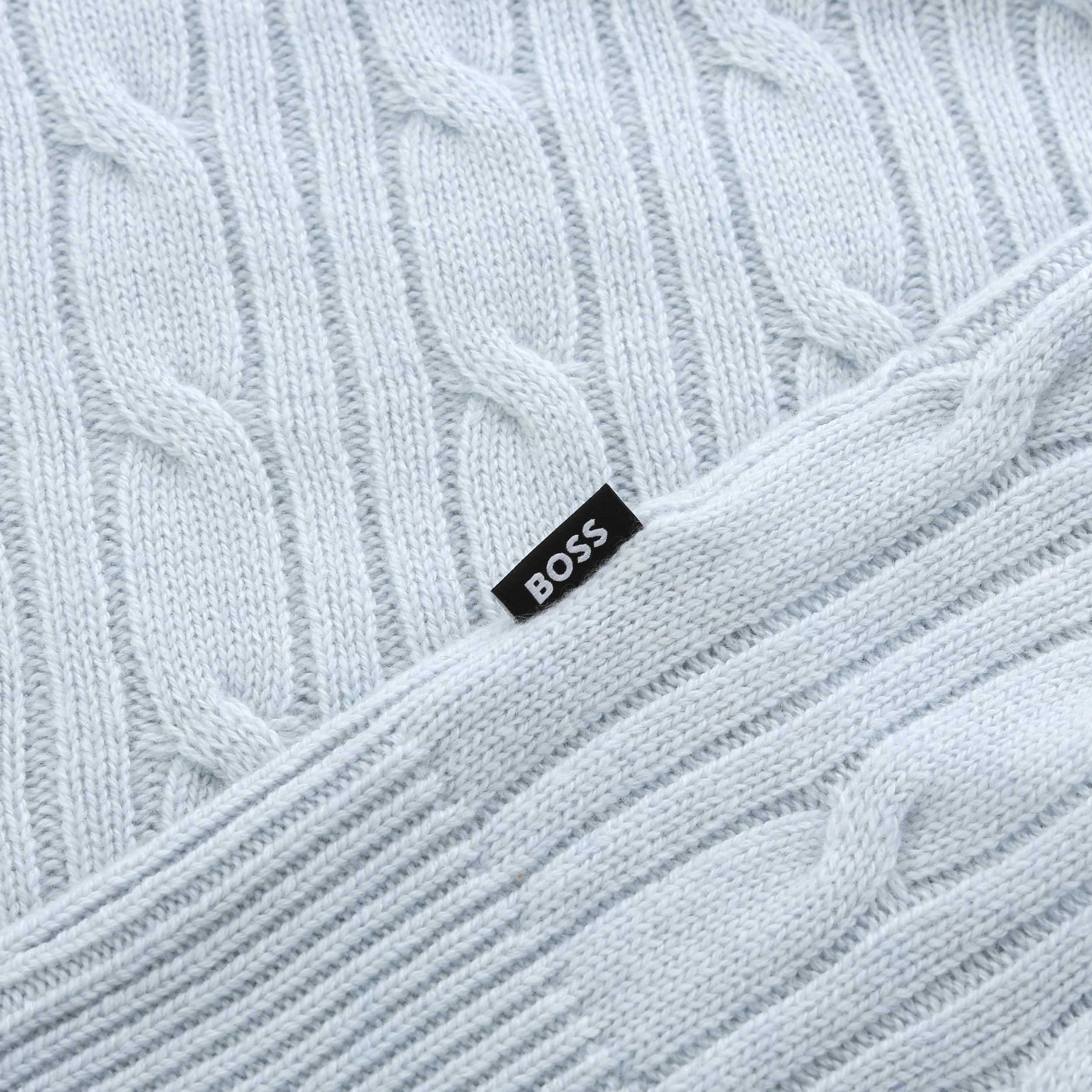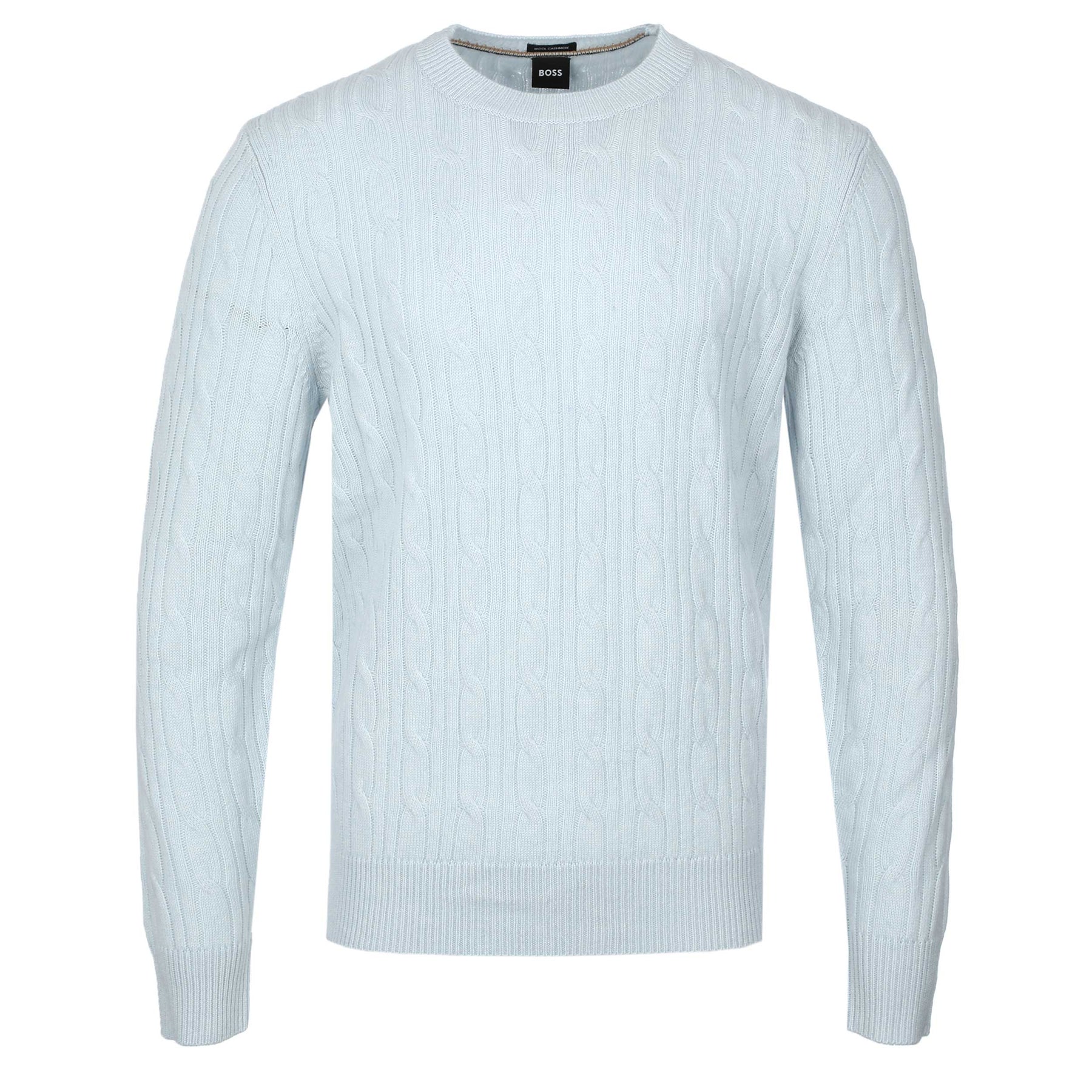 BOSS H Hetico Crewneck Sweater in Sky Blue. The BOSS Hetico Knit Jumper delivers a refined take on a classic cable knit, crafted in a soft pale blue for a clean, modern look. Designed in a regular fit, it features a ribbed crew neck, ribbed cuffs and a structured ribbed waistband to maintain shape and comfort. The all-over cable texture adds depth and sophistication, while the signature BOSS logo pinch tag on the lower left seam gives a subtle branded finish.