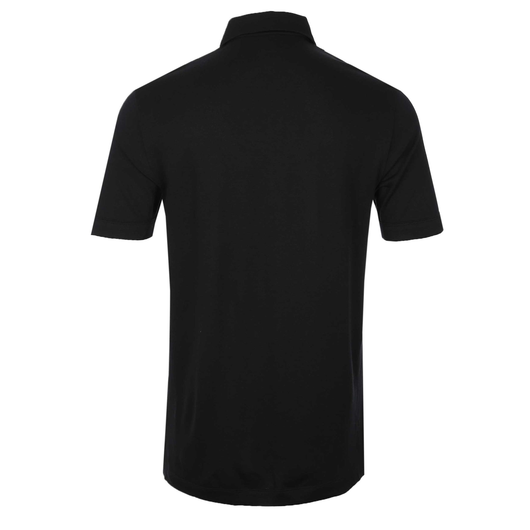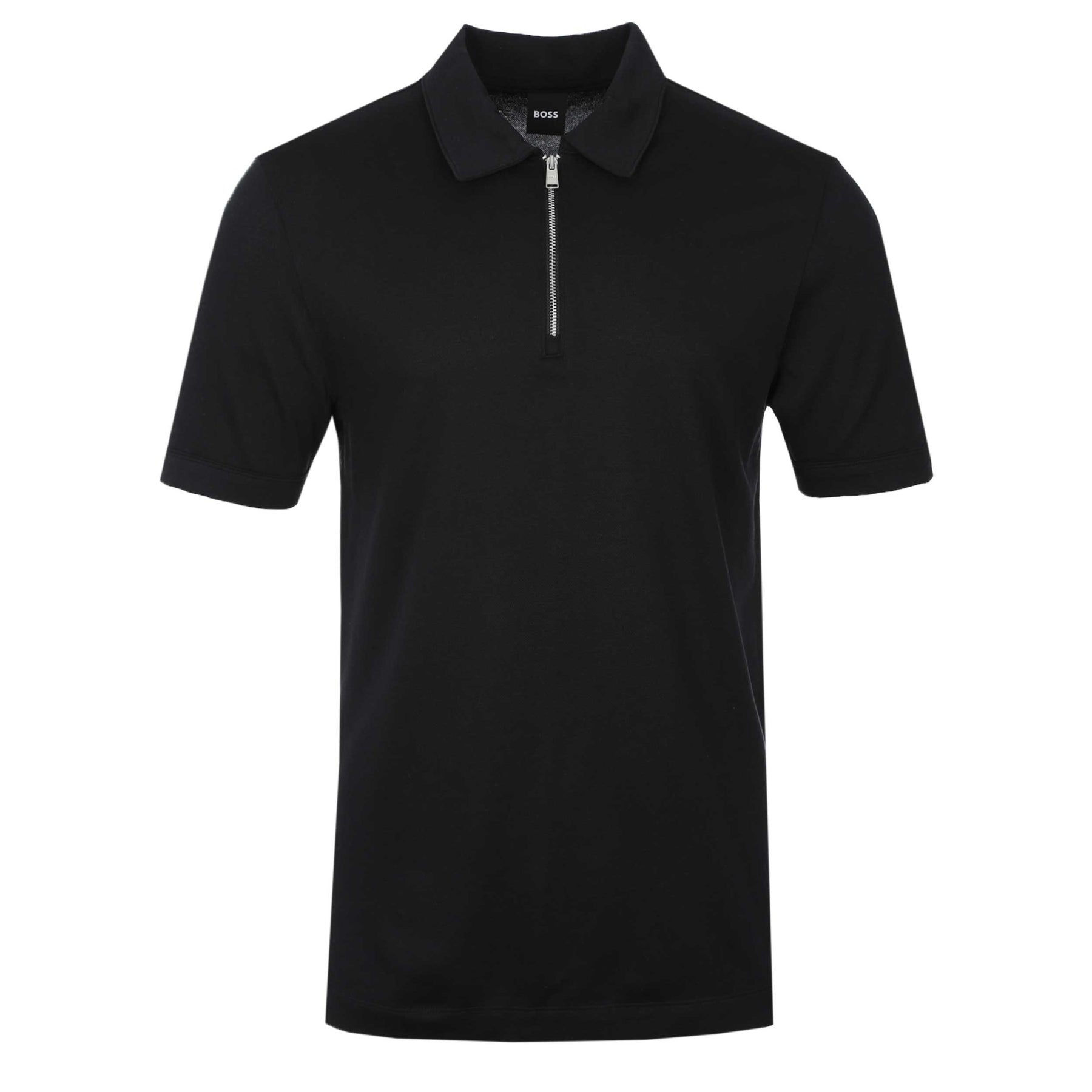 BOSS H Paras 57 Polo Shirt in Black. A regular fit short sleeve BOSS polo shirt. The branded metal quarter-zip adds a sleek upgrade to the classic polo collar, while the short sleeves keep it clean and versatile for everyday wear. Finished with a woven BOSS pinch tag on the lower left seam, it’s detailed with side vents and an extended back hem for improved comfort and movement. A polished, easygoing layer that slots straight into any smart-casual lineup.