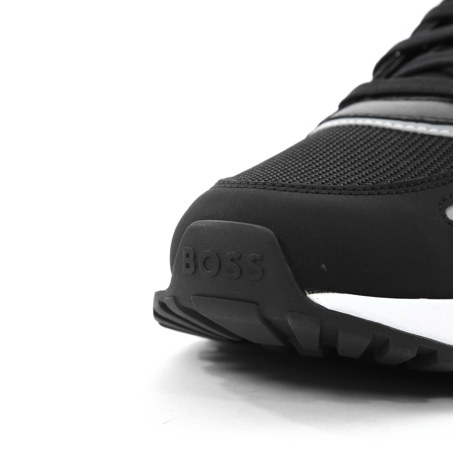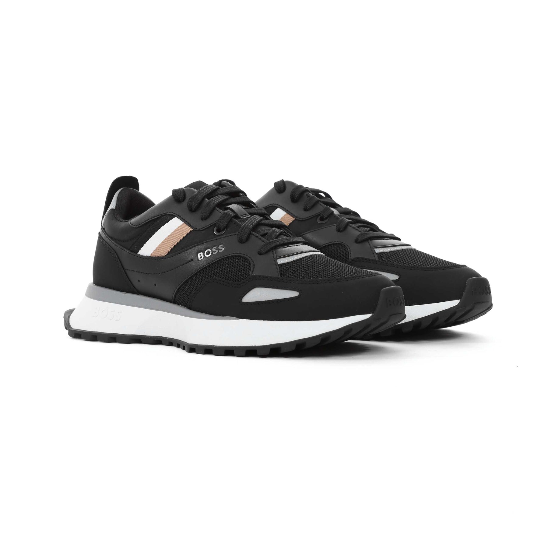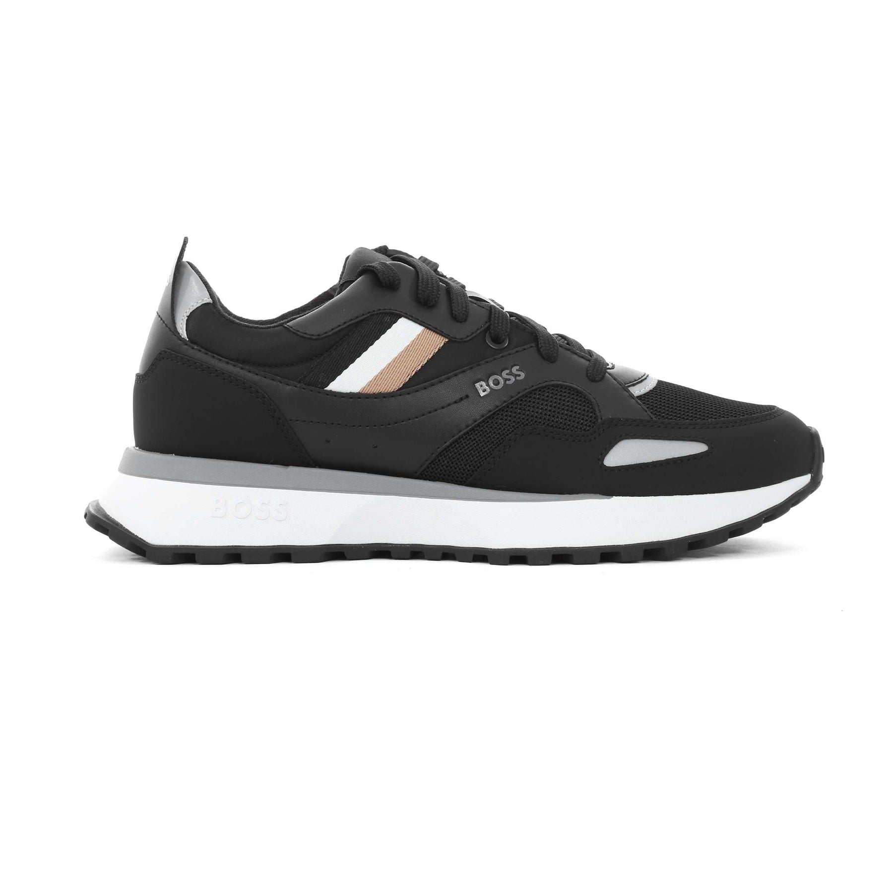 BOSS Jonah Runn mx Trainer in Black. BOSS trainer constructed in a contemporary running style. Crafted with mesh and faux leather panels to give the trainer it's sporty look. BOSS logo on the side panel. Signature stripe design to the side panel. Reflective detailing throughout the trainer. Finished with a contrasting colour block sole.