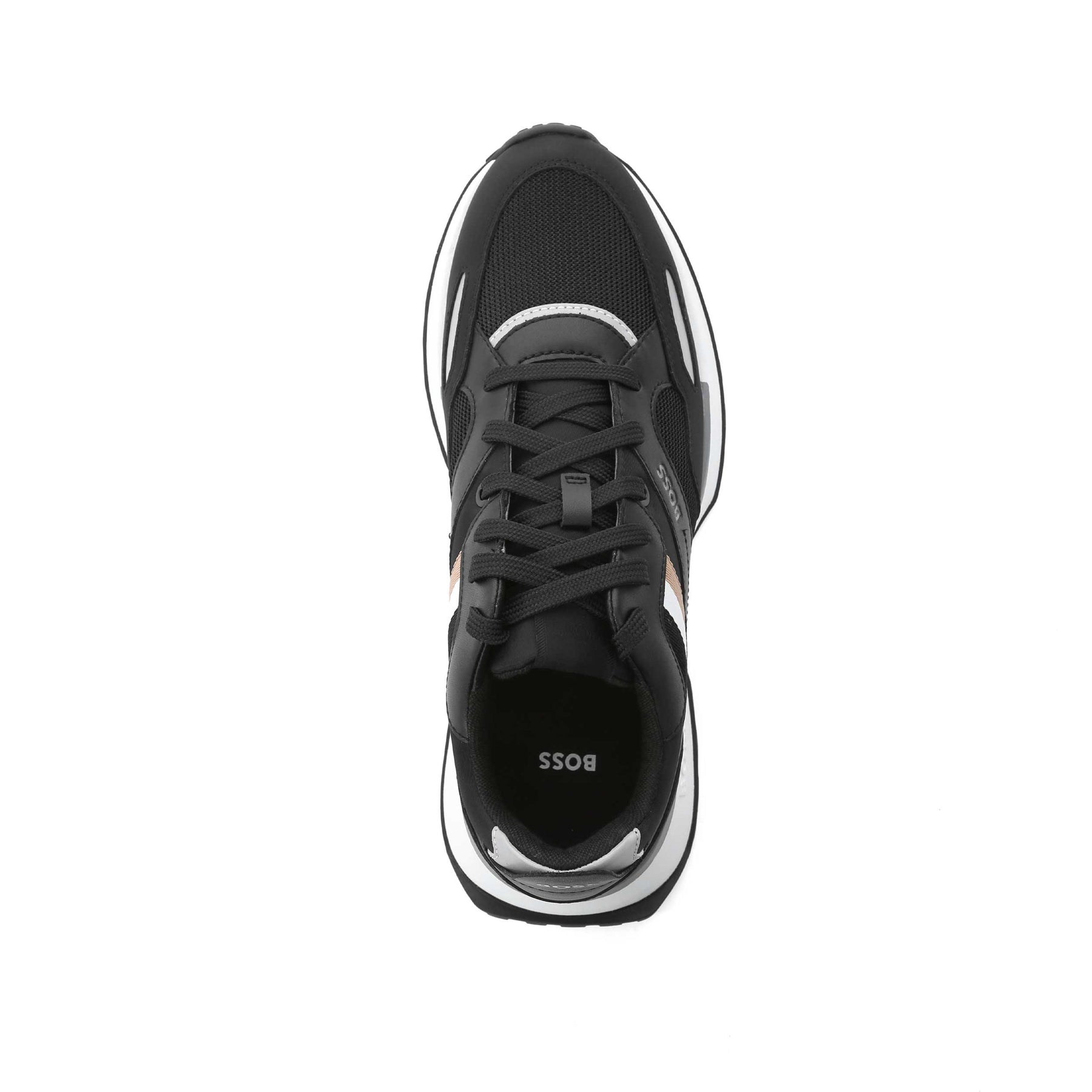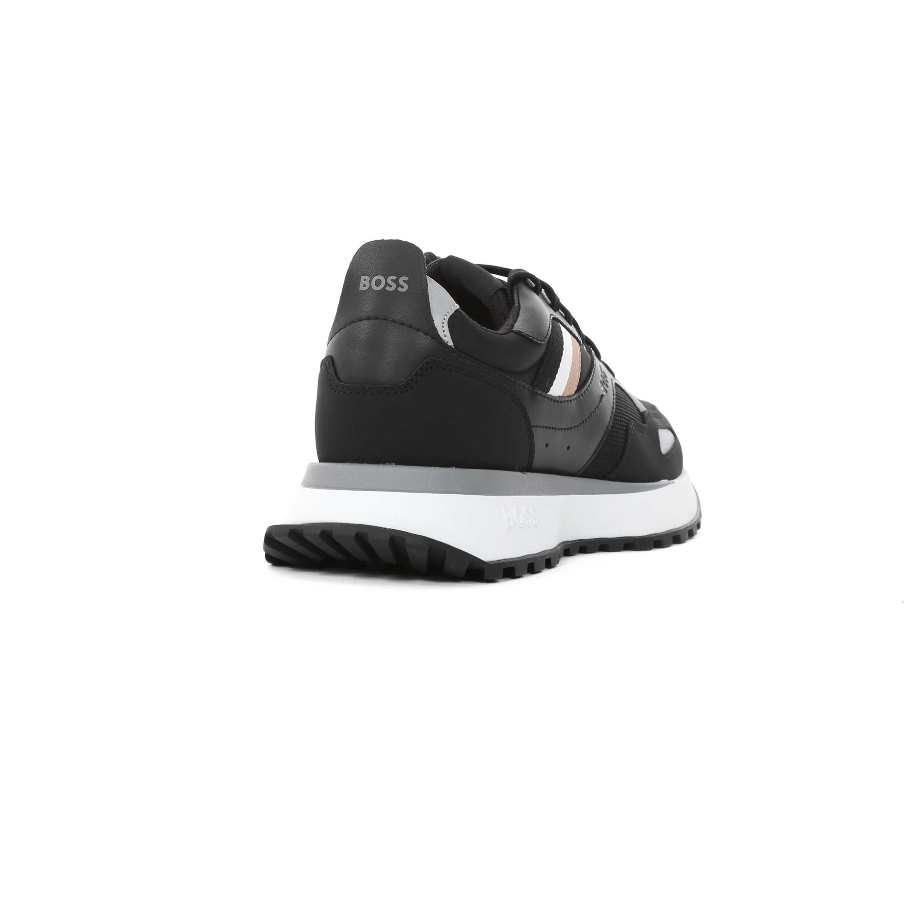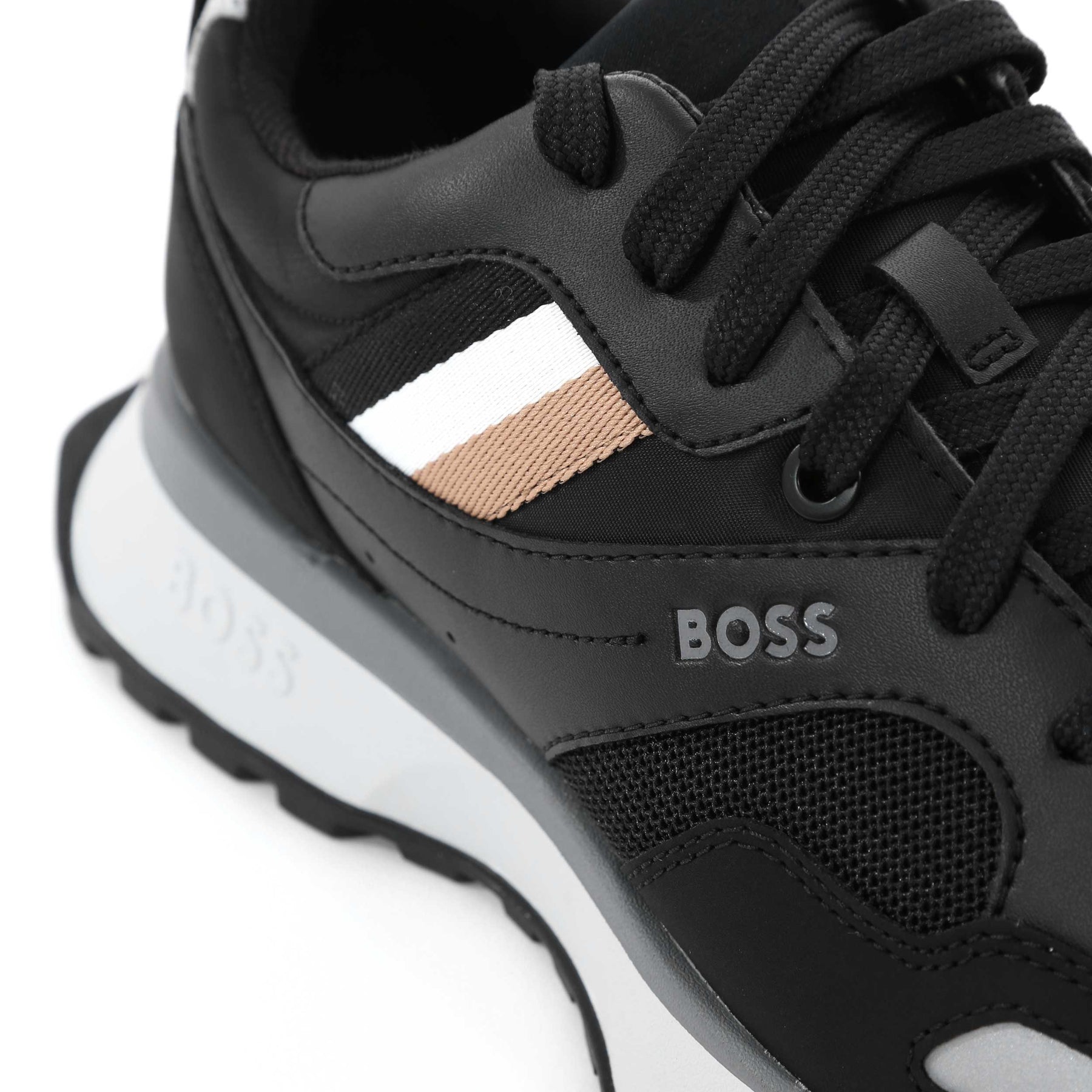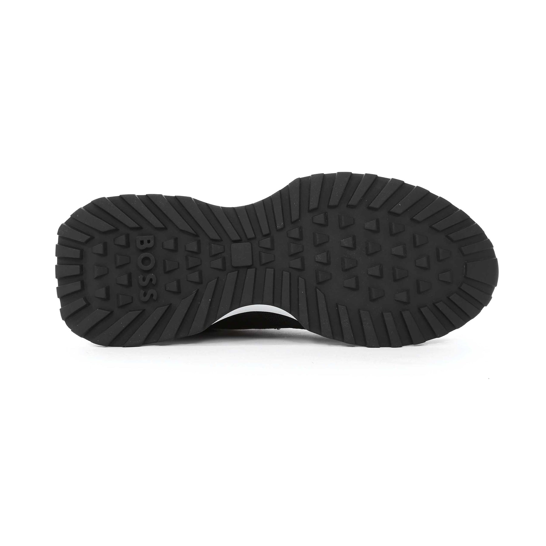 BOSS Jonah Runn mx Trainer in Black. BOSS trainer constructed in a contemporary running style. Crafted with mesh and faux leather panels to give the trainer it's sporty look. BOSS logo on the side panel. Signature stripe design to the side panel. Reflective detailing throughout the trainer. Finished with a contrasting colour block sole.
