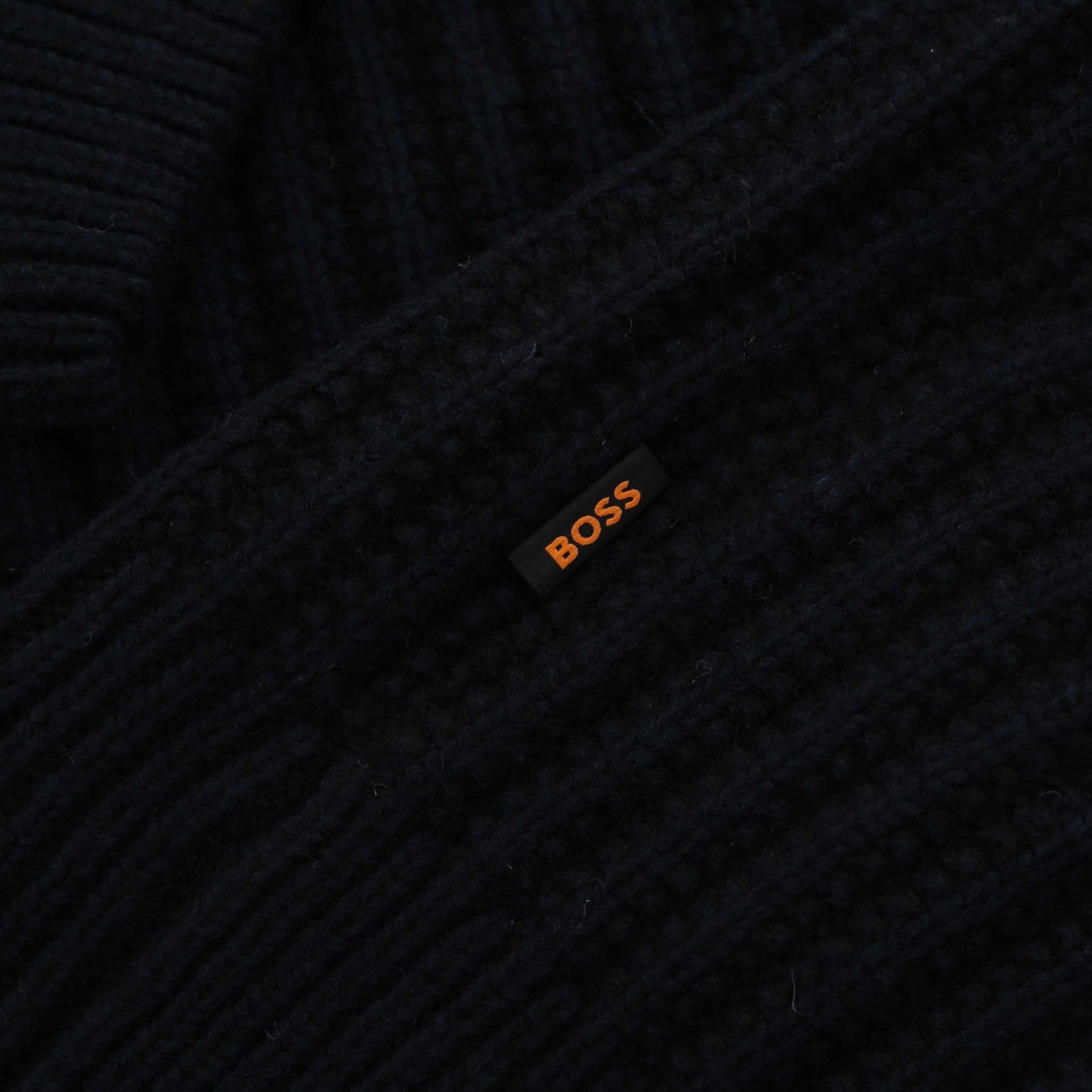 BOSS Kwinter Knitwear in Dark Blue. A classic piece of knitwear by BOSS. A knitted quarter-zip with a structured ribbed stand collar, ribbed cuffs, and a stretch ribbed hem for a secure, comfortable fit. Finished with a subtle Boss branded pinch tag at the lower side seam, it’s a modern everyday layer with just enough edge.