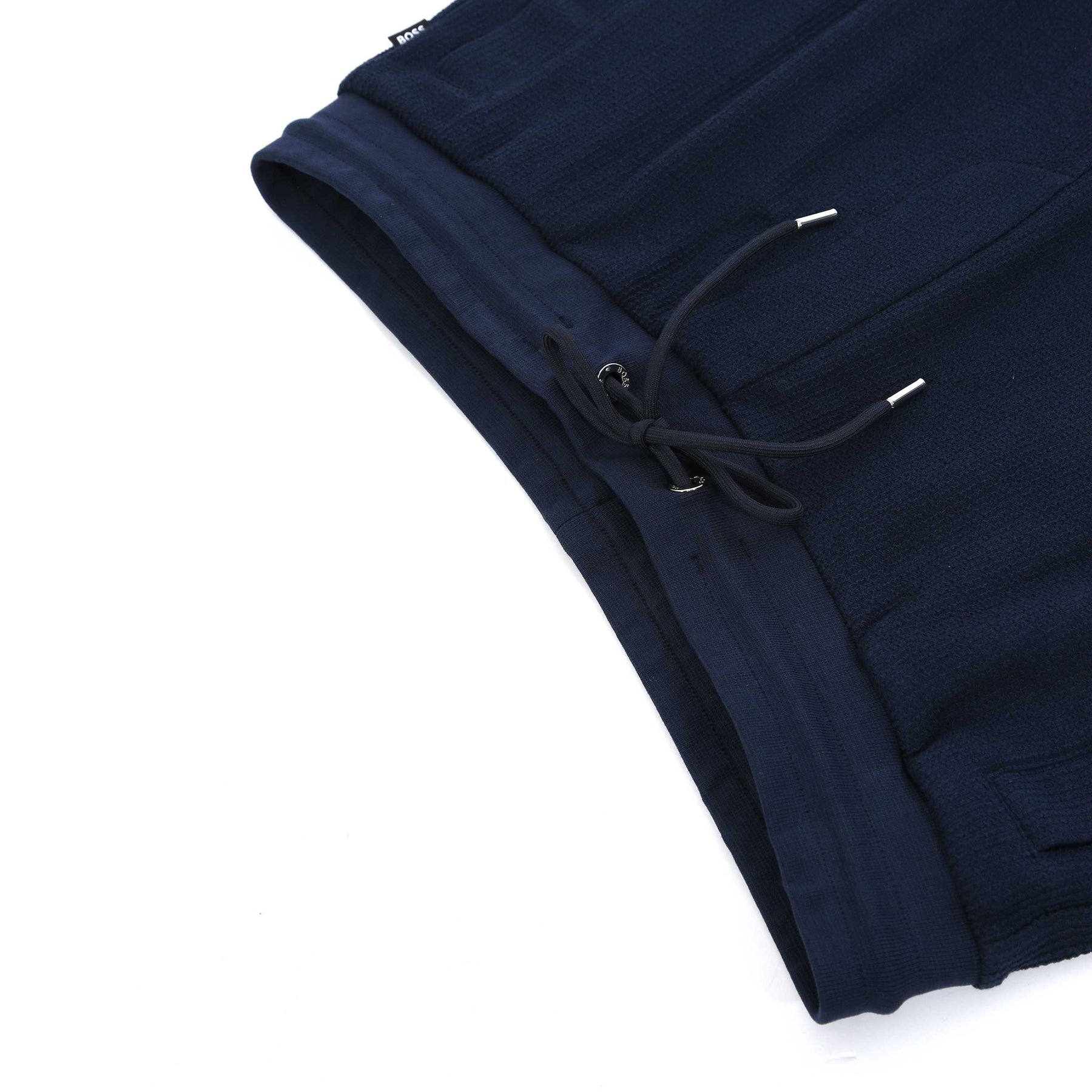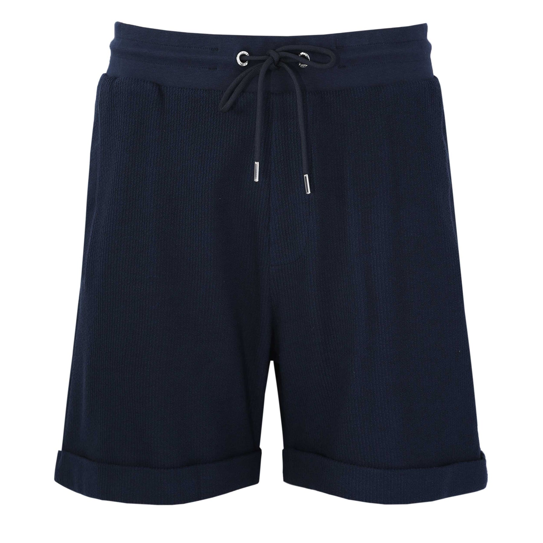 BOSS Lasdun 129 Short in Navy. A regular fit short by BOSS. This short arrives in a plain design. Boucle fabric style. Featuring an elastictae drawstring waistband. 2 snap fastening side spockets and 2 seat pockets. Team up with the matching shirt.