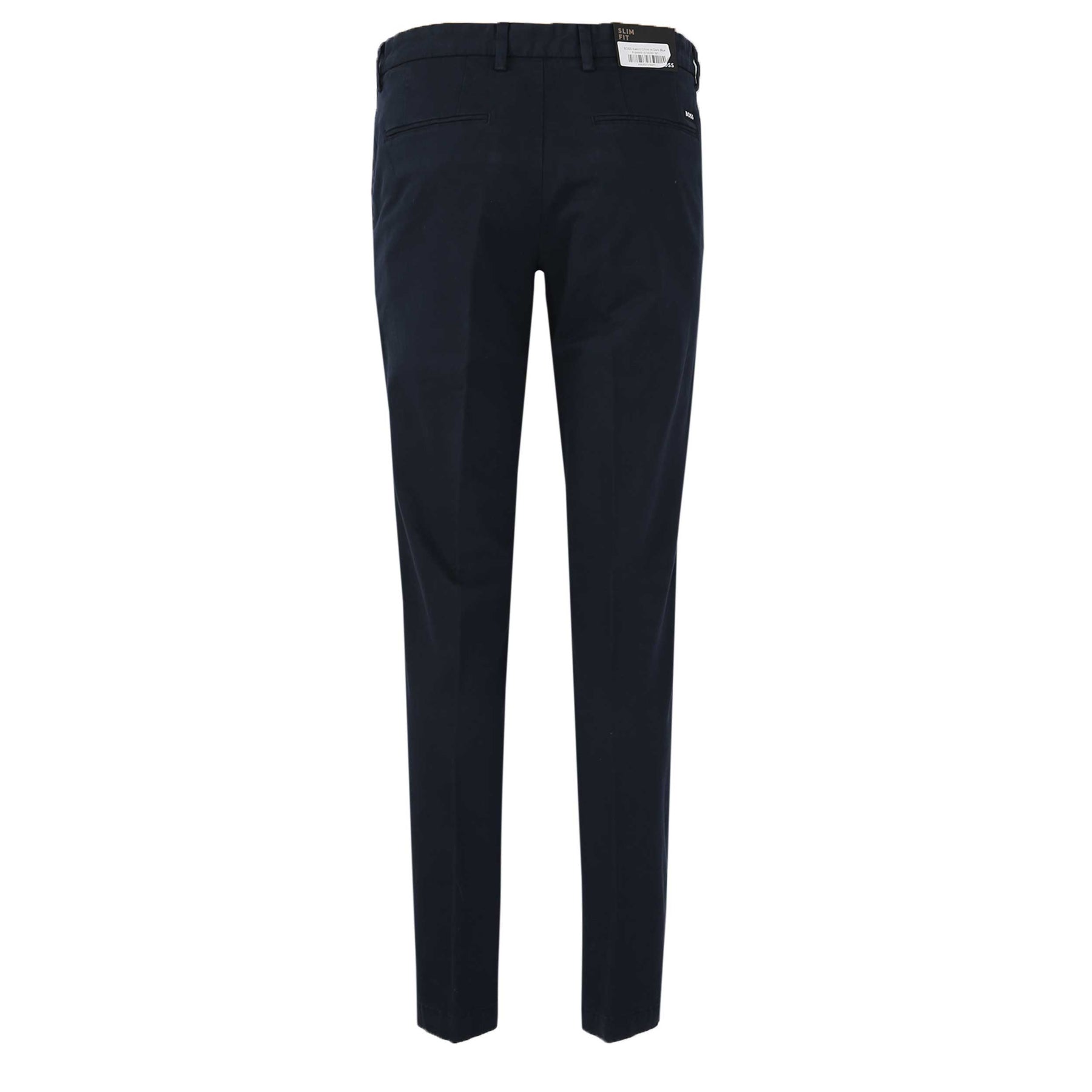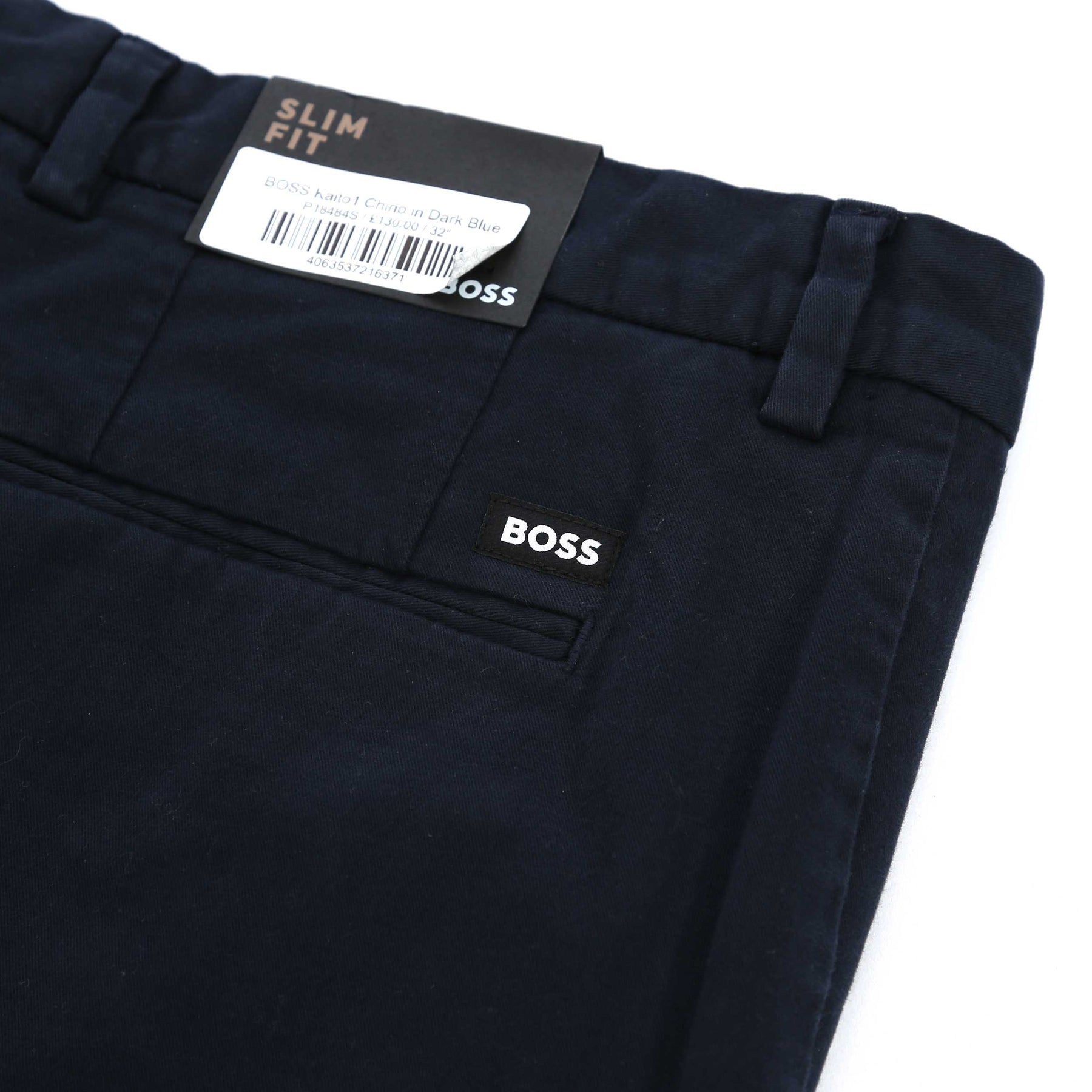 BOSS P Kaiton1 Chino in Dark Blue. Tech fabric chino by BOSS in a slim fit. These lightweight tech chinos features a regular-high waist, button with zip fastening. 2 side slash pockets, 2 piped pockets on the back. Boss logo tab to the seat of the chino. Ideal for chino for both formal and casual occasions.