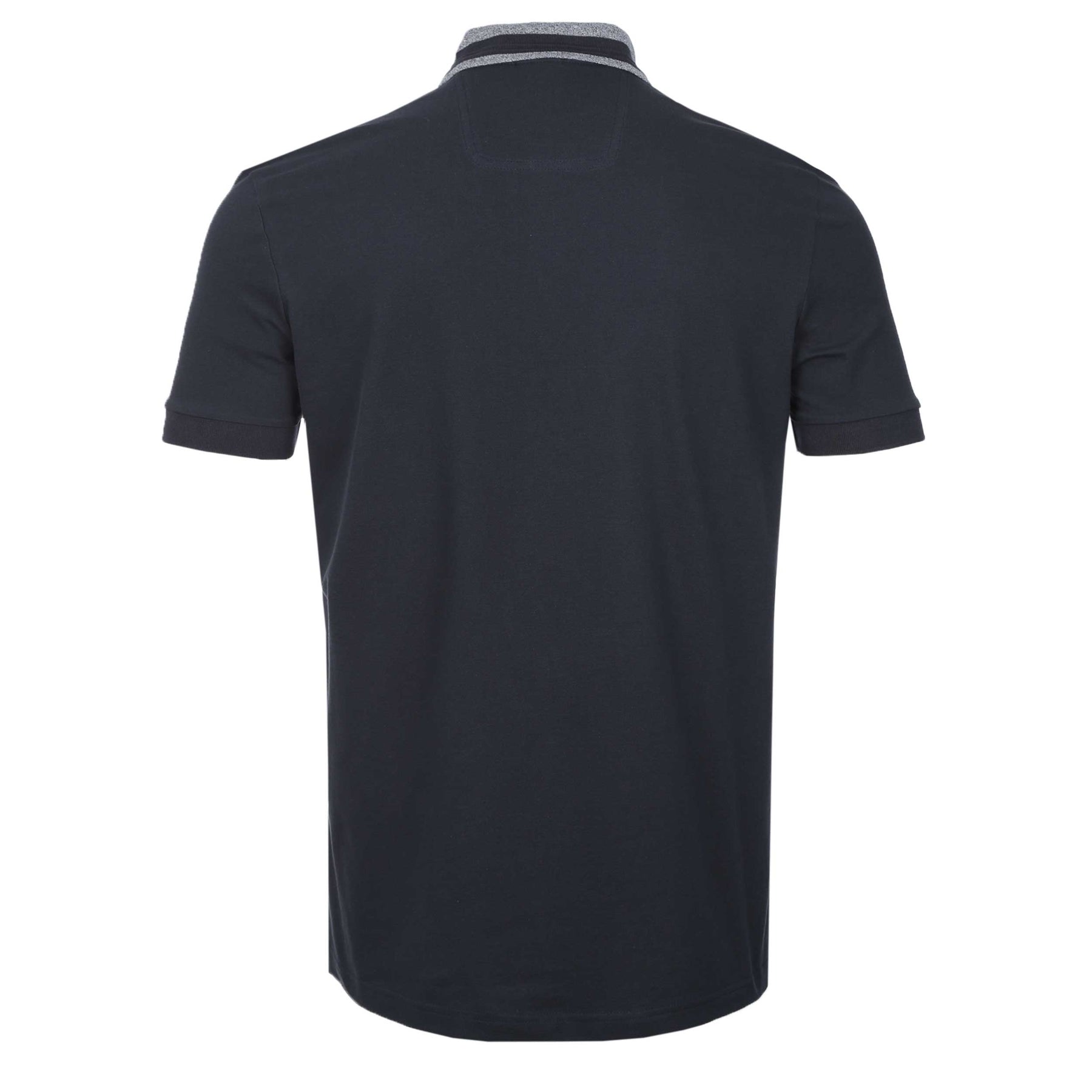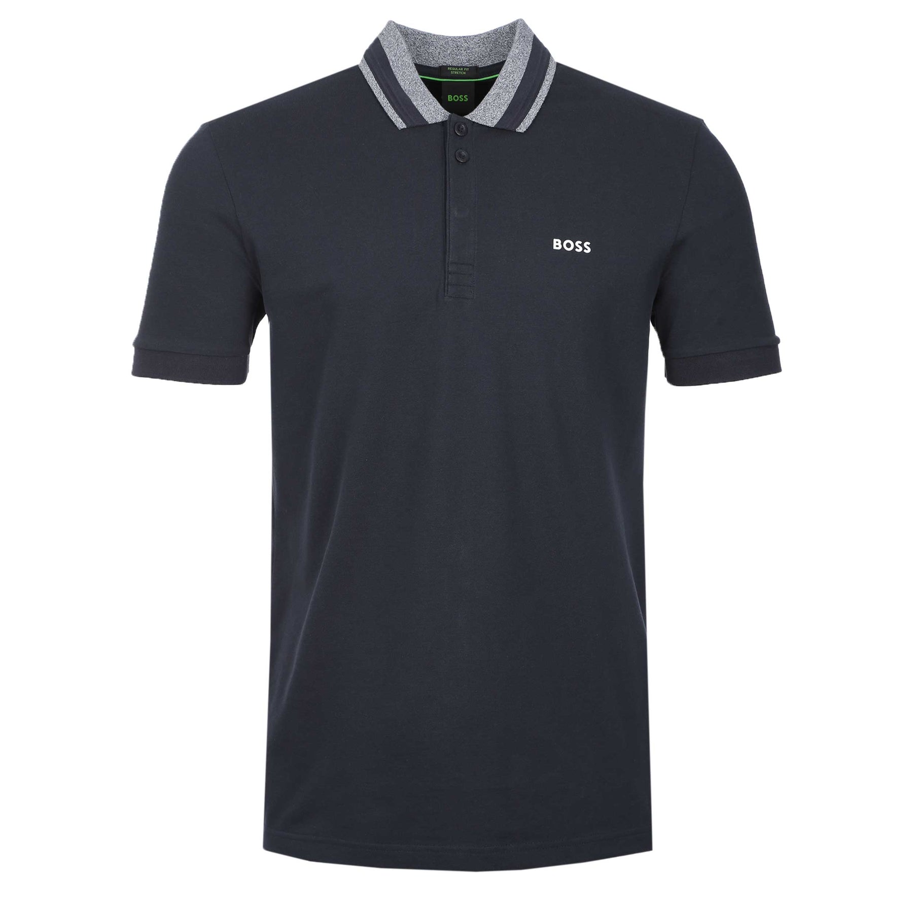 BOSS Paddy 1 Polo Shirt in Navy. A classic Hugo Boss polo shirt in a regular fit. A 3 button fastening placket with a contrasting colour rubber BOSS logo to the chest. A plain design polo shirt with a contrasting colour collar.