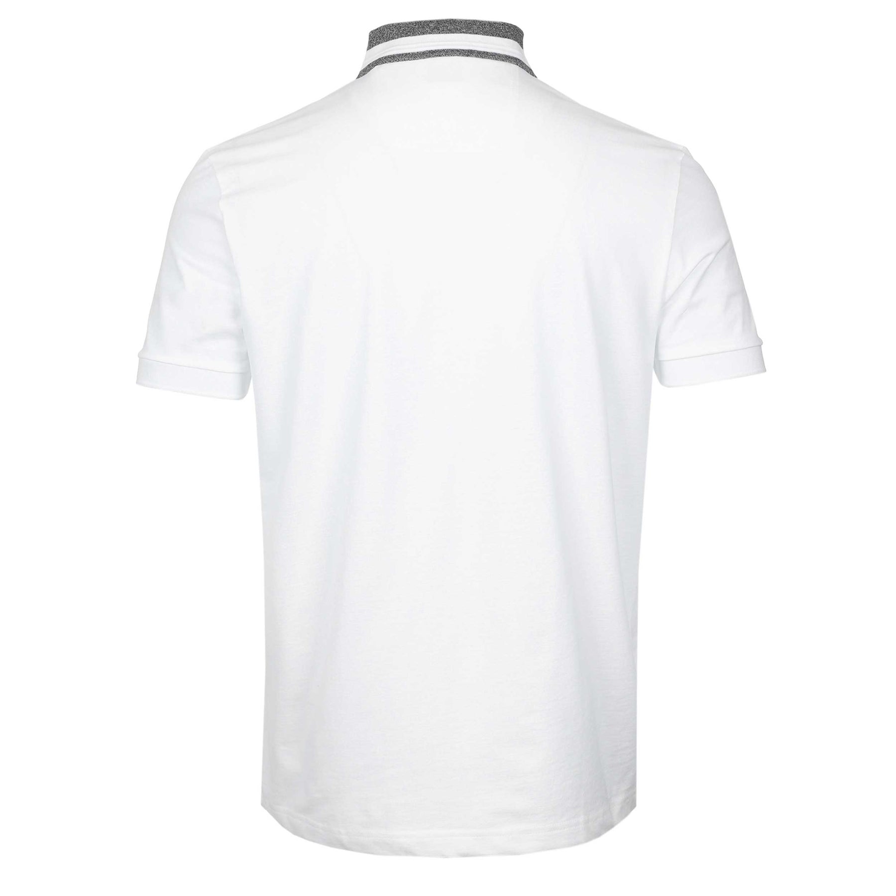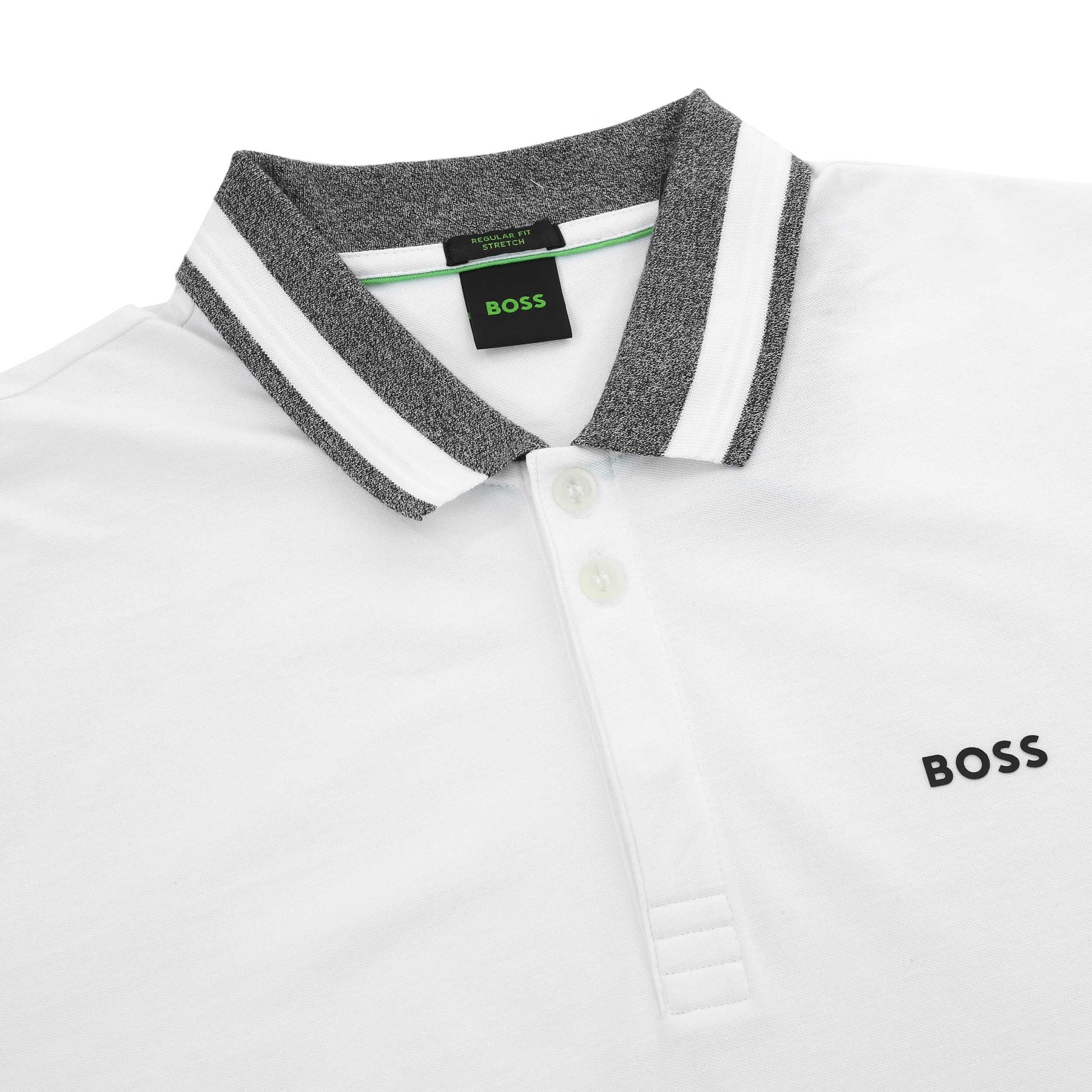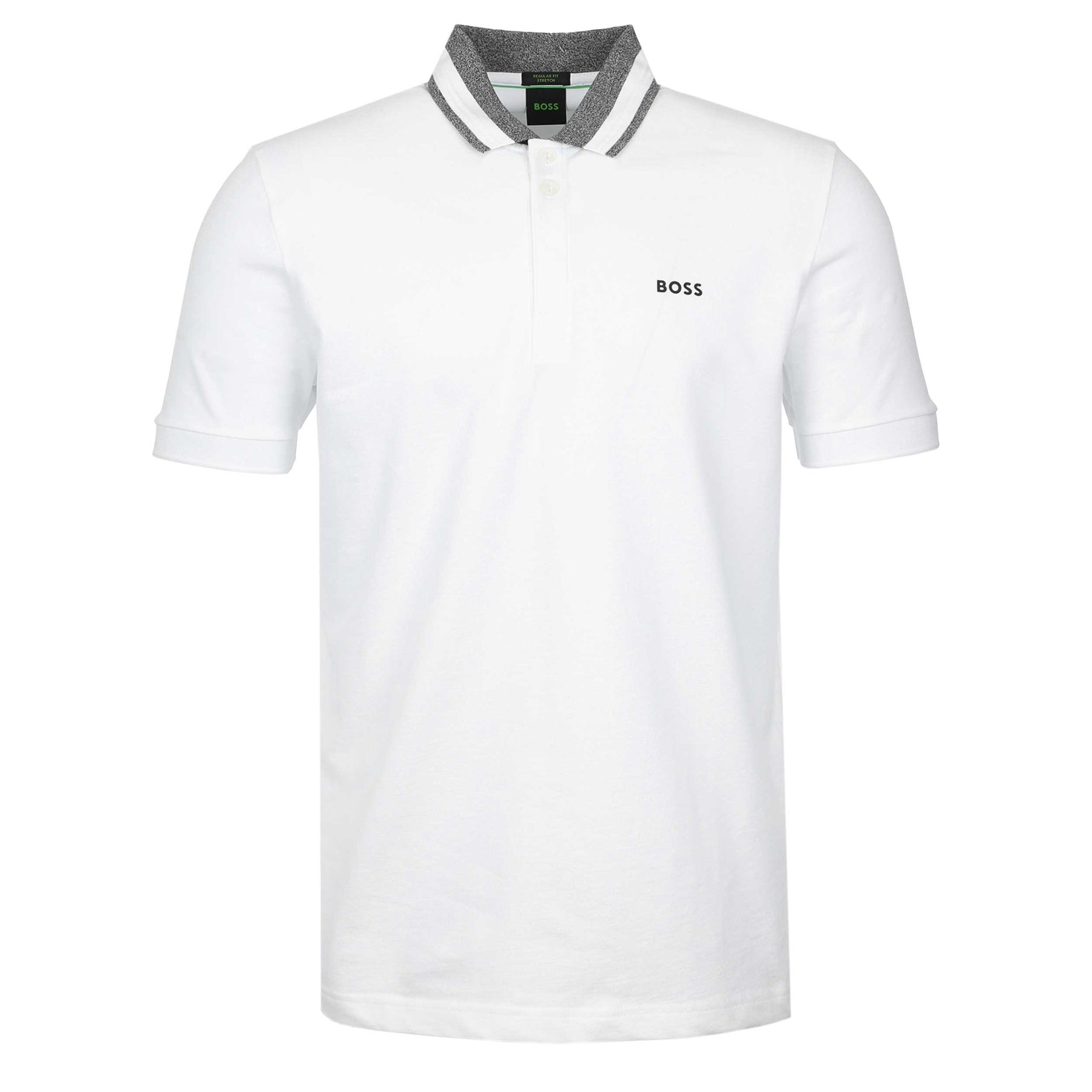 BOSS Paddy 1 Polo Shirt in White. A classic Hugo Boss polo shirt in a regular fit. A 3 button fastening placket with a contrasting colour rubber BOSS logo to the chest. A plain design polo shirt with a contrasting colour collar.