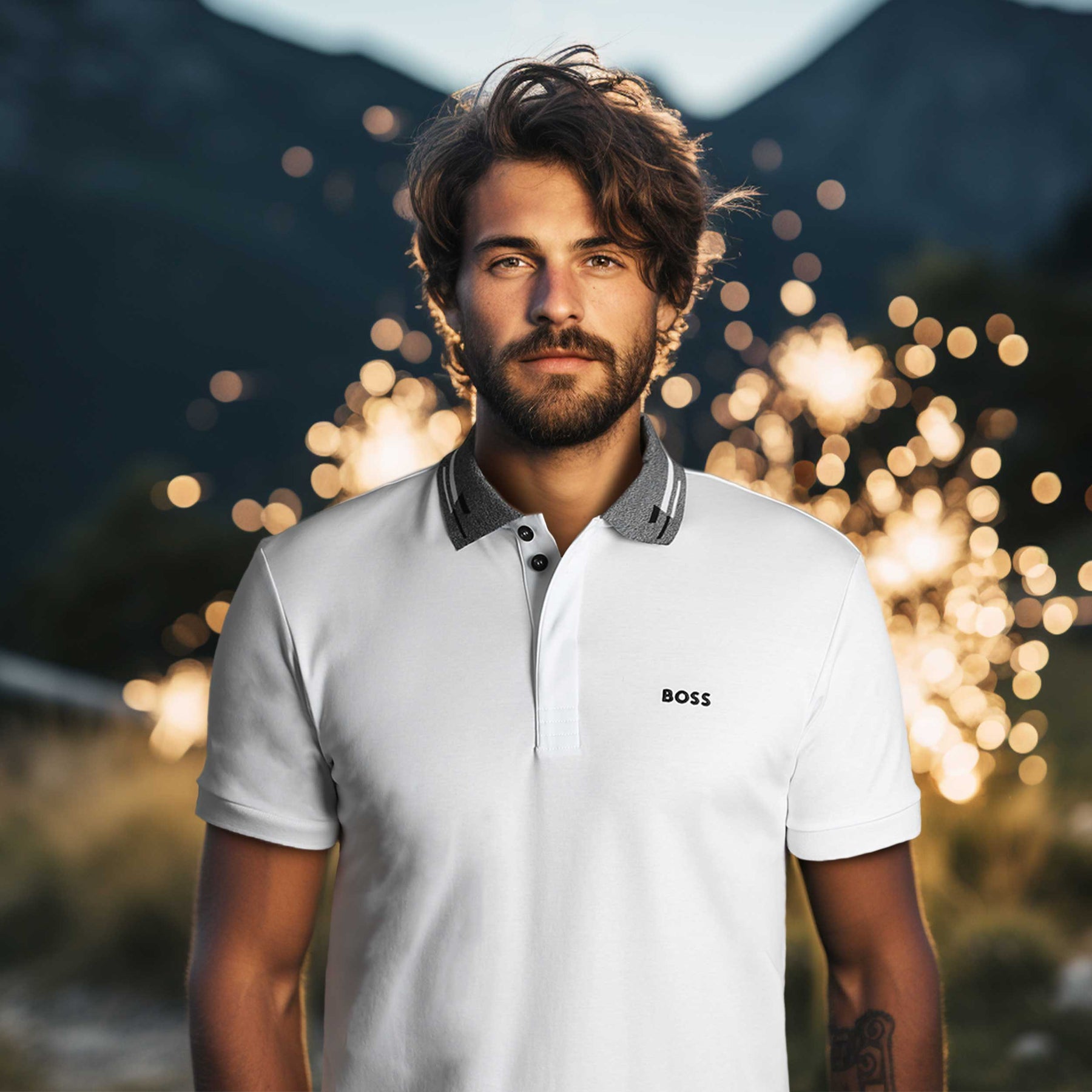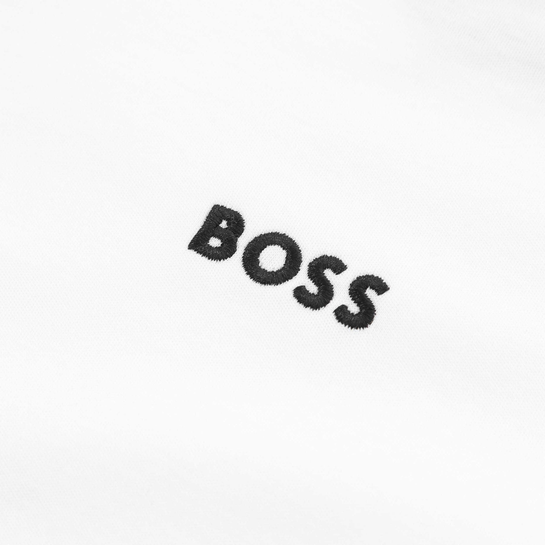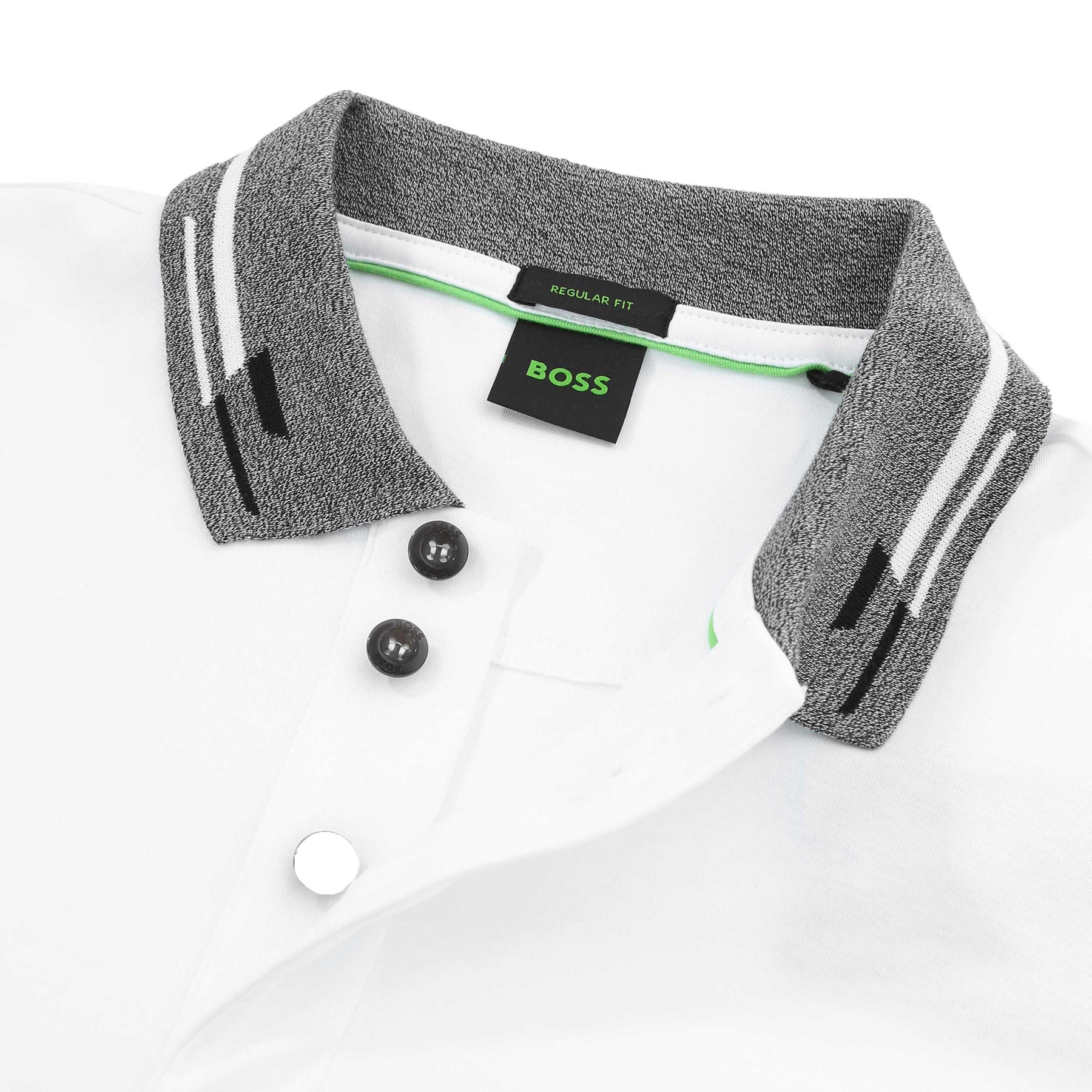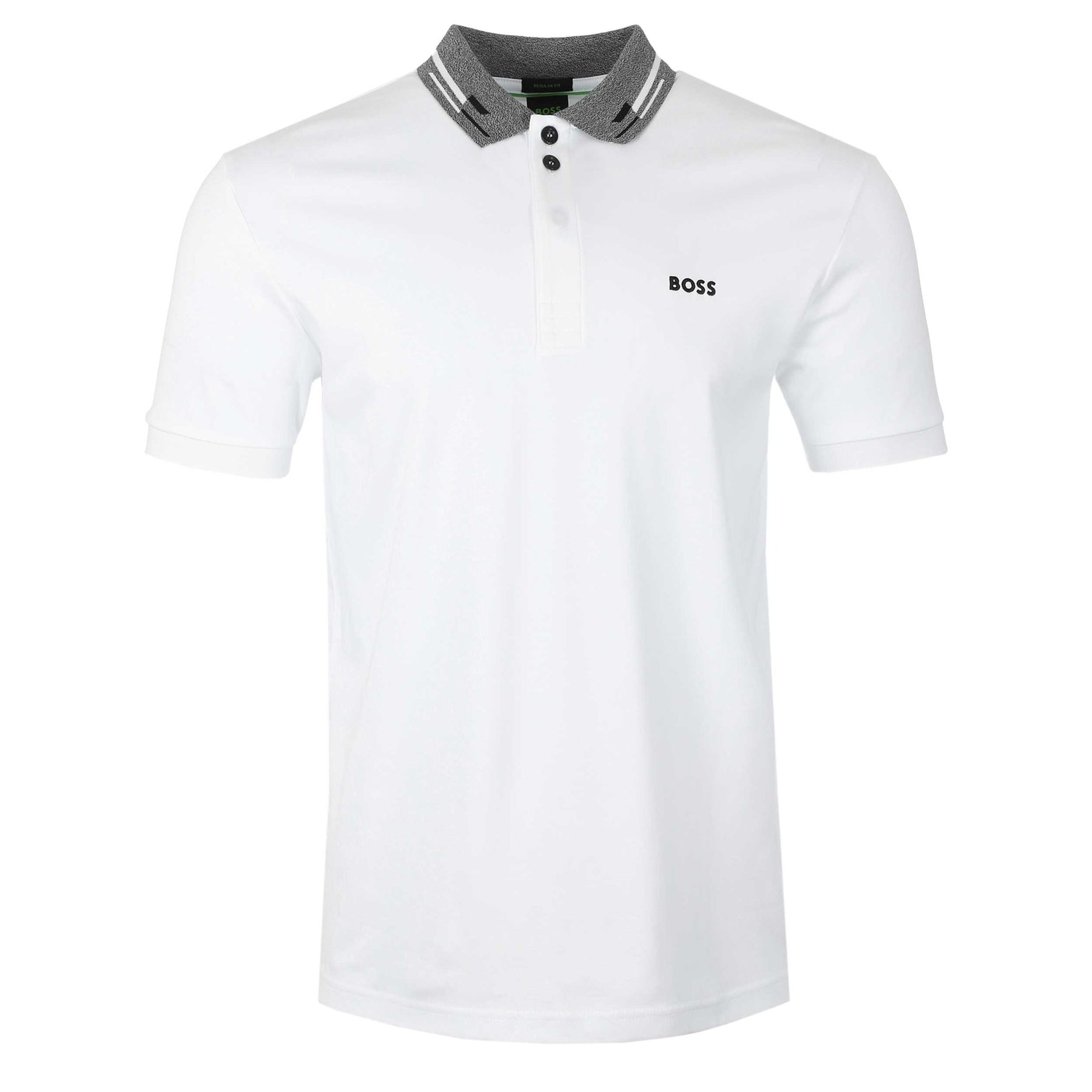 BOSS Paddy 1 Polo Shirt in White. A classic Hugo Boss polo shirt in a regular fit. A 2 button fastening placket with a contrasting colour rubber BOSS logo to the chest. Contrasting trims to the cuffs and placket.