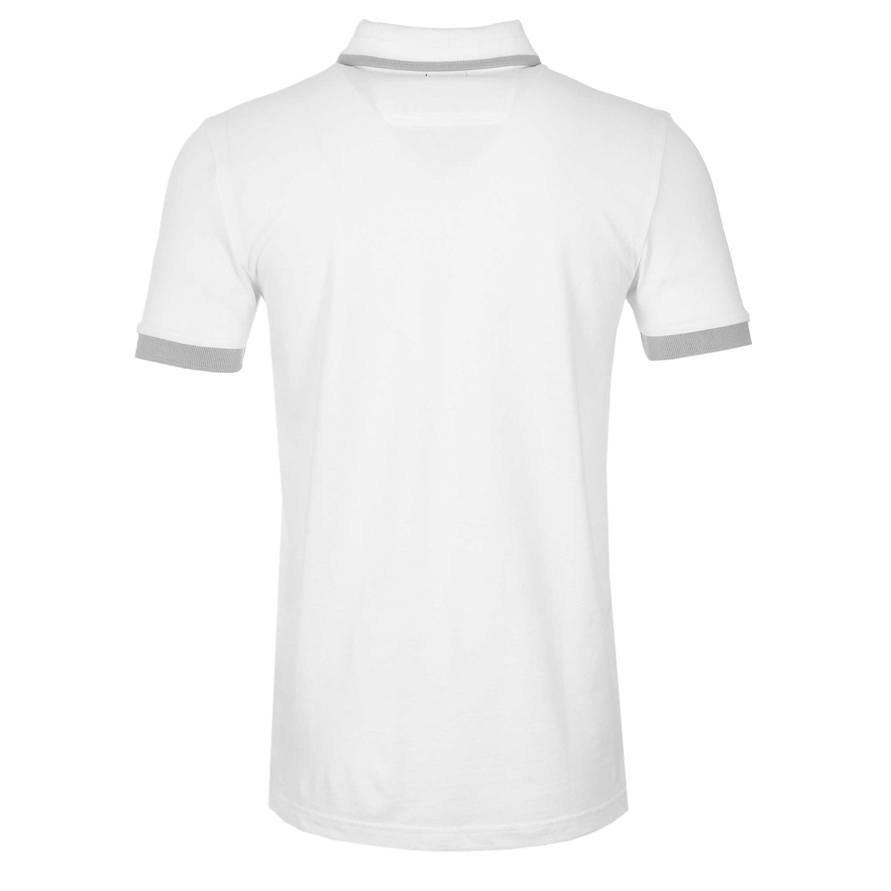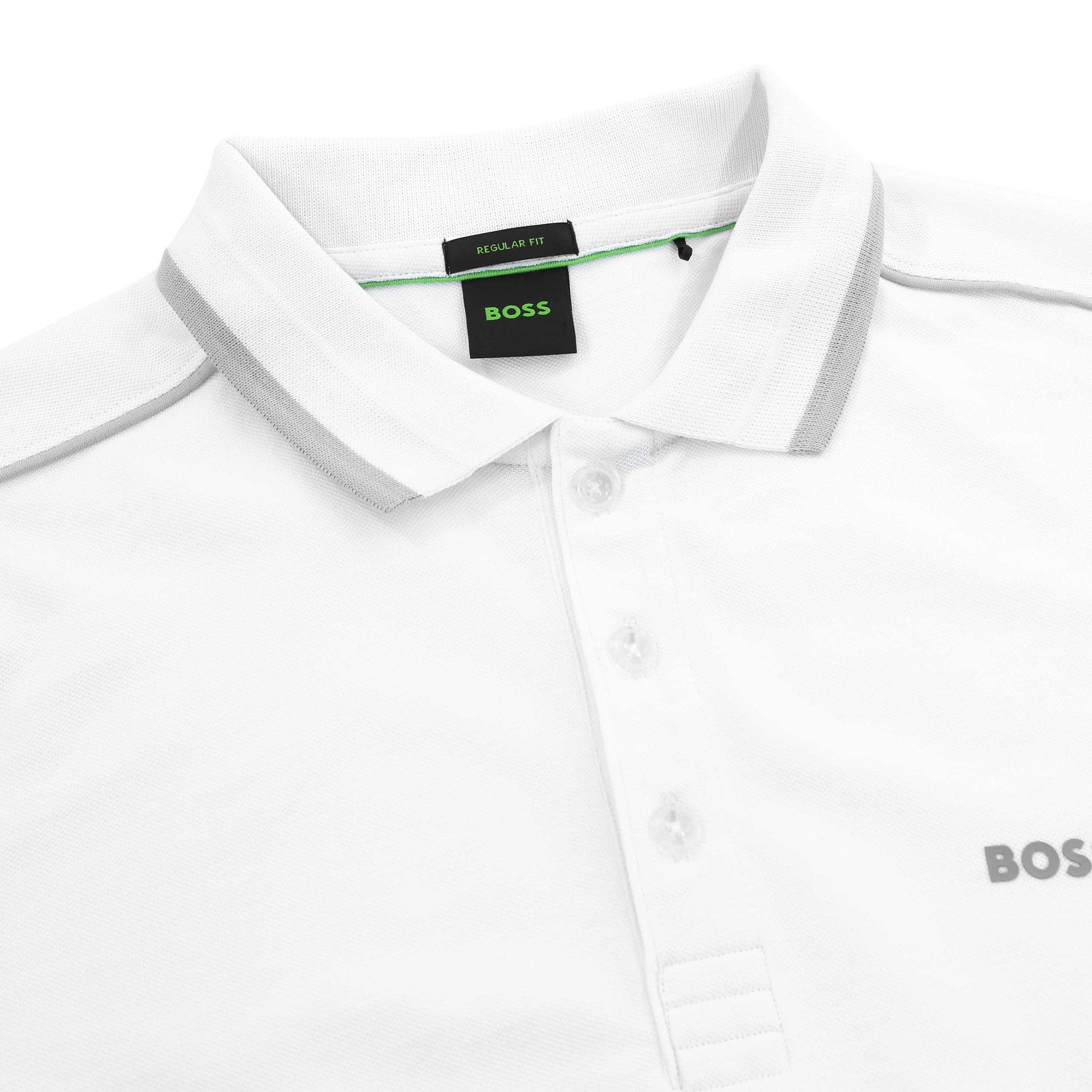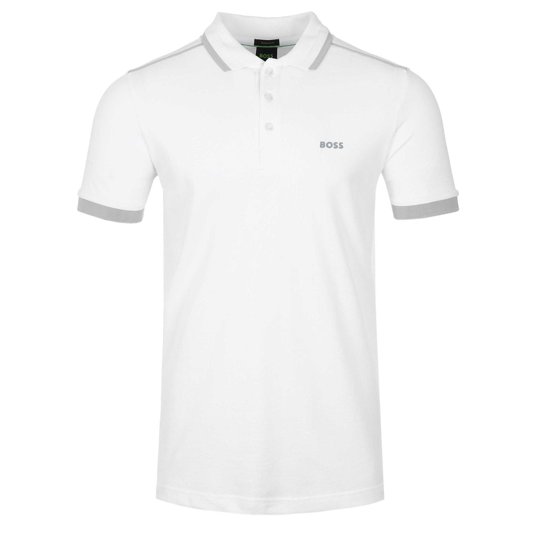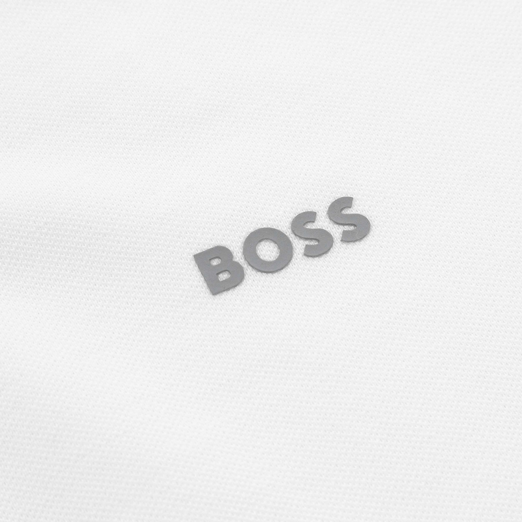 BOSS Paddy 1 Polo Shirt in White. A classic Hugo Boss polo shirt in a regular fit. A 2 button fastening placket with a contrasting colour rubber BOSS logo to the chest. Contrasting trims to the collar, cuffs and placket.