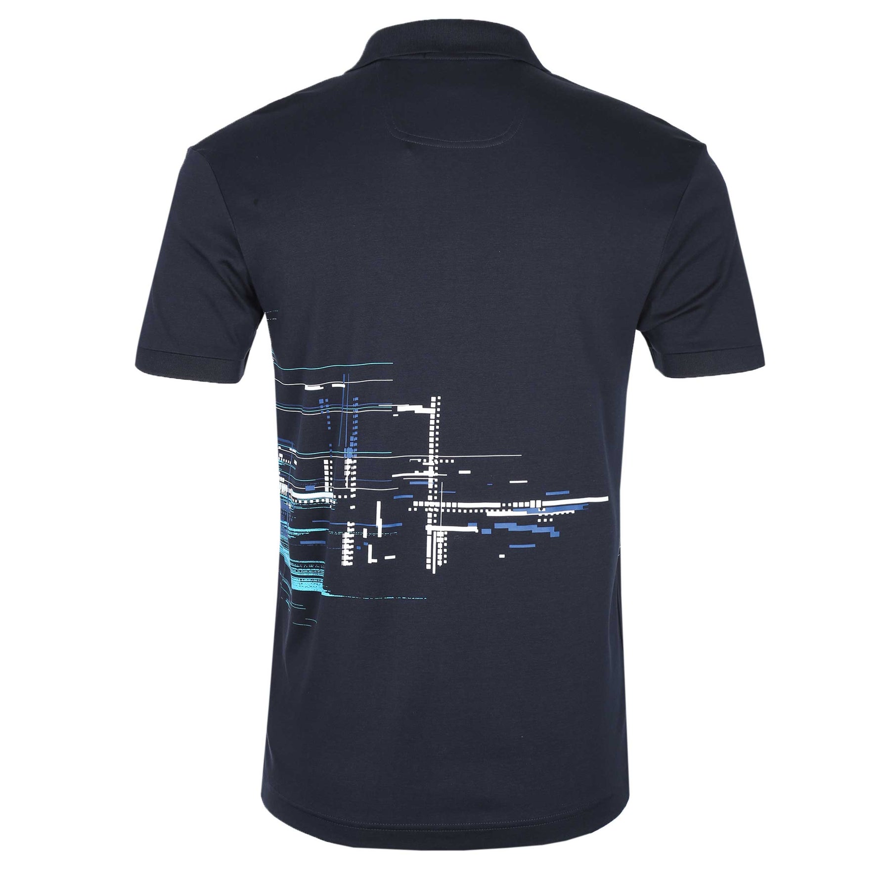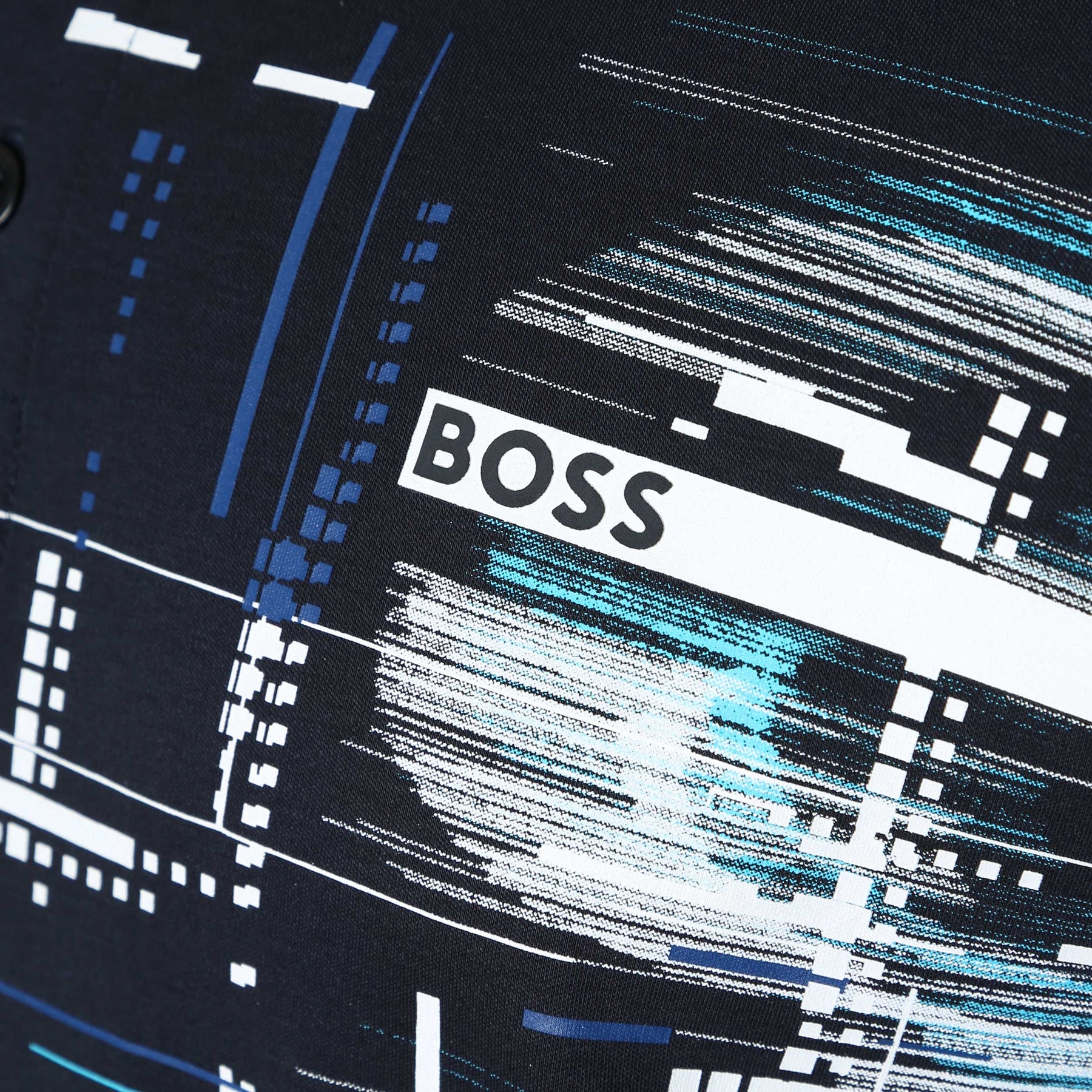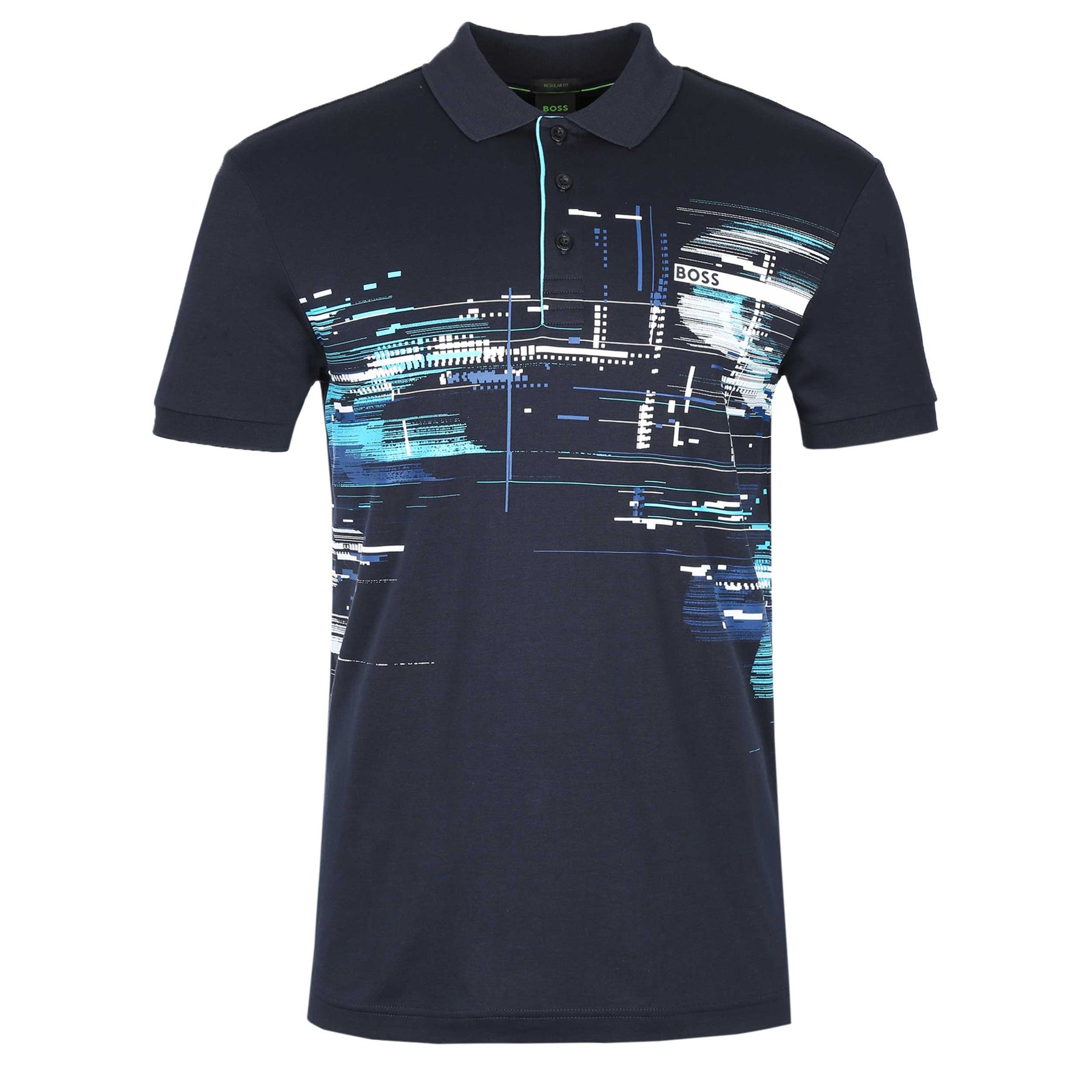 BOSS Paddy 5 Polo Shirt in Navy. A classic Hugo Boss polo shirt in a regular fit. A 3 button fastening placket. Contrasting graphic artwork design print to the polo shirt. Printed BOSS logo to the chest.