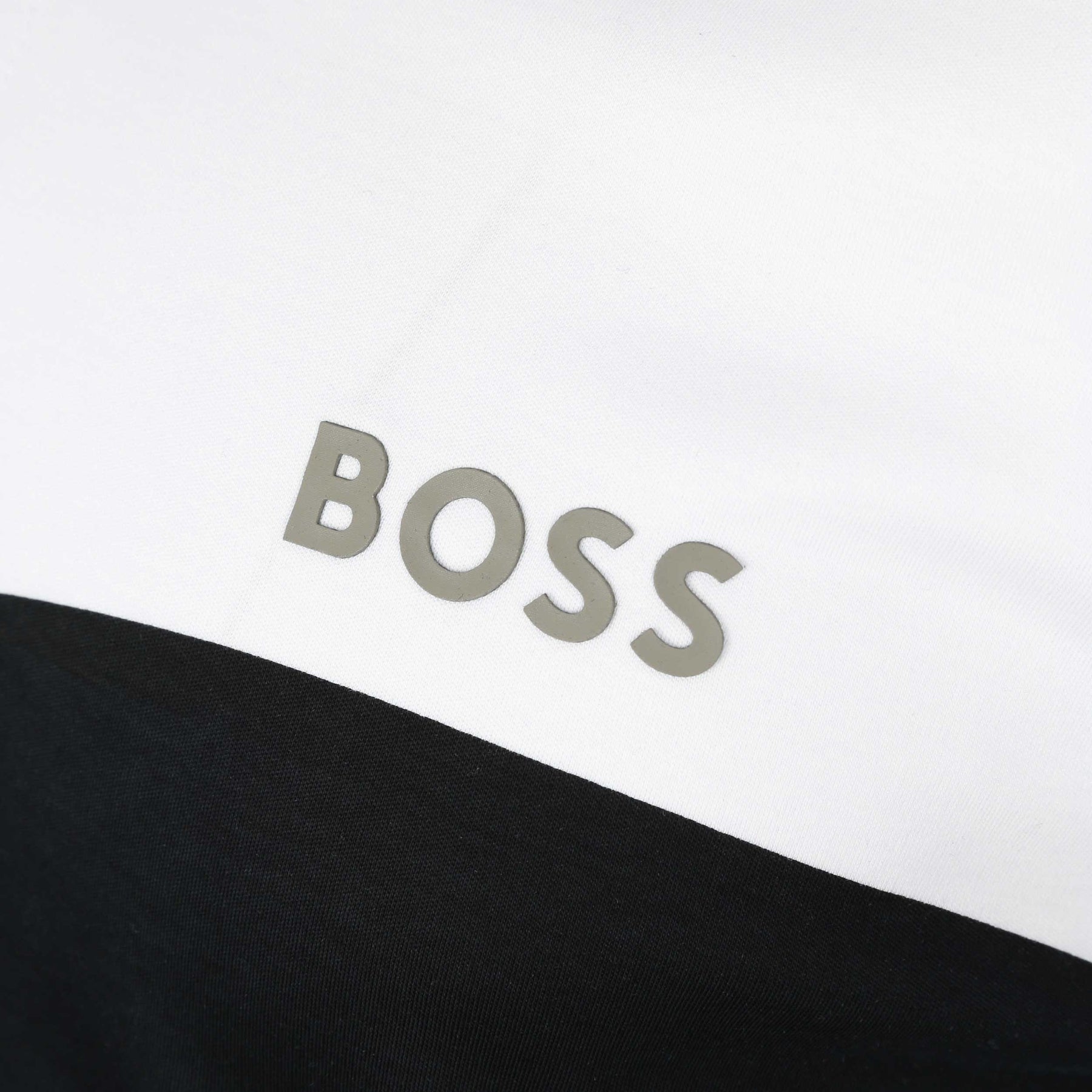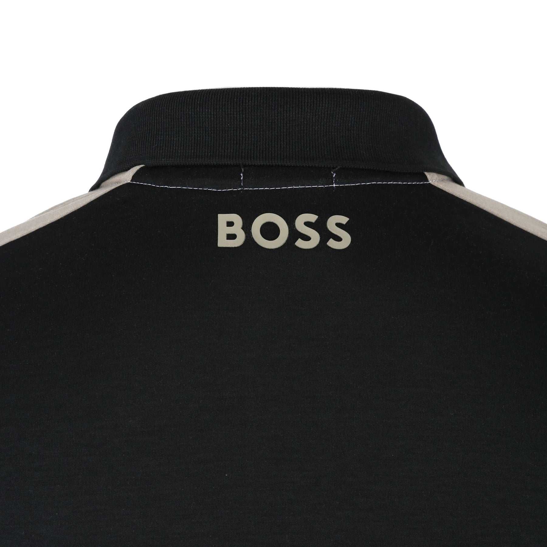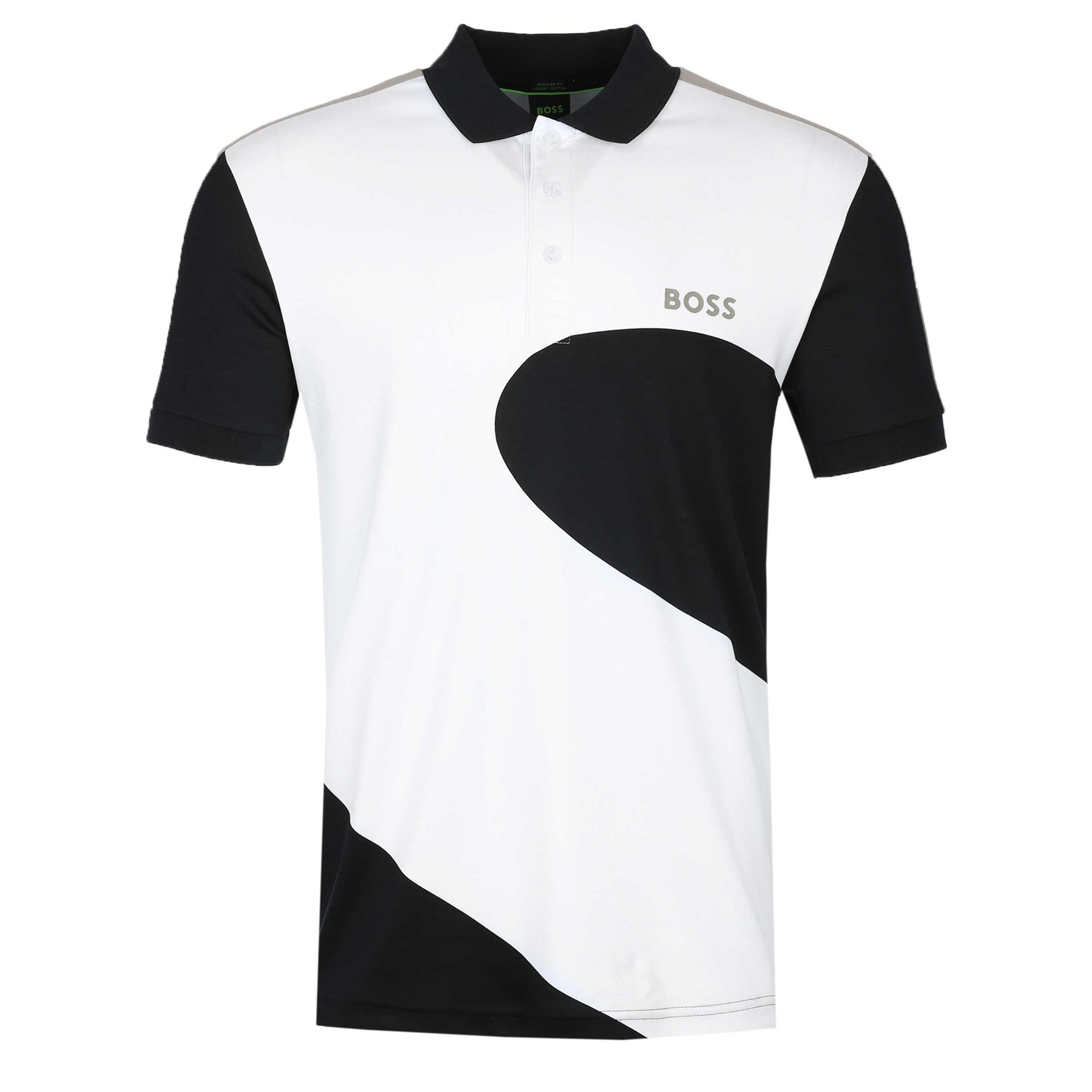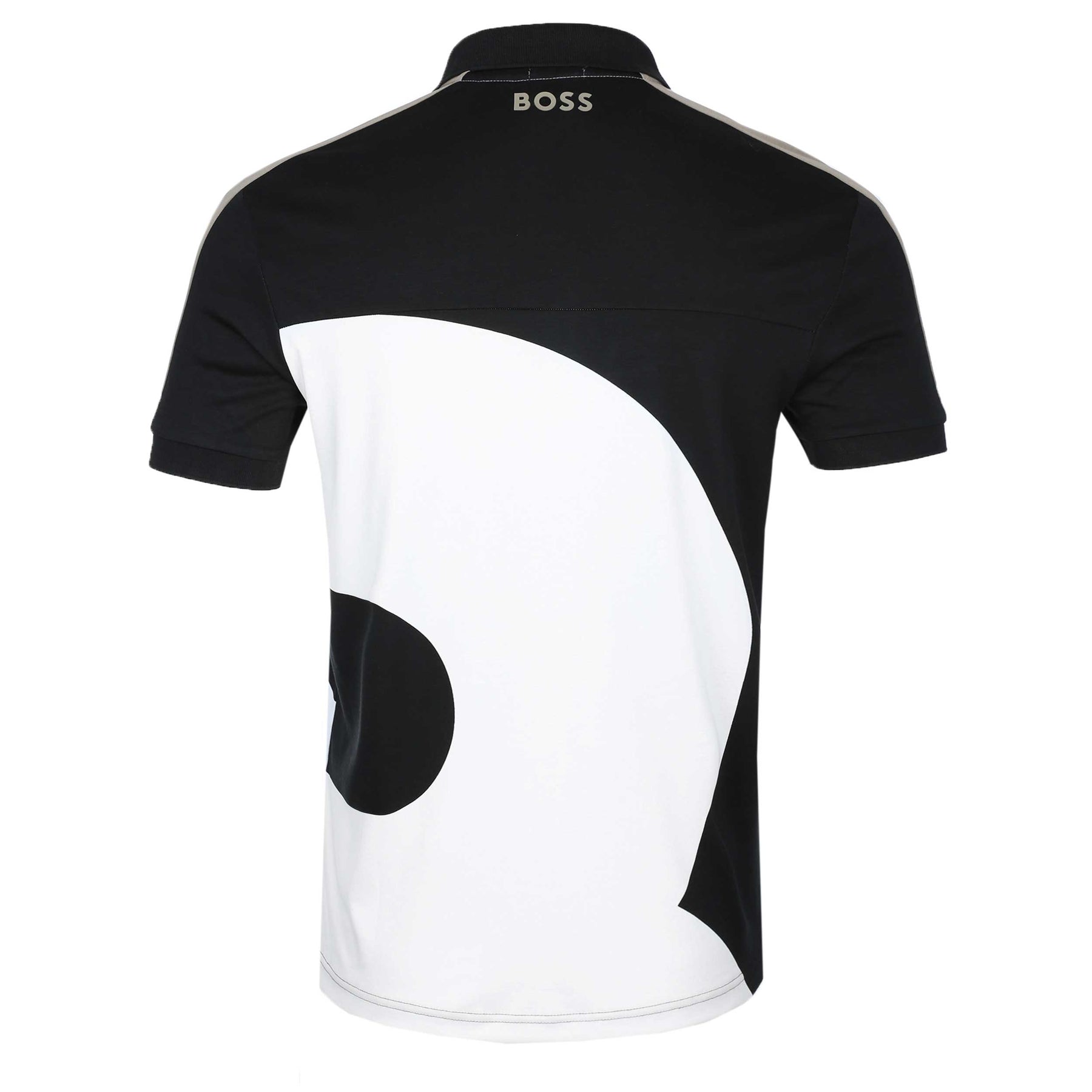 BOSS Paddy 8 Polo Shirt in Black & White. A classic polo shirt by BOSS. A 3 button fastening placket with short sleeves and polo style collar. Featuring an abstract BOSS pattern on the chest. Finished with the BOSS logo on the chest and back of the neck.