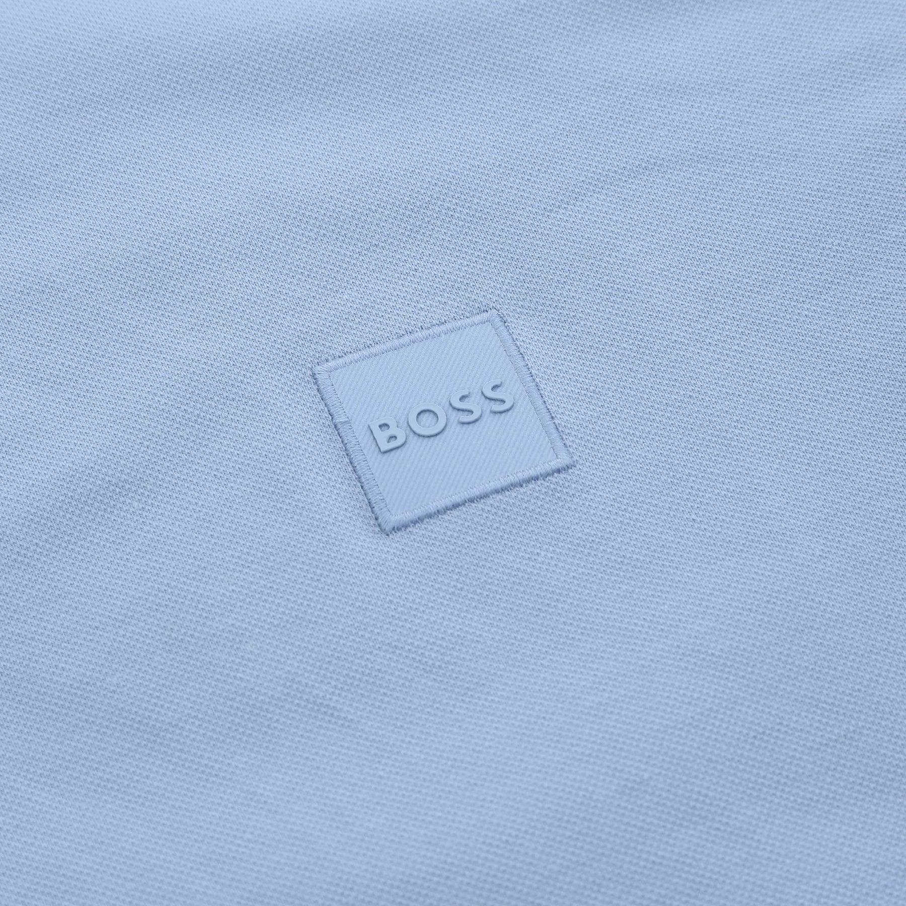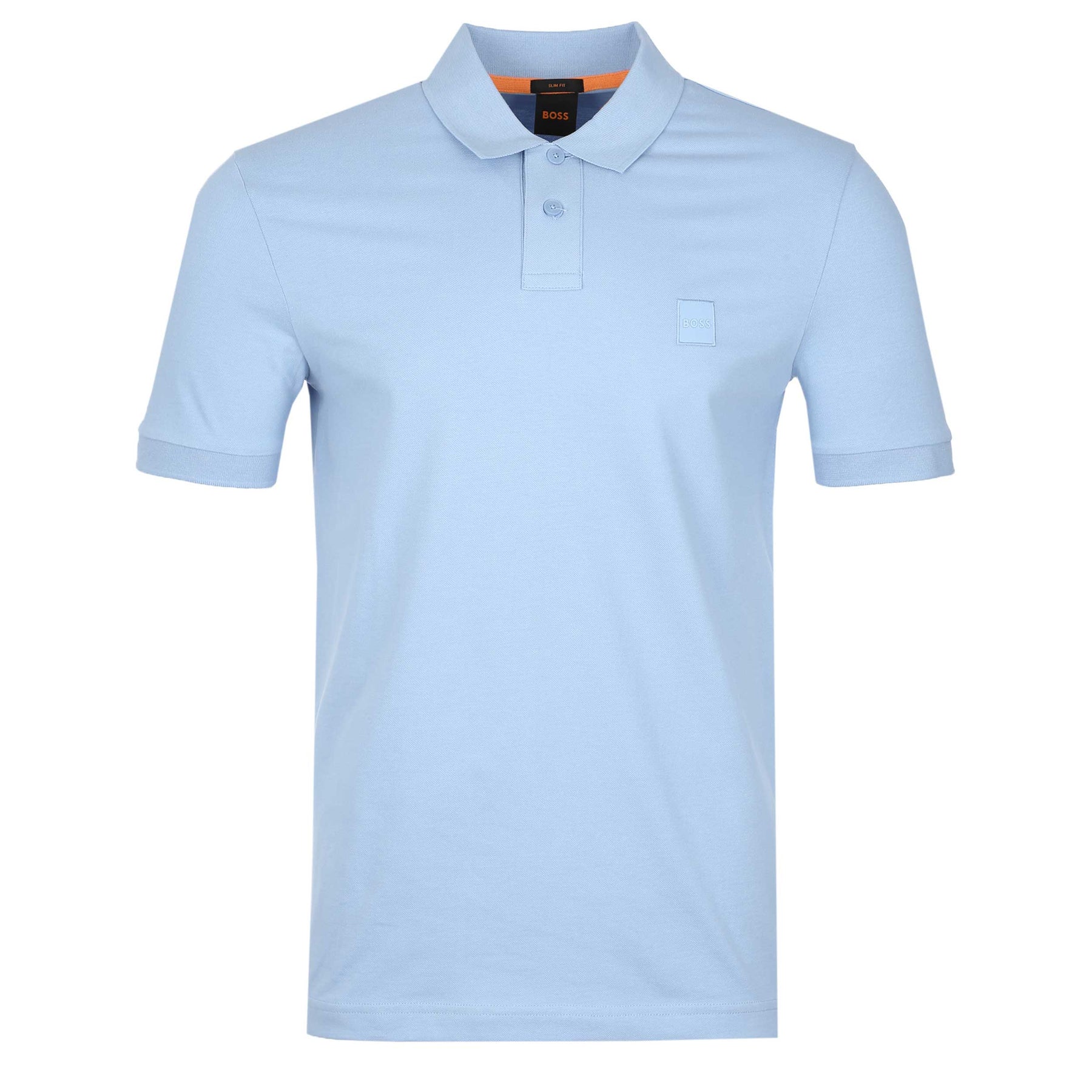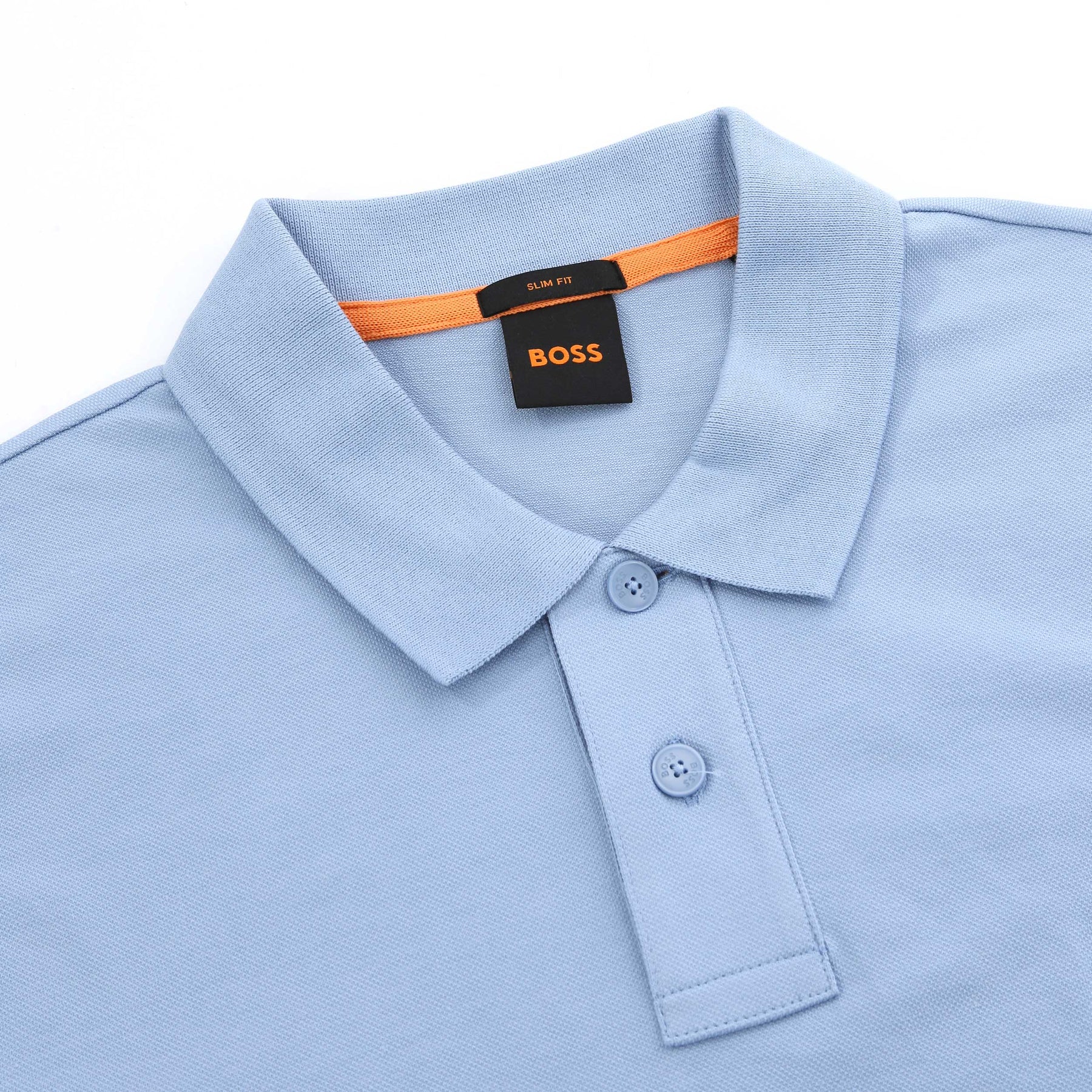 BOSS Passenger Polo Shirt in Open Blue. A slim fit Hugo Boss polo shirt with a Classic Polo collar. This short sleeve polo shirt arrives finished off with a 3 button placket. BOSS label logo to the chest. Ribbed collar and cuffs. Perfect Casual polo shirt to be teamed up with either jeans or sweat pants.