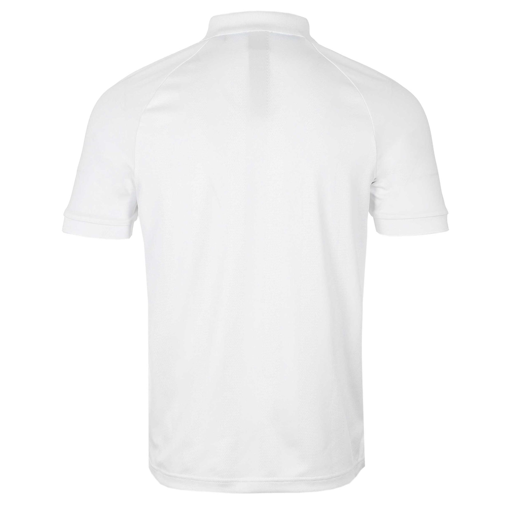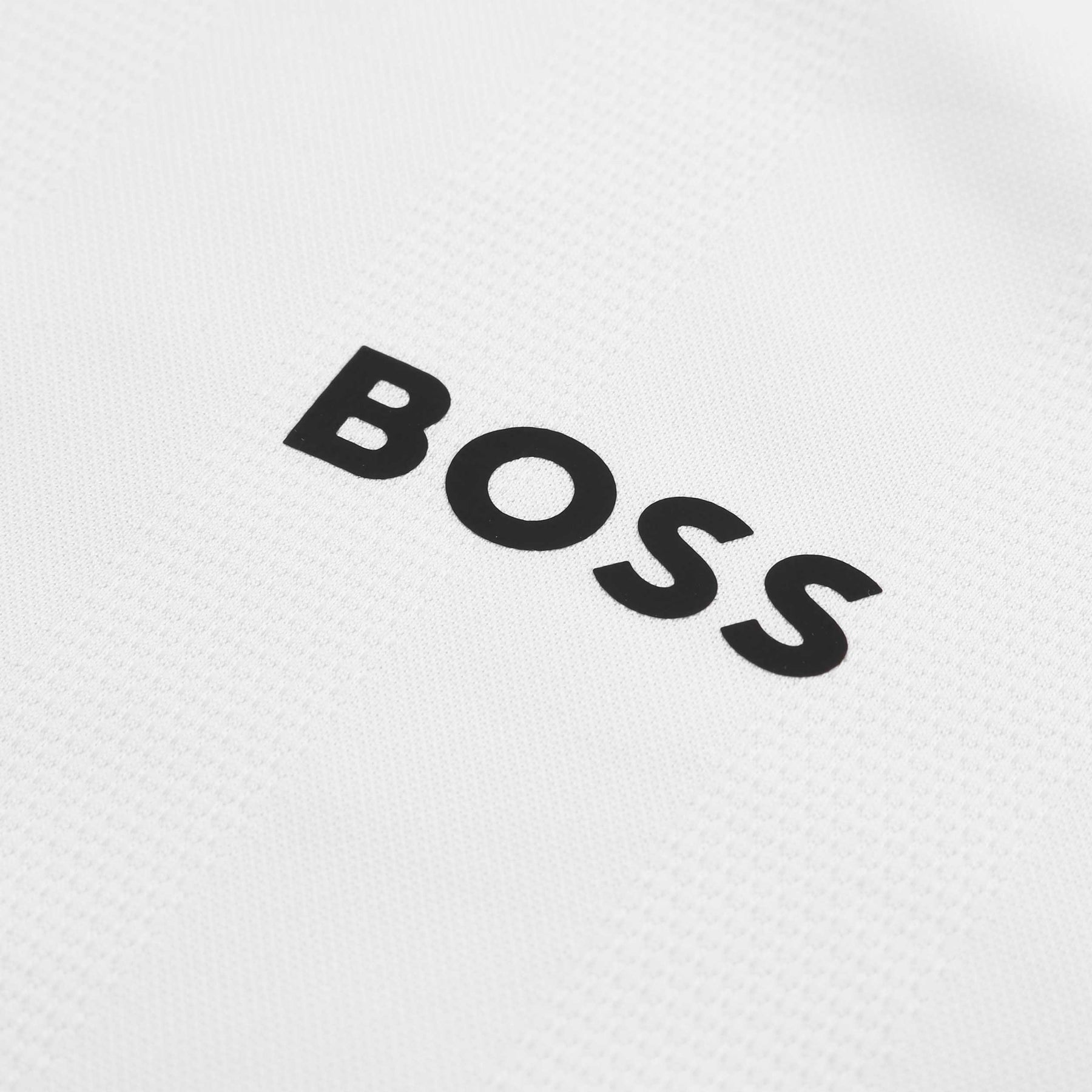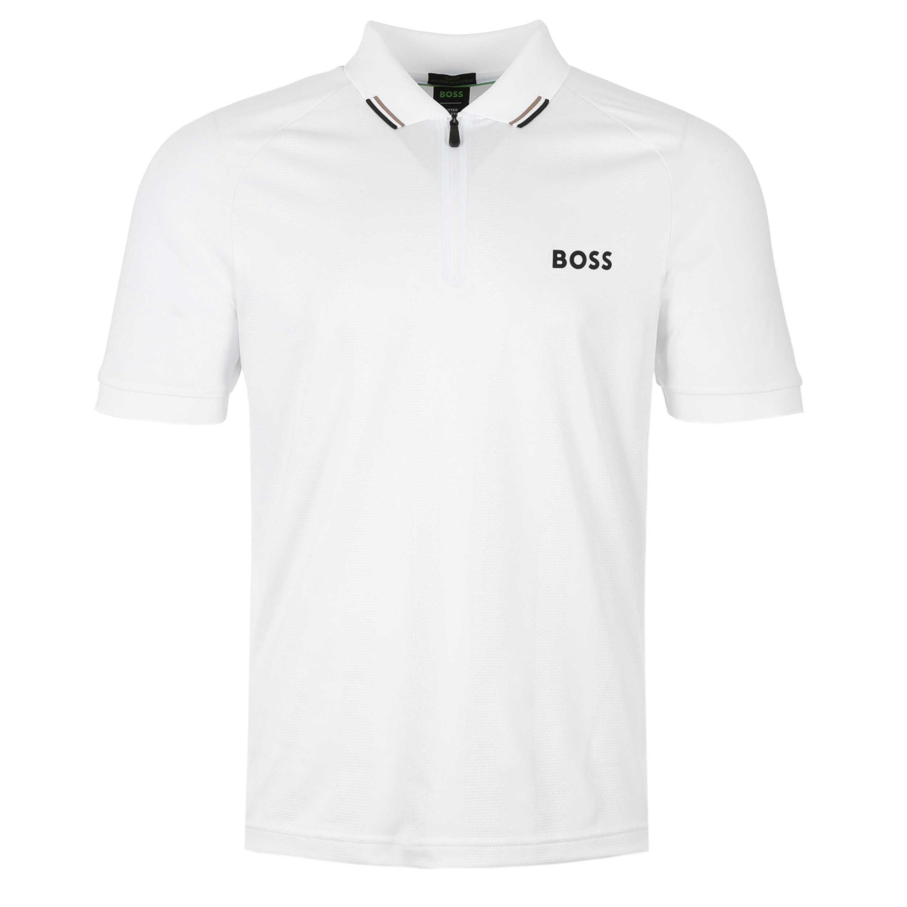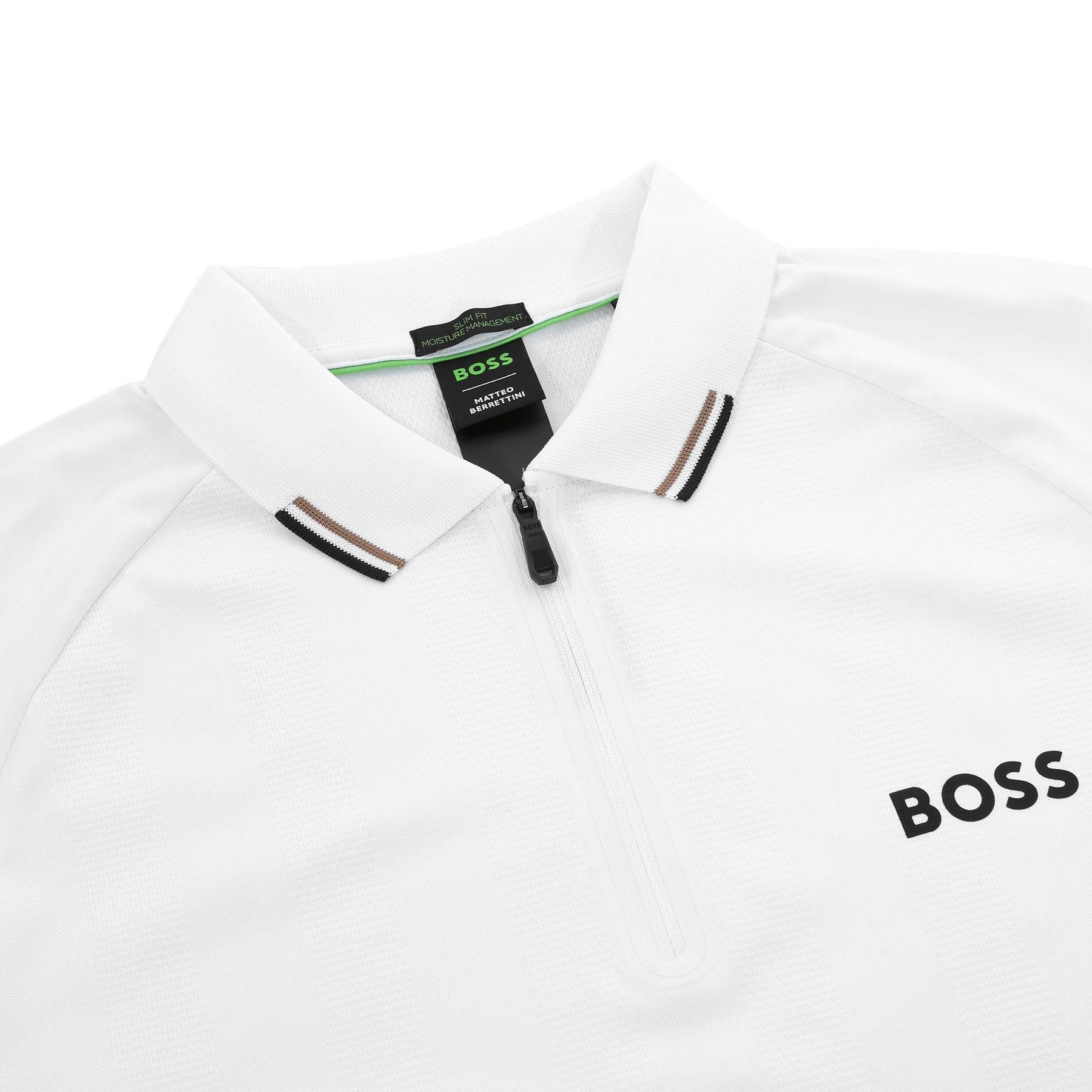BOSS Philix MB 3 Polo Shirt in White. A slim fit polo shirt by BOSS with stretch qualities. Polo shirt. A BOSS polo shirt from the Matteo Berrettini collection. Classic polo shirt collar. Short sleeves and a zip fastening placket. Tonal colour stripe pattern. Tri-colour trim to the collar tip. A solid colour polo shirt finished with a printed BOSS logo on the chest.