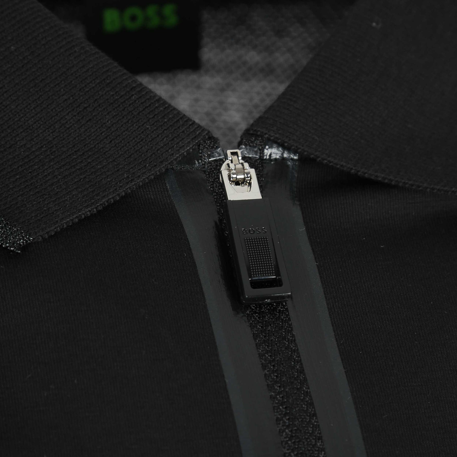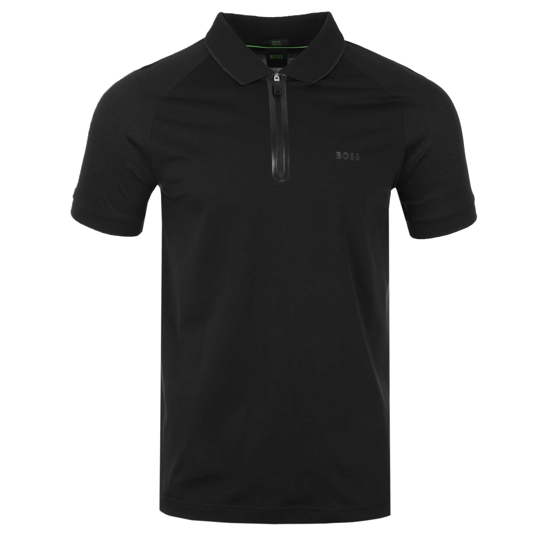 BOSS Philix Polo Shirt in Black. A classic polo shirt by BOSS. This slim fit polo shirt is made using fabric created for moisture management and easy wearing. The zip collar is detailed with tonal tape. Finished with a small printed BOSS logo on the chest.