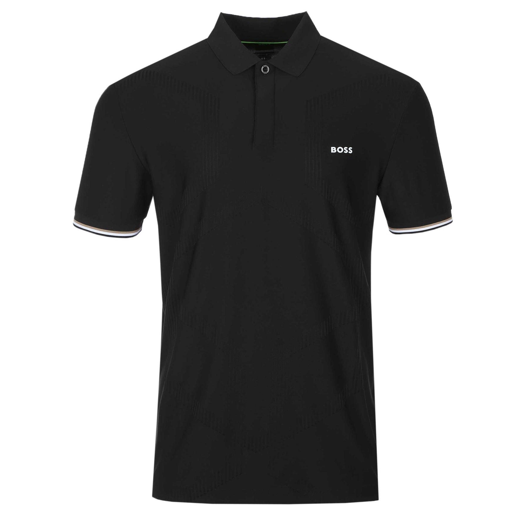 BOSS PL GOC Chip Hexa Polo Shirt in Black. Refine your casual rotation with the BOSS PL GOC Chip Hexa Polo Shirt in Black, a modern essential that balances sharp styling with everyday comfort. Cut to a sleek, athletic silhouette, this polo delivers a streamlined look that works just as well off-duty as it does dressed up. Crafted from a soft, breathable cotton-blend fabric, it offers all-day comfort while retaining a polished finish. The design is elevated by subtle raised hexagonal detailing and a contrasting BOSS logo and tri-colour cuff trim adding a contemporary edge without overpowering the clean aesthetic. Finished with a classic ribbed collar, it’s a versatile staple for year-round wear.