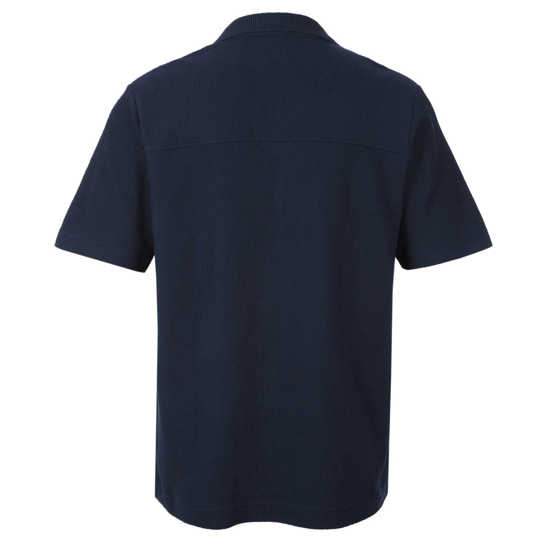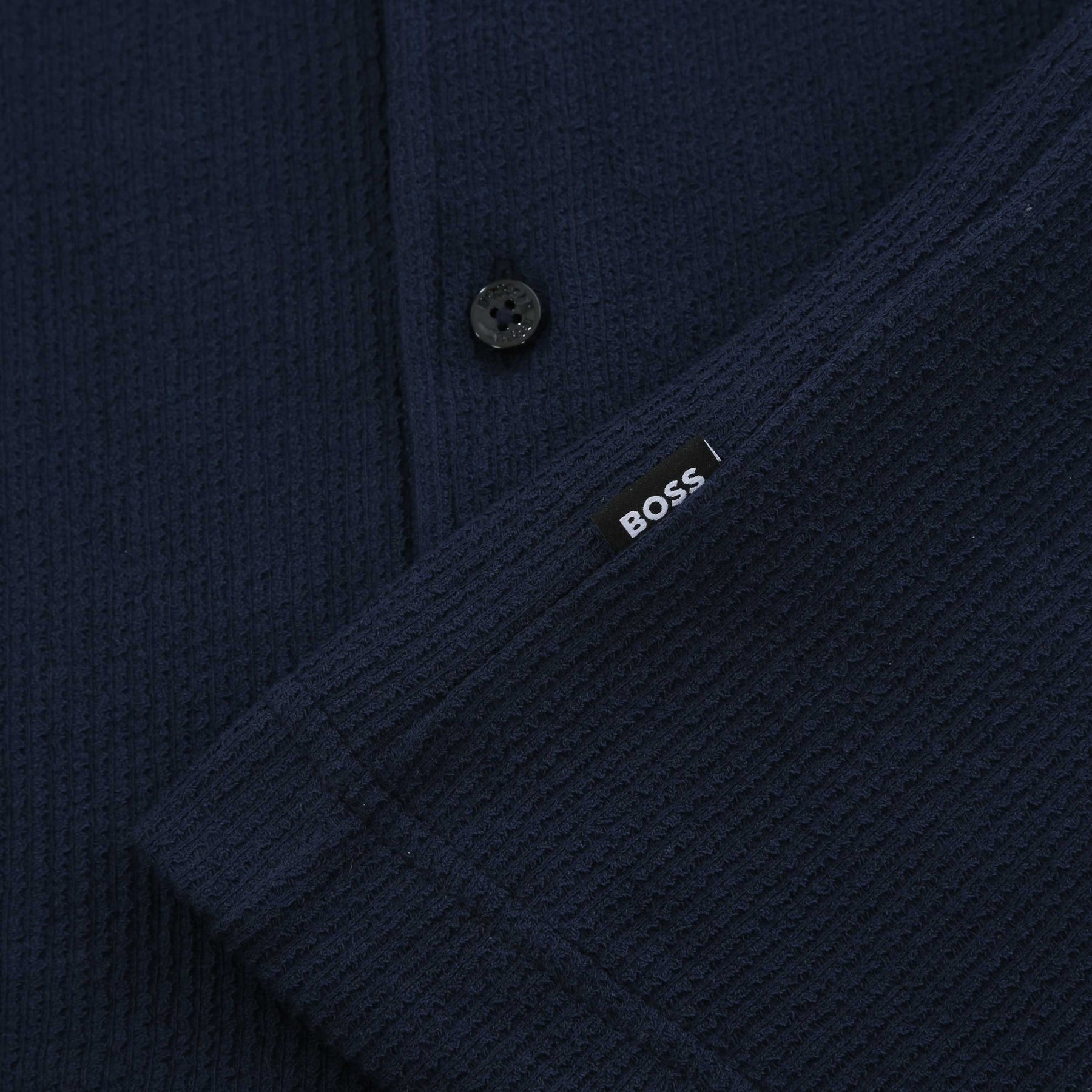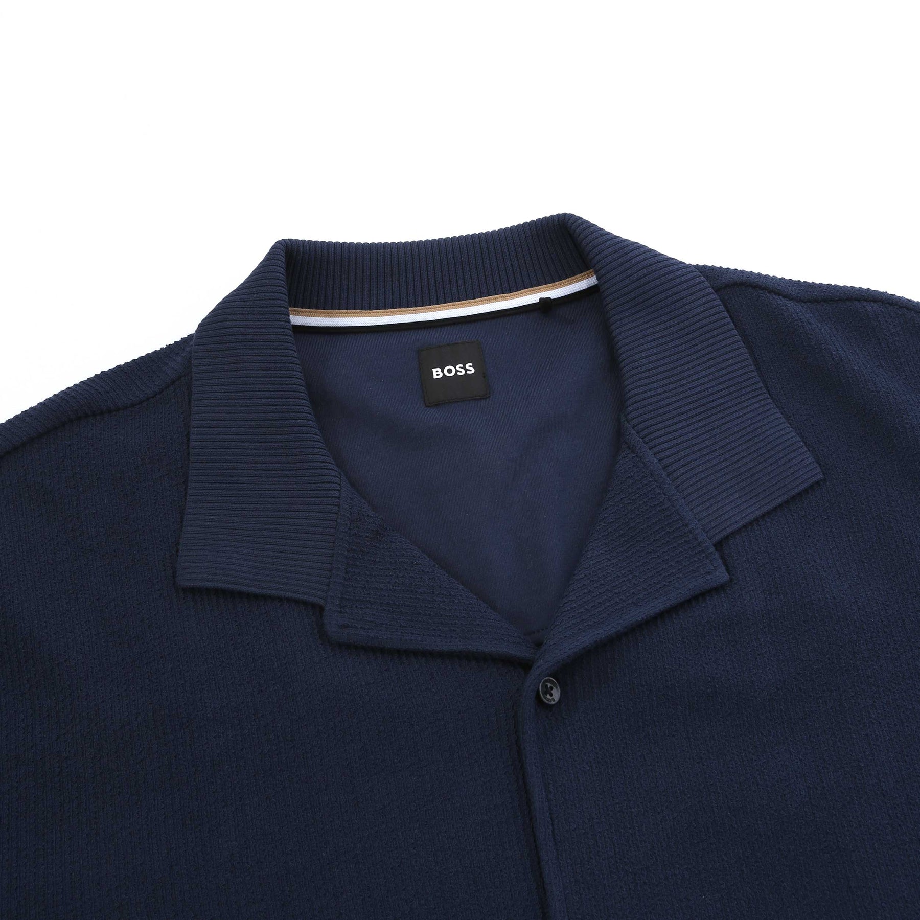 BOSS Powell 129 SS Shirt in Navy. A regular fit shirt with a relaxed cuban collar and full button placket. Short sleeves. Constructed from a boucle style fabric. The perfect shirt for those warmer days. Team up with jthe matching short.