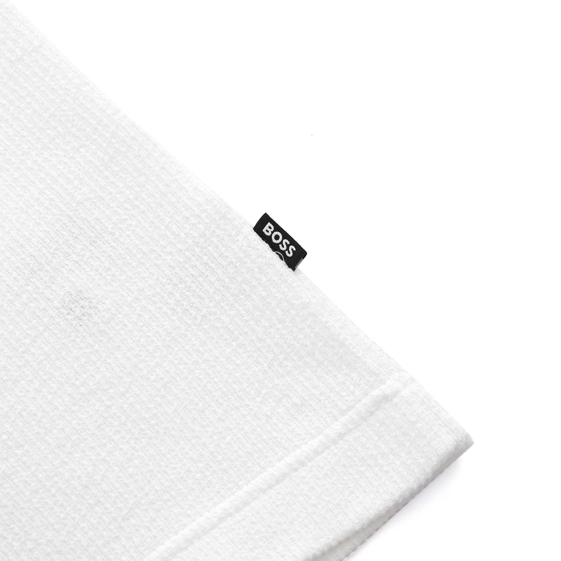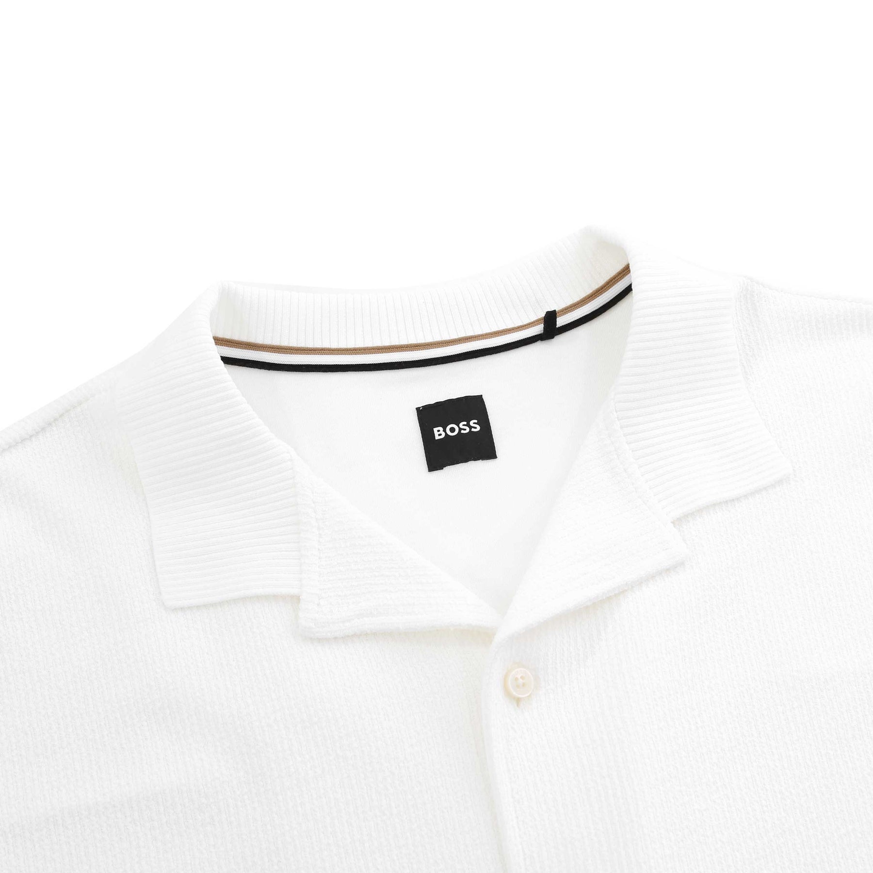 BOSS Powell 129 SS Shirt in White. A regular fit shirt with a relaxed cuban collar and full button placket. Short sleeves. Constructed from a boucle style fabric. The perfect shirt for those warmer days. Team up with jthe matching short.