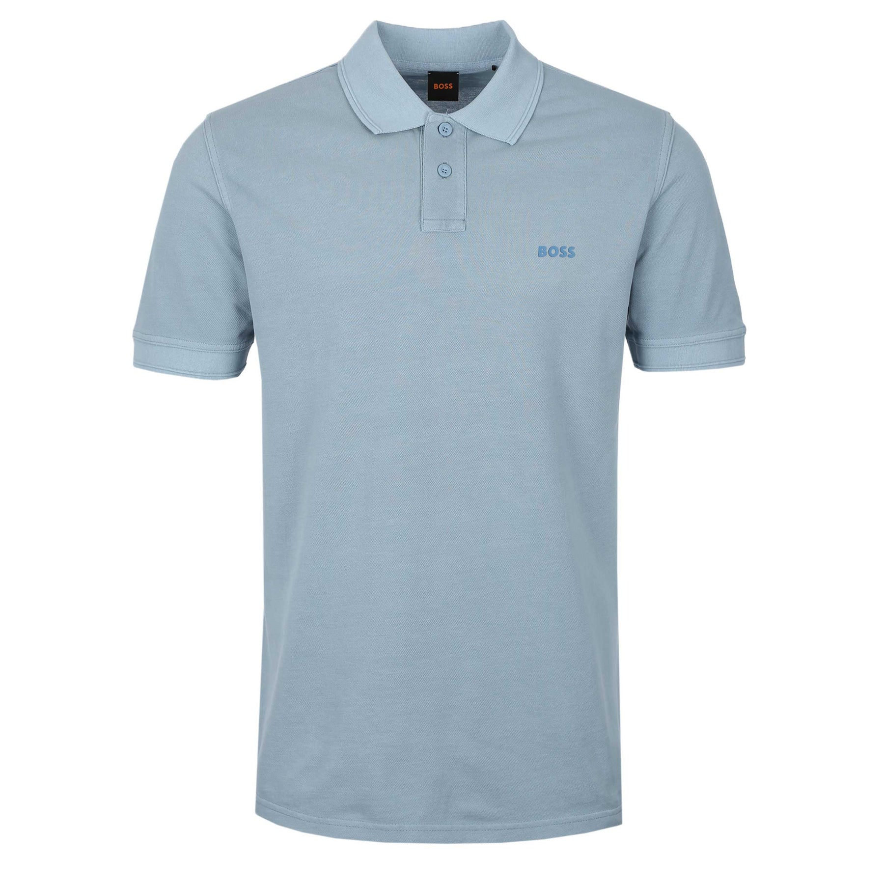 BOSS Prime Polo Shirt in Light Pastel Blue. A classic Hugo Boss polo shirt in a slim fit. A 2 button fastening placket. A BOSS polo shirt with flat knit collar and cuffs. Contrasting colour stripe detailing to the cuffs. Raised rubber logo to the left cuff.