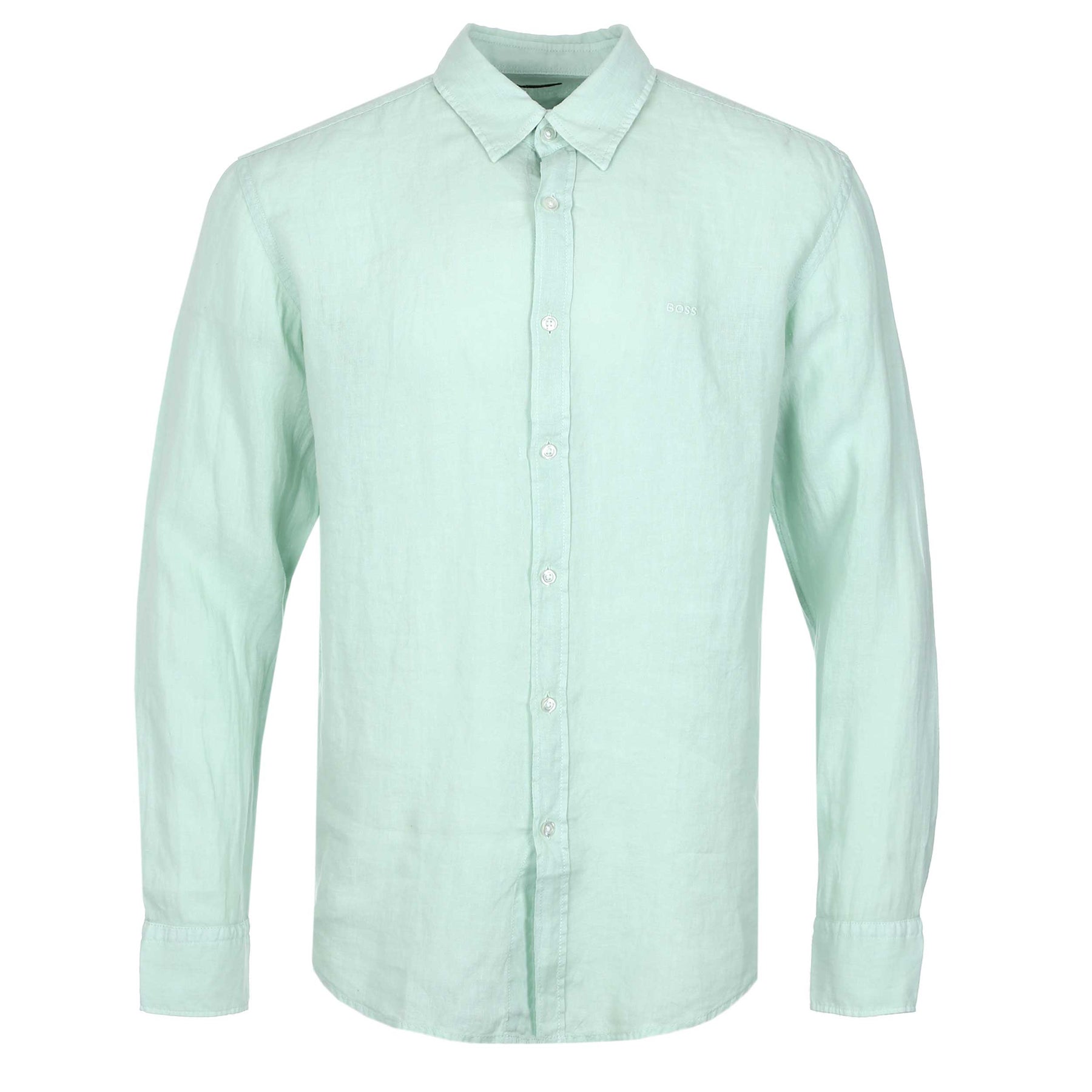BOSS Relegant 6 M Shirt in Turquoise Aqua. Long sleeve shirt by BOSS. This regular fitting shirt arrives with a soft pointed collar. A full button fastening shirt constructed from 100% linen. Square cuffs. Tonal embroidered BOSS logo to the chest. Finished with a BOSS logo tab.