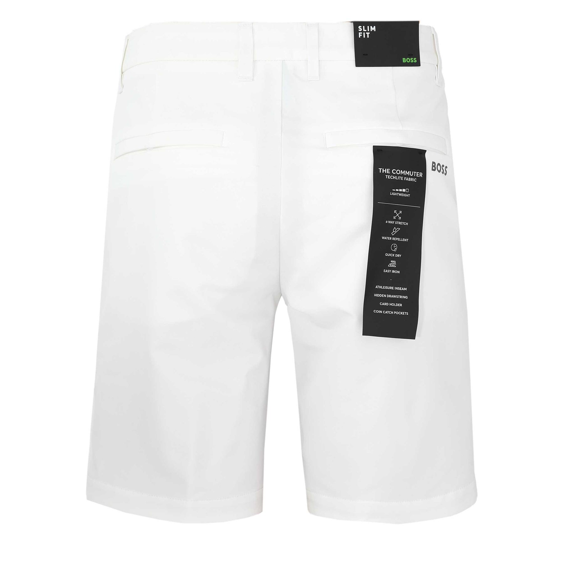 BOSS S Commuter 9 Short in White. A regular fit short by BOSS. This 4 way stretch short arrives in a plain design with a regular rise. Featuring a partially elasticated waistband for comfort and a button fastening. 2 side slash pockets and 2 seat pockets. Hidden drawstring tothe waistband. Can be teamed up with a t-shirt or shirt for those casual or smart occasions.