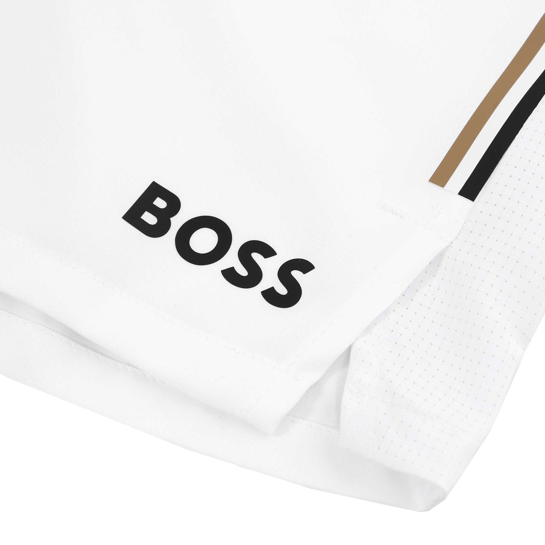 BOSS S Set 2 Short in White. Lightweight short by BOSS. Part of the BOSS x Matteo Berrettini capsule collection. Plain design short with 2 slash front pocket. Elasticated waistband with drawstring fastening. Tri-colour logo stripe to the side of the shorts. Side panel with subtle stripe design. Printed logo to the leg. Mesh panel design to the rear.