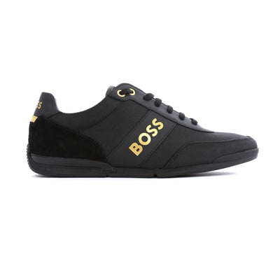 BOSS Saturn Lowp nylg Trainer in Black & Gold. A trainer by BOSS. These low profile Hugo Boss trainer arrive with a textile upper. 7 hole lace up design with branded lace loop holes. Suede leather heel panel. Boss branding to the side and printed to the heel. Fully lined. Ideal casual trainer built for comfort.