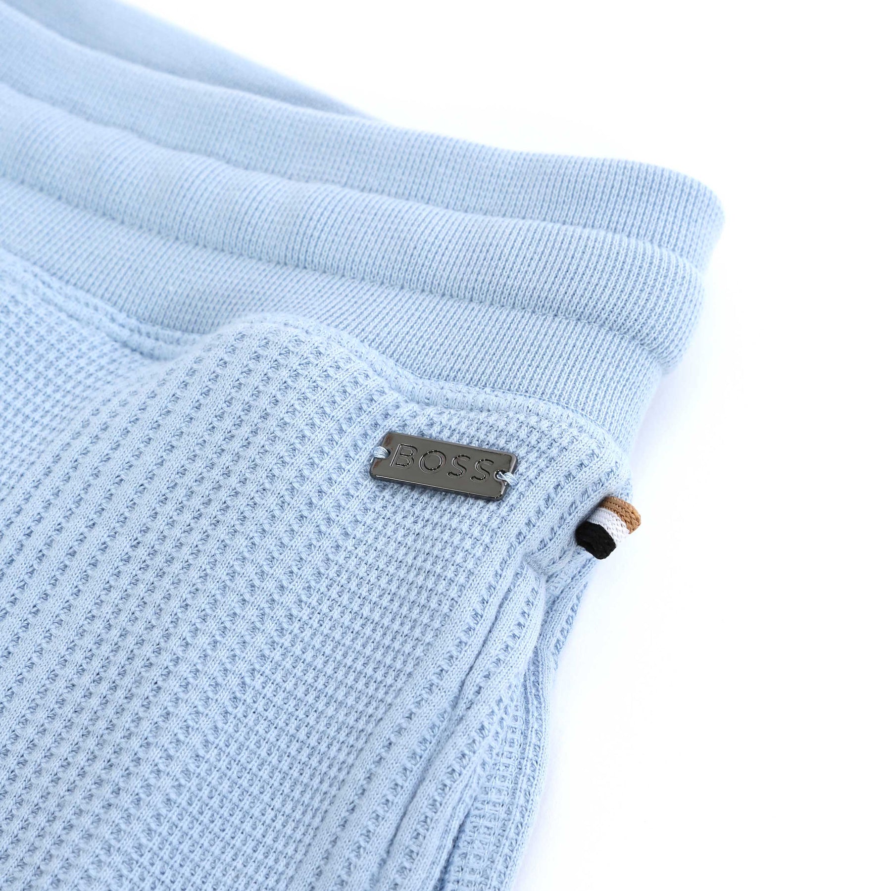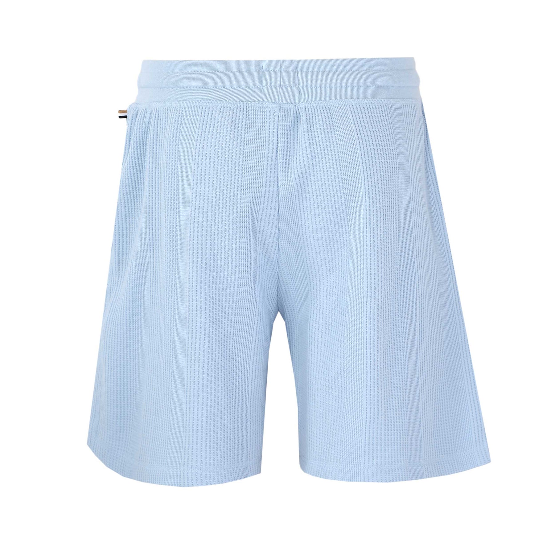 BOSS Structure Shorts Short in Light Pastel Blue. Sweat short by Hugo Boss. The sweat shorts are cut to a clean straight fit. They deliver a relaxed silhouette that’s easy to wear while maintaining a sharp, contemporary look. Crafted from a soft cotton-blend fabric with a waffle-textured structure. The textured knit enhances airflow while keeping the fabric soft and comfortable for warm-weather wear.