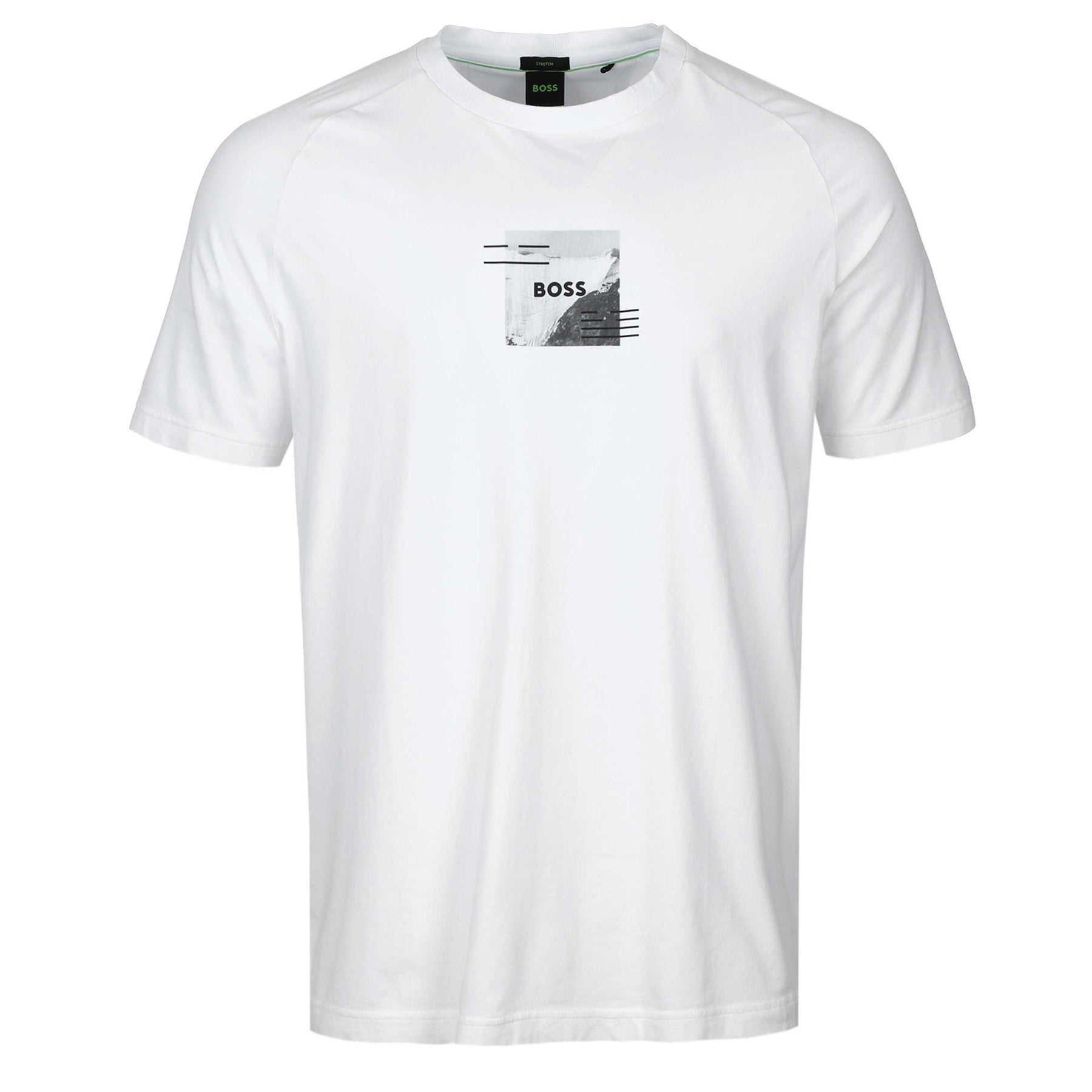 BOSS TTee Stripe Zone T Shirt in White. Regular fit t shirt by BOSS. Crafted from a soft, stretchy cotton blend, this relaxed-fit BOSS T-shirt delivers a fresh, modern look with bold photo prints and subtle reflective accents. Finished with a clean logo detail, it’s made using at least 60% cotton sourced from regenerative agriculture and contains over 60% better raw materials—bringing effortless style with a more responsible approach.