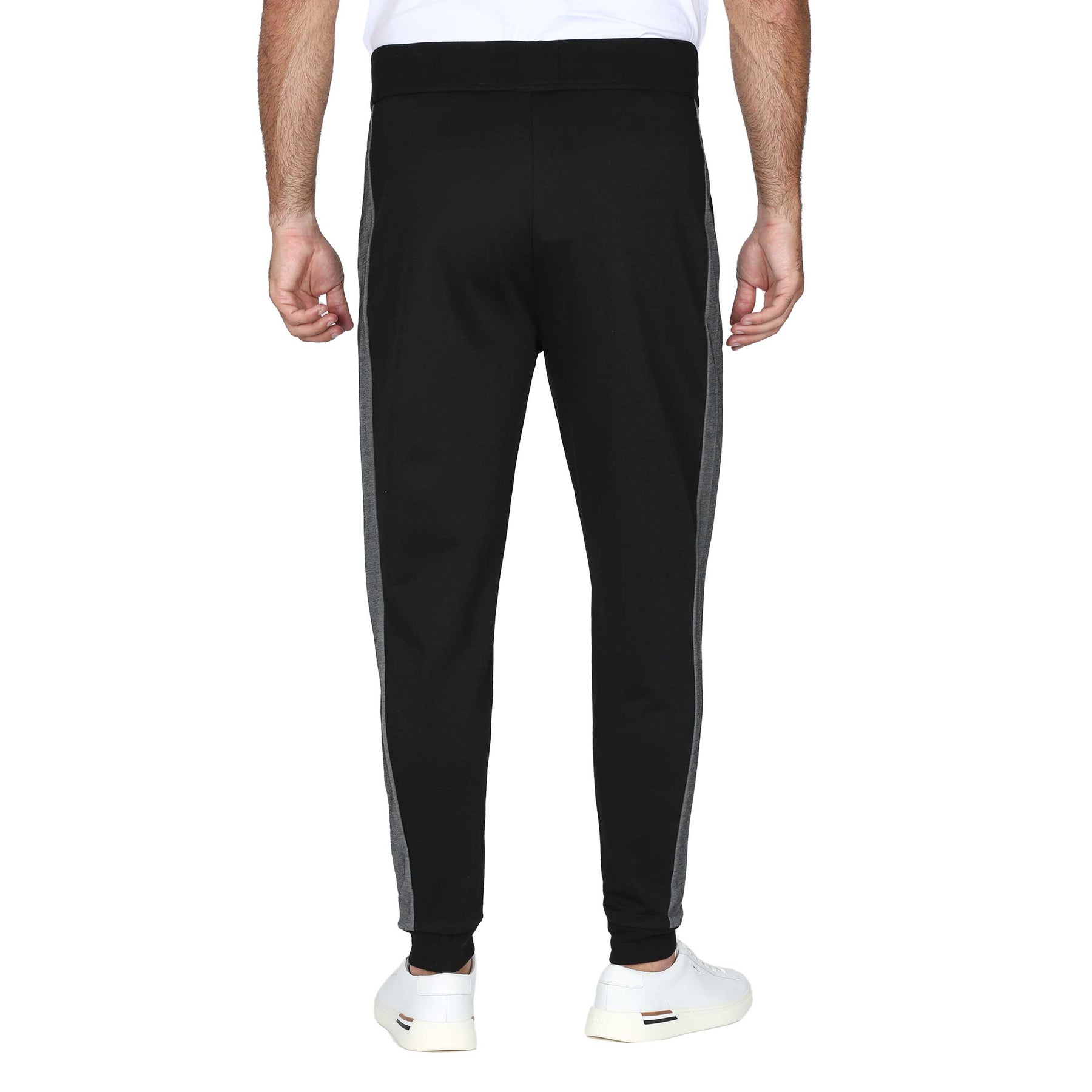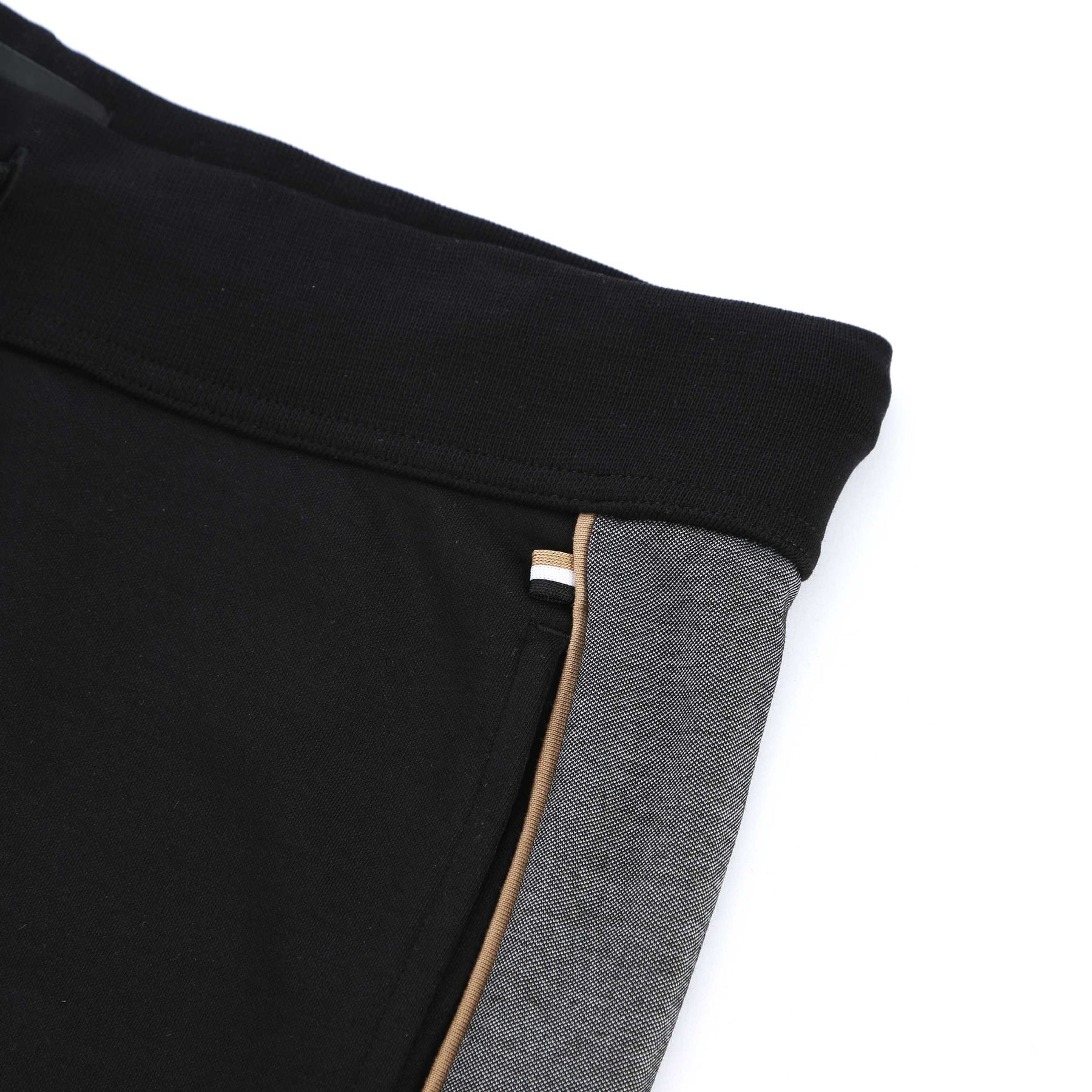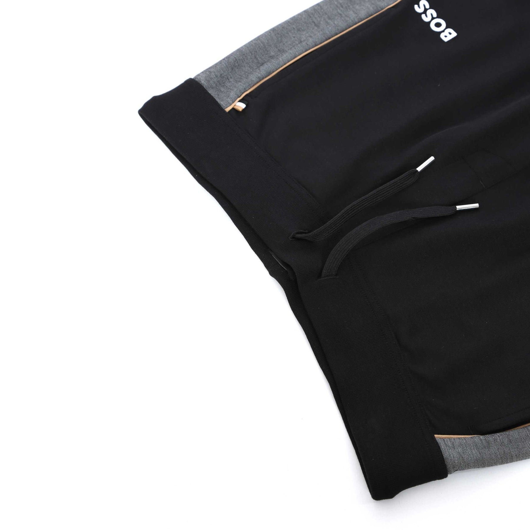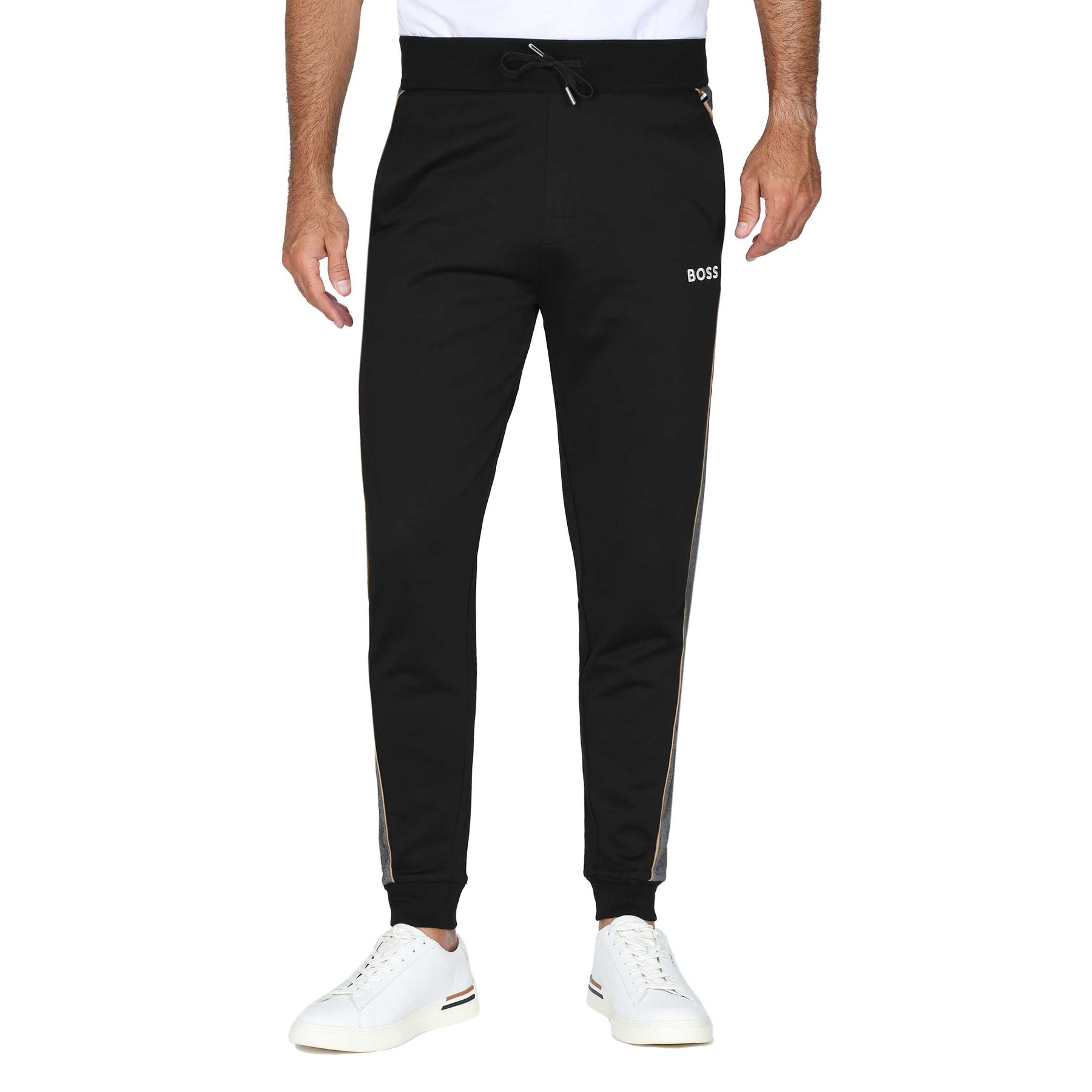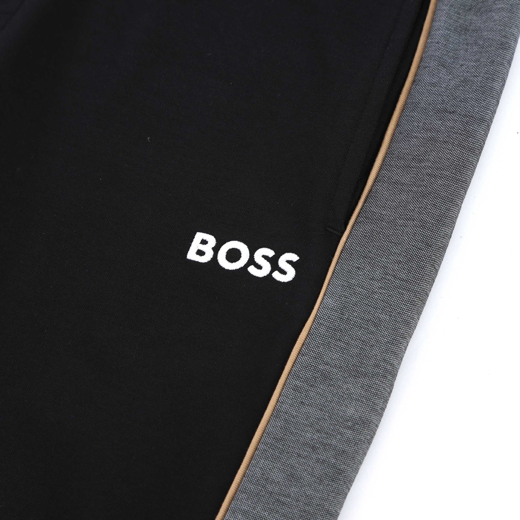 BOSS Tracksuit Pant Sweatpant in Black. A soft, comfy pair of Hugo Boss Sweatpants. Elasticated waistband with drawstring fastening. It features slash side pockets and a contrasting colour side panel and piping detail running down the side of the legs. Elasticated ankle cuffs. Embroidered BOSS logo to the left leg.