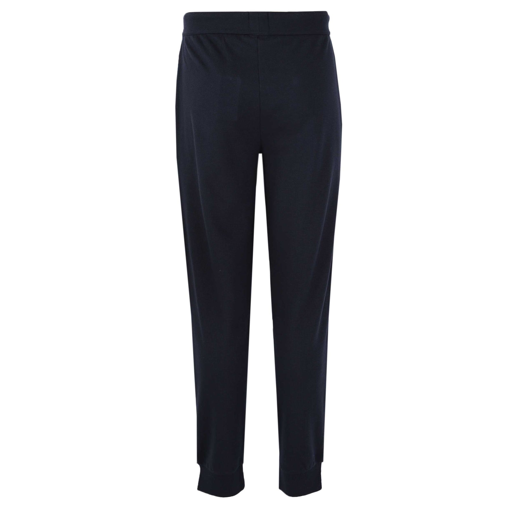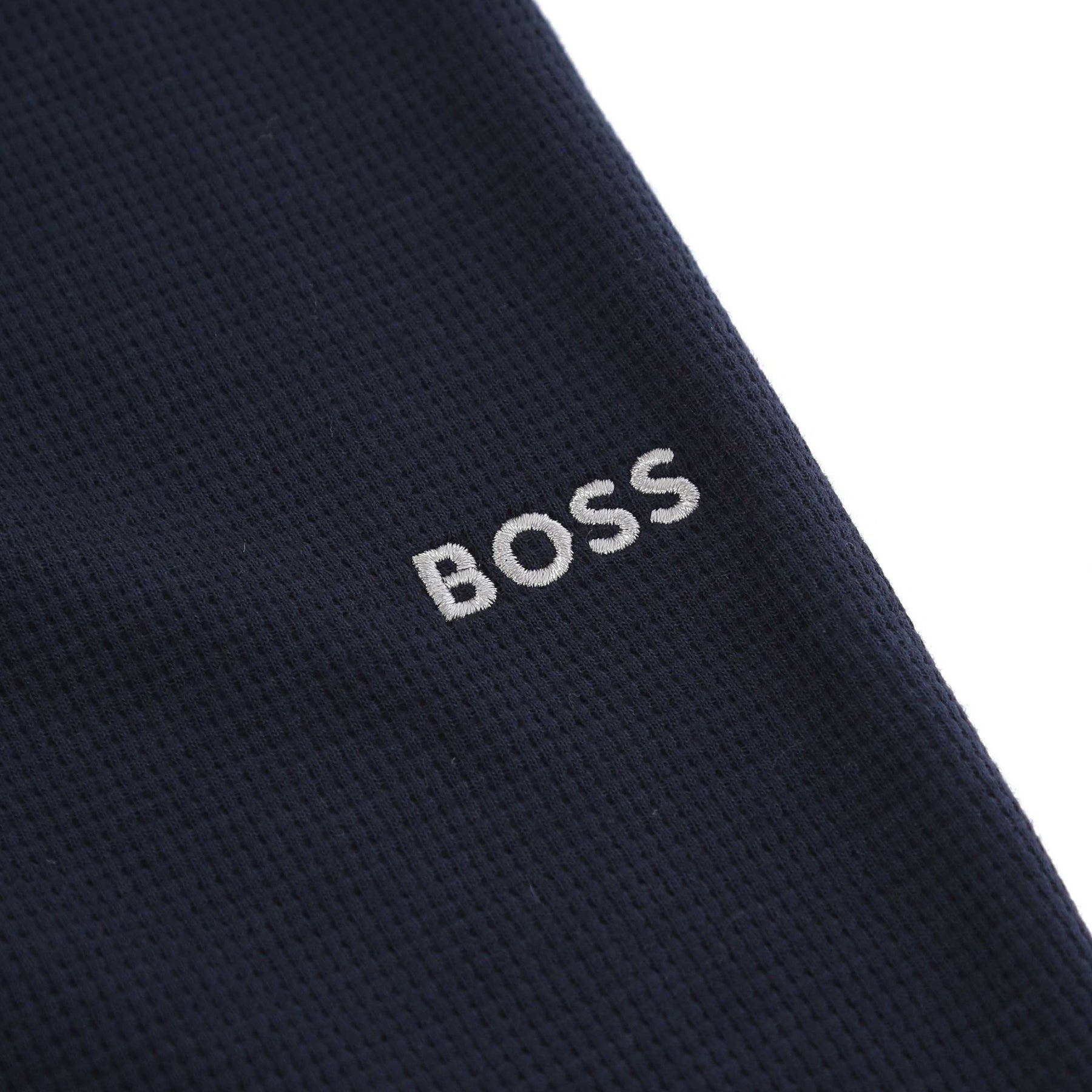 BOSS Waffle Pants Cuff in Dark Blue. Sweatpants by Hugo Boss. These regular fit sweatpants feature an elasticated waistband with a tri-colour logo tab. Two side pockets and an embroidered BOSS logo to the leg.