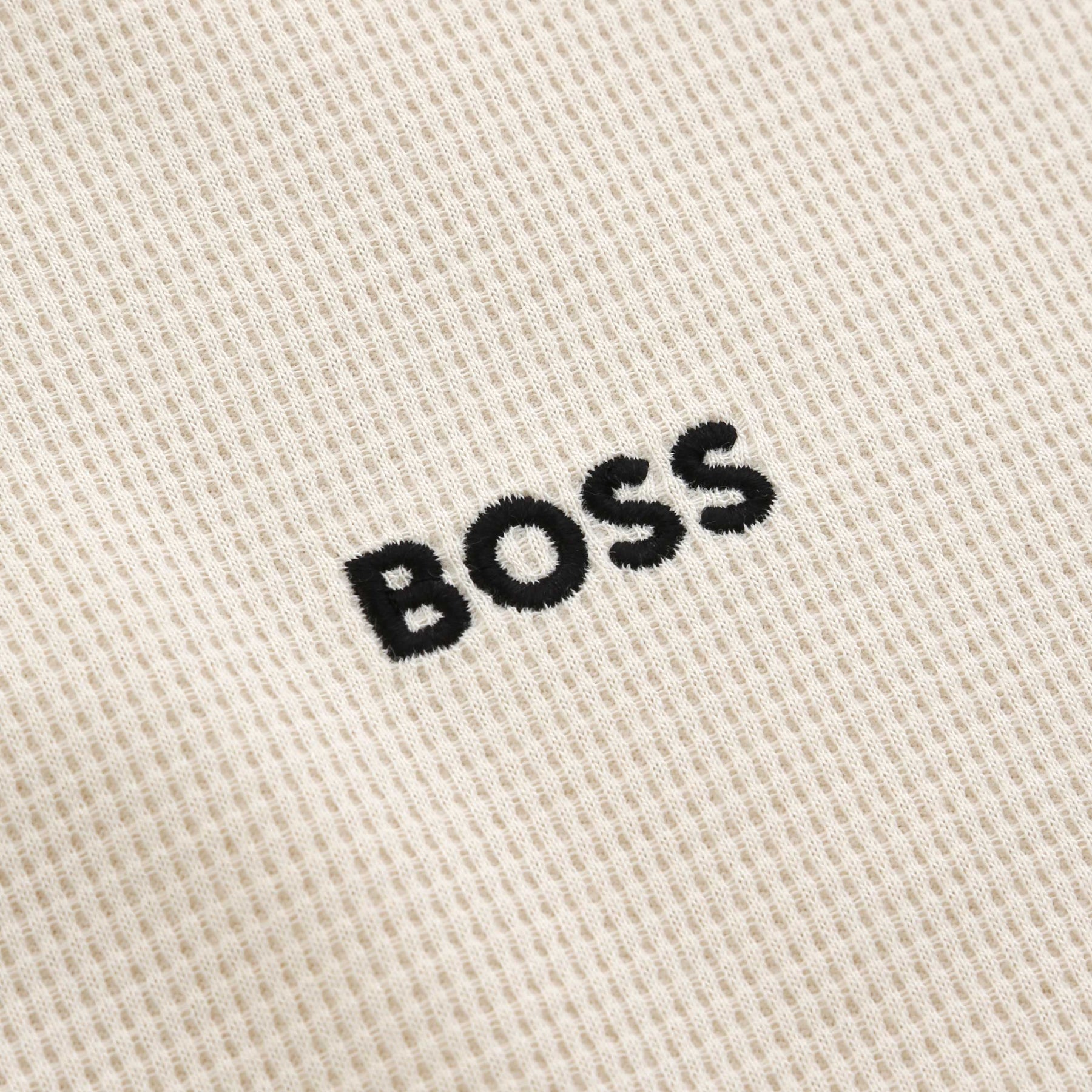 BOSS Waffle T-Shirt in Beige. A short sleeve, regular fit crew neck t-shirt by BOSS. This BOSS t-shirt has a solid colour t shirt with a textured waffle design. Embroidered BOSS logo to the chest.The perfect everyday t-shirt.