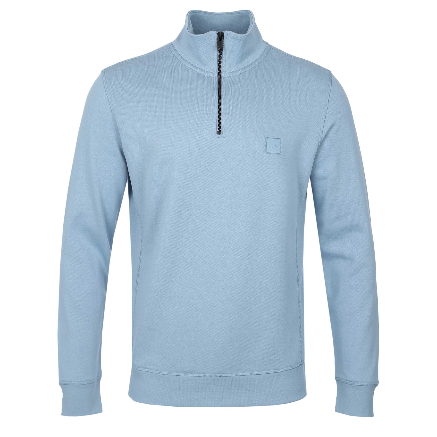 BOSS Zetrust Sweat Top in Light Pastel Blue. A dynamic sweat top by BOSS, cut to a regular fit. Featuring a quarter zip and BOSS branding on the chest. Cuffed at the sleeves and hem. Perfect for when you want style and comfort.