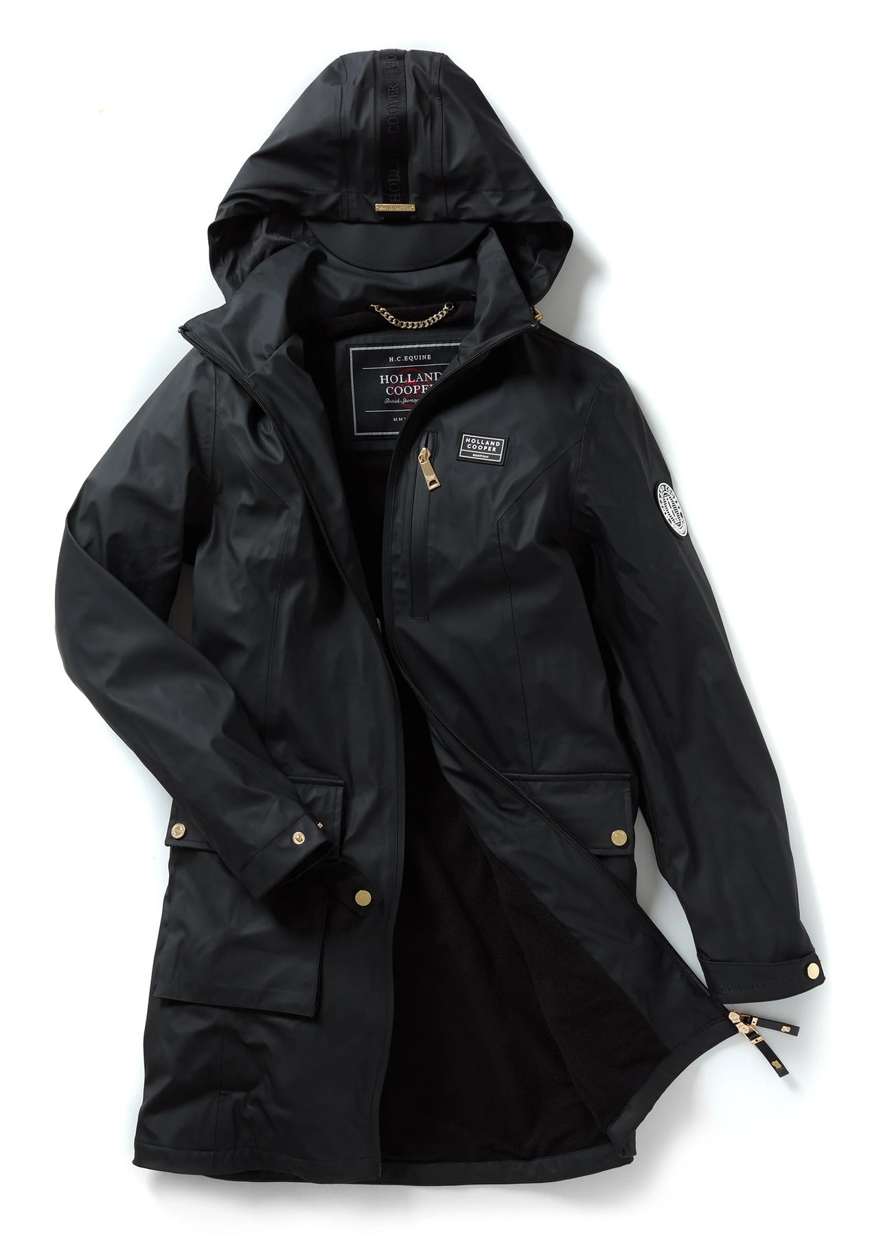 Holland Cooper Brecon Rain Coat in Black. A waterproof jacket by Holland Cooper designed to protect from all weathers. Featuring a removable and adjustable hood, 100% waterproof fabric and a lightweight fleece lining. Finished with storm cuffs with thumb loops to keep you dry during all activities.