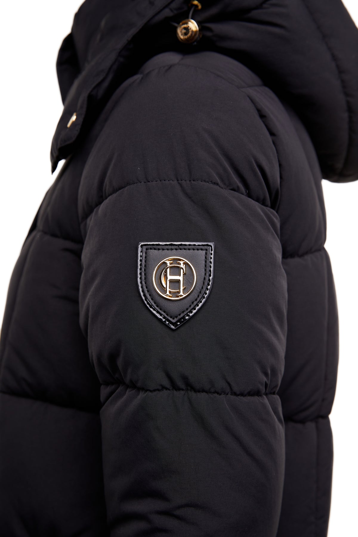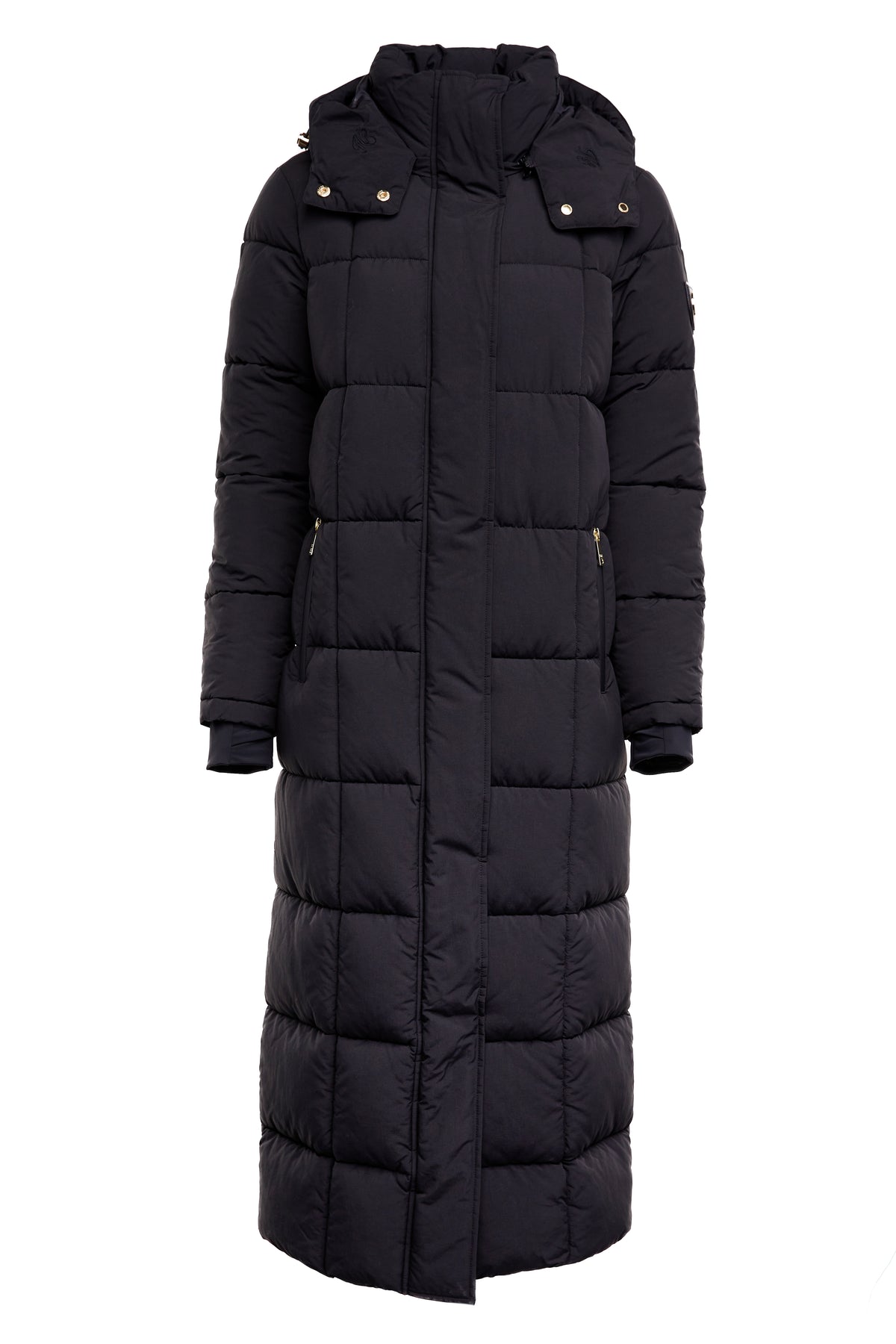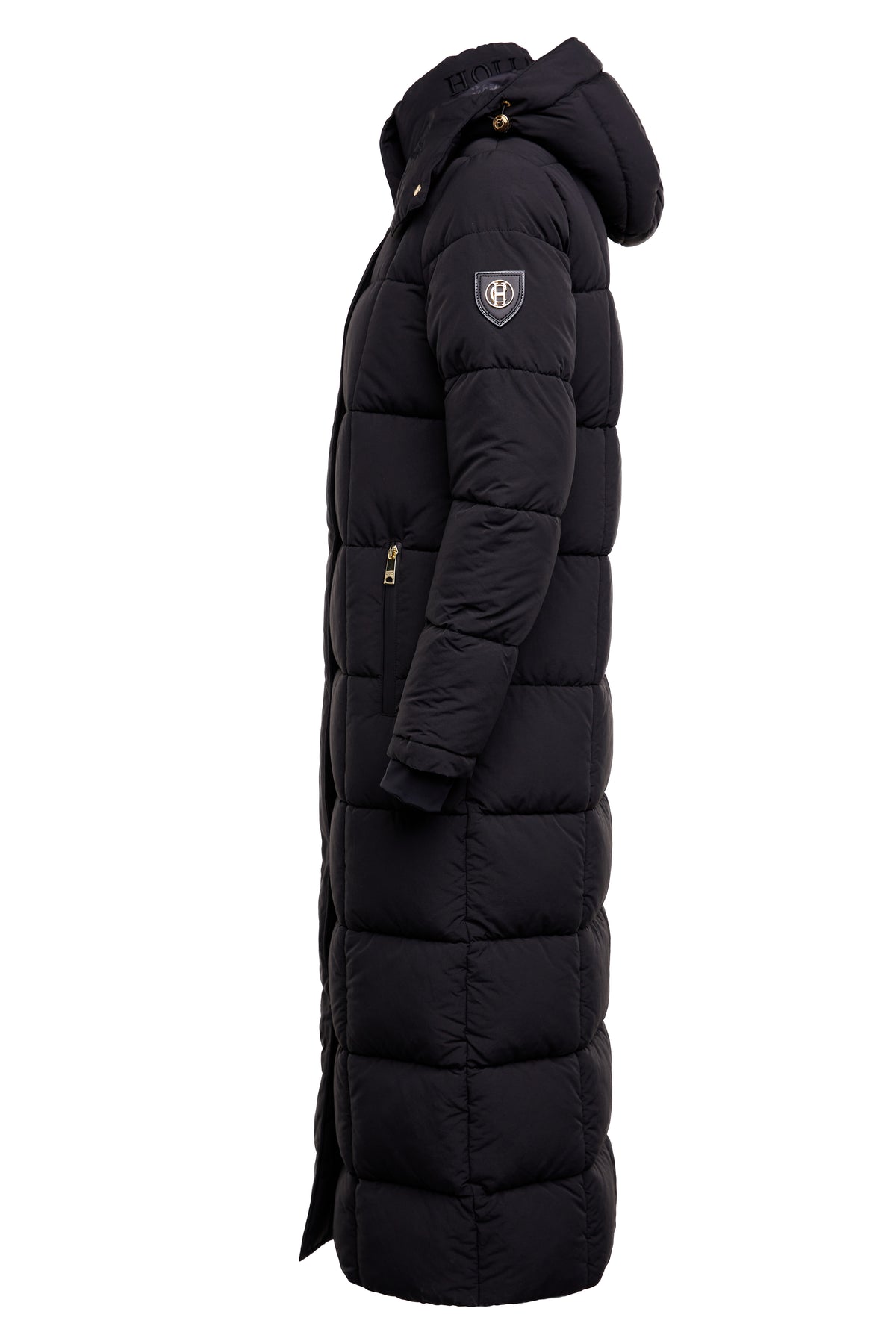 Holland Cooper Carrington Longline Coat in Black. A classic jacket by Holland Cooper. This longline jacket is designed with an oversized and relaxed fit. It has storm cuffed sleeves and a quilted body to ensure warmth. Thmb holes design to the storm cuffs. Internal carry straps, waterproof zips and a zip fastening. Detailed with Holland Cooper branding. Detachable drawstring hood. Stand collar with tonal logo to the rear of the neck.