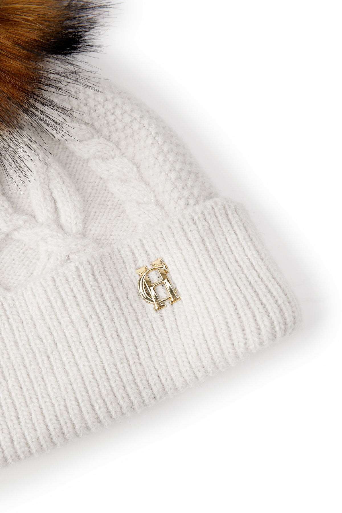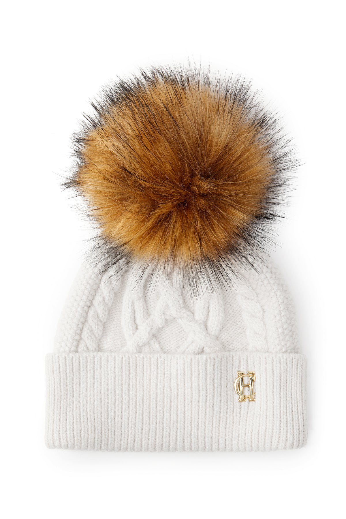 Holland Cooper Cortina Ladies Bobble Hat in Caramel. Bobble hat by Holland Cooper in a cable knit design. The turnover features a metal Holland Cooper crest logo tab. Faux fur Pom Pom is detachable via a metal popper. Perfect for those cold winter walks!