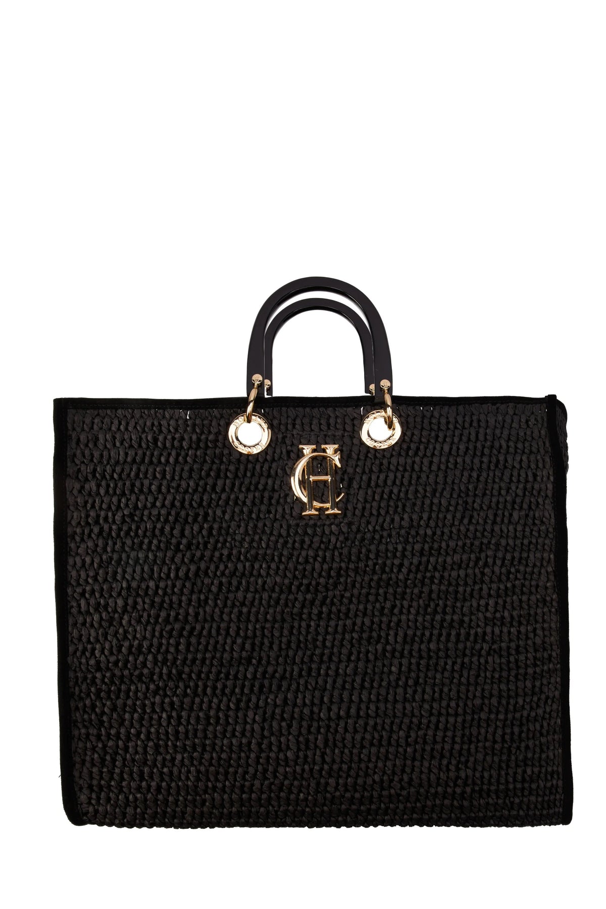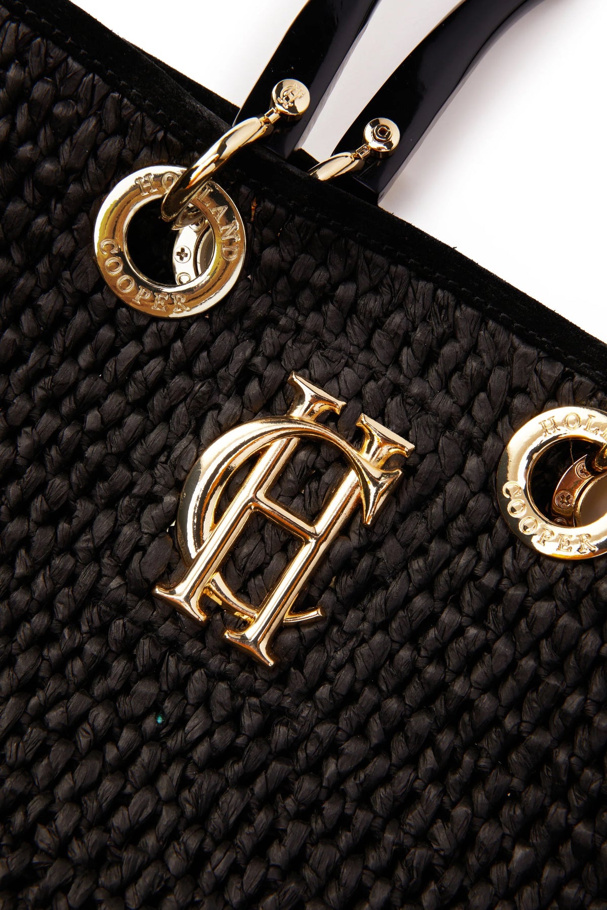 Holland Cooper Riviera Tote Bag in Black. Tote bag by Holland Cooper. Made from a natural raffia and trimmed with leather for binding. Top carry handles in a tonal colour. Detailing with the Holland Cooper gold hardware to the front. Zip pocket to the inside.